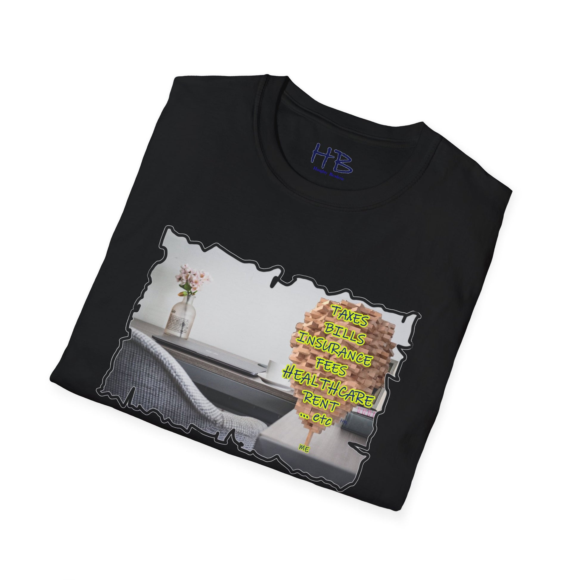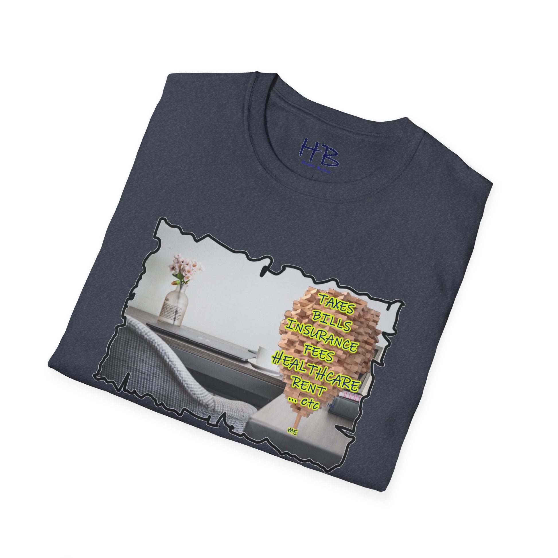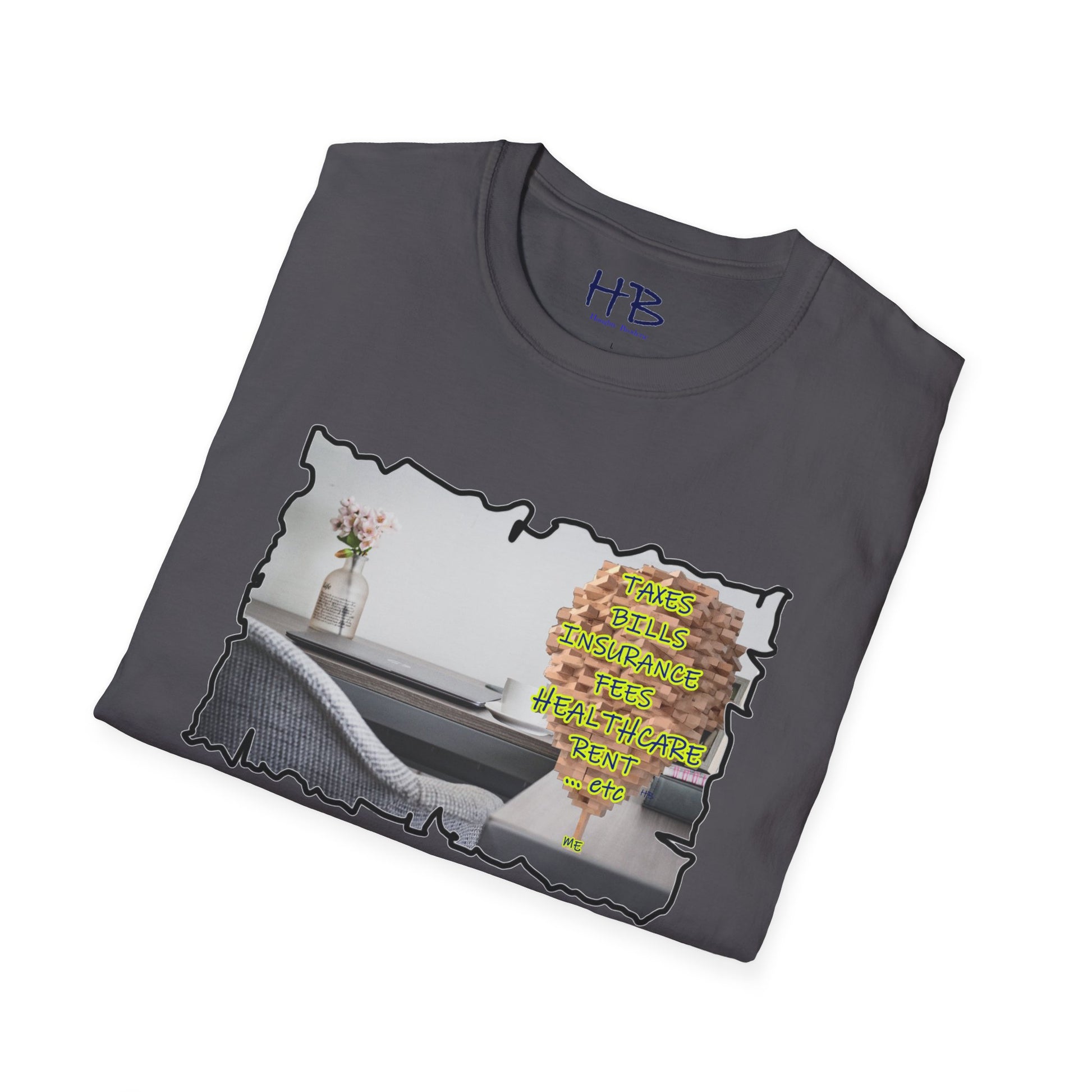 Choose to wear more than just a tee shirt; wear a powerful symbol that represents the triumph of the human spirit. Embrace the journey, celebrate your resilience, and inspire others with our extraordinary tee shirt featuring the image of a desk with a laptop, coffee mug, flowers, books, a picture of the wife, and a colossal Jenga tower titled "Me." Join the movement of unity, empathy, and triumph today.