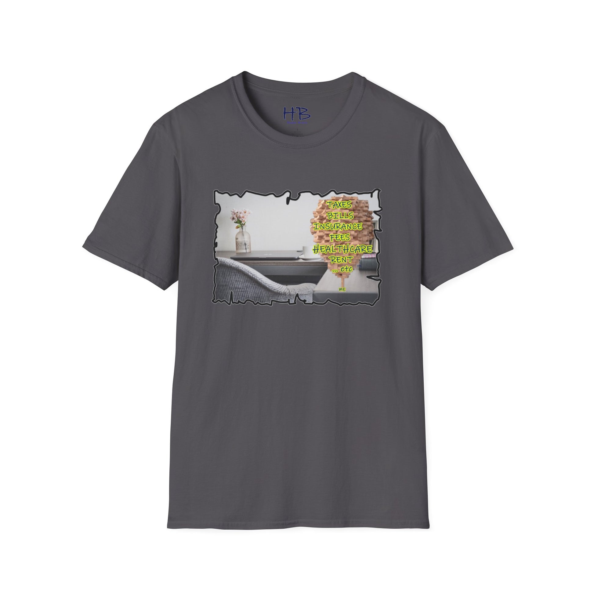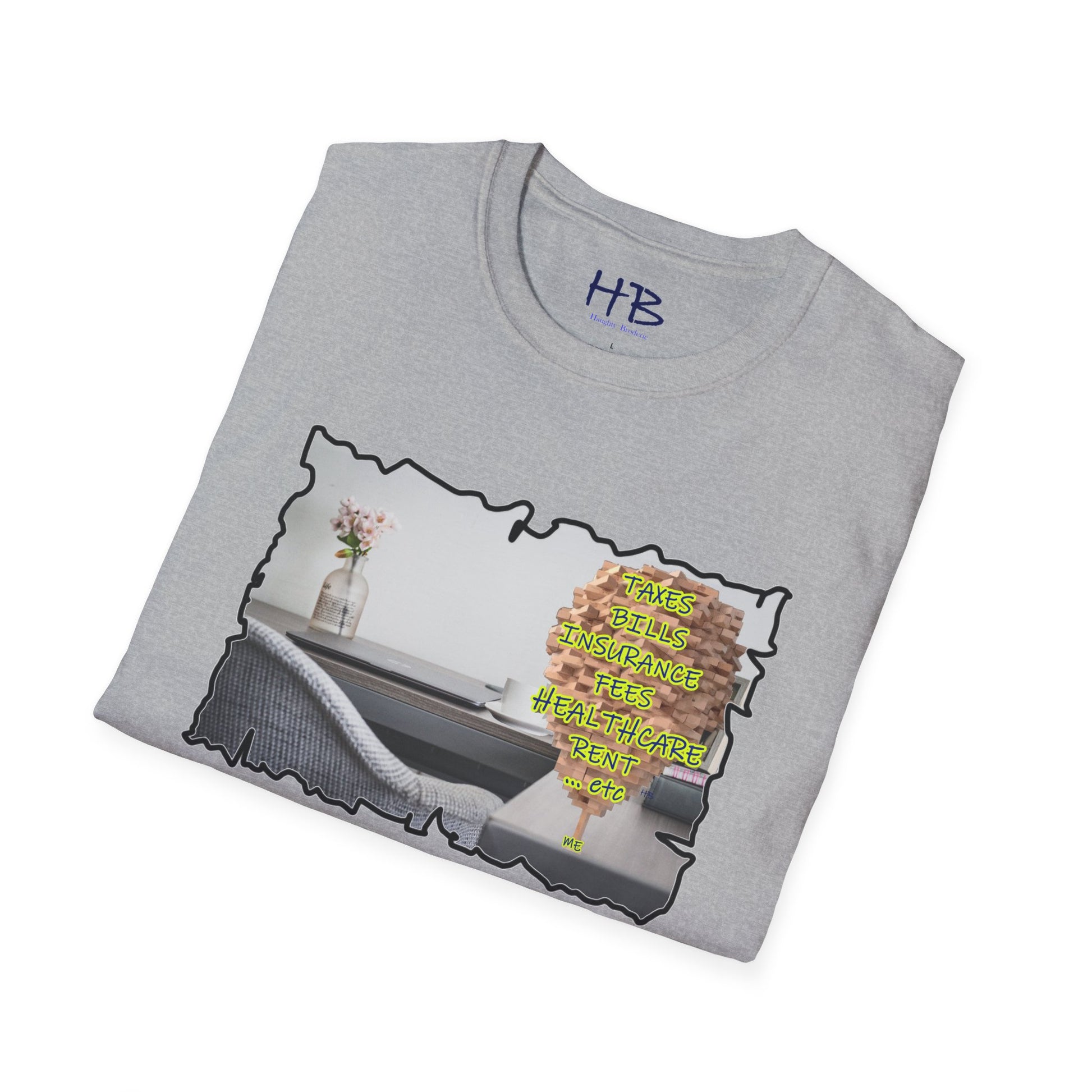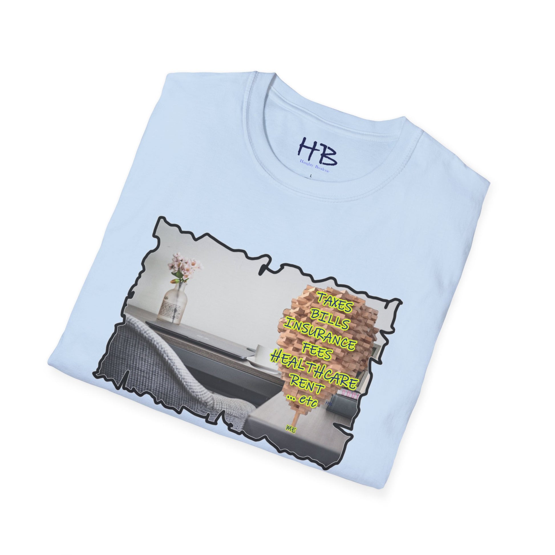 Choose to wear more than just a tee shirt; wear a powerful symbol that represents the triumph of the human spirit. Embrace the journey, celebrate your resilience, and inspire others with our extraordinary tee shirt featuring the image of a desk with a laptop, coffee mug, flowers, books, a picture of the wife, and a colossal Jenga tower titled "Me." Join the movement of unity, empathy, and triumph today.