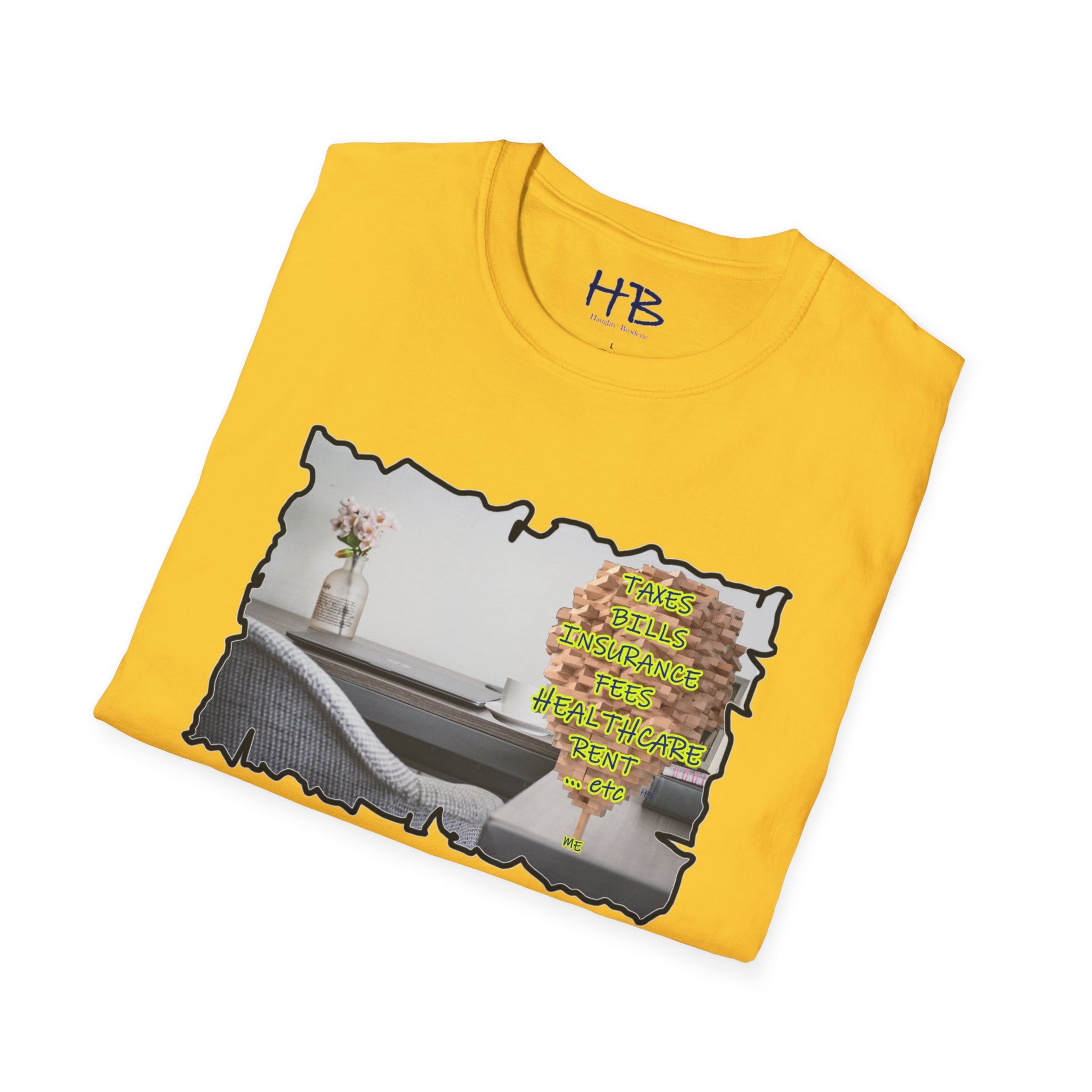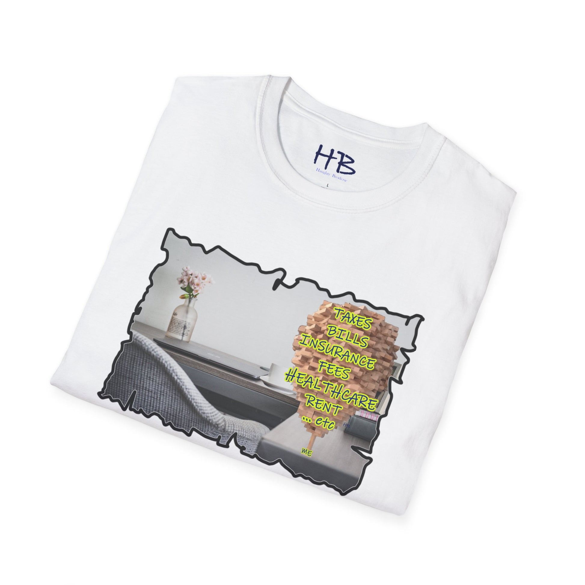 Introducing our remarkable tee shirt, an epitome of modern-day life struggles and triumphs. This captivating garment showcases a mesmerizing image that encapsulates the essence of our daily existence. Picture this: a meticulously arranged desk adorned with a laptop, a steaming coffee mug, vibrant flowers, a stack of enlightening books, and a cherished photograph of a loved one. On the side of this compelling scene stands an astonishingly intricate Jenga tower, defying gravity and capturing our attention.