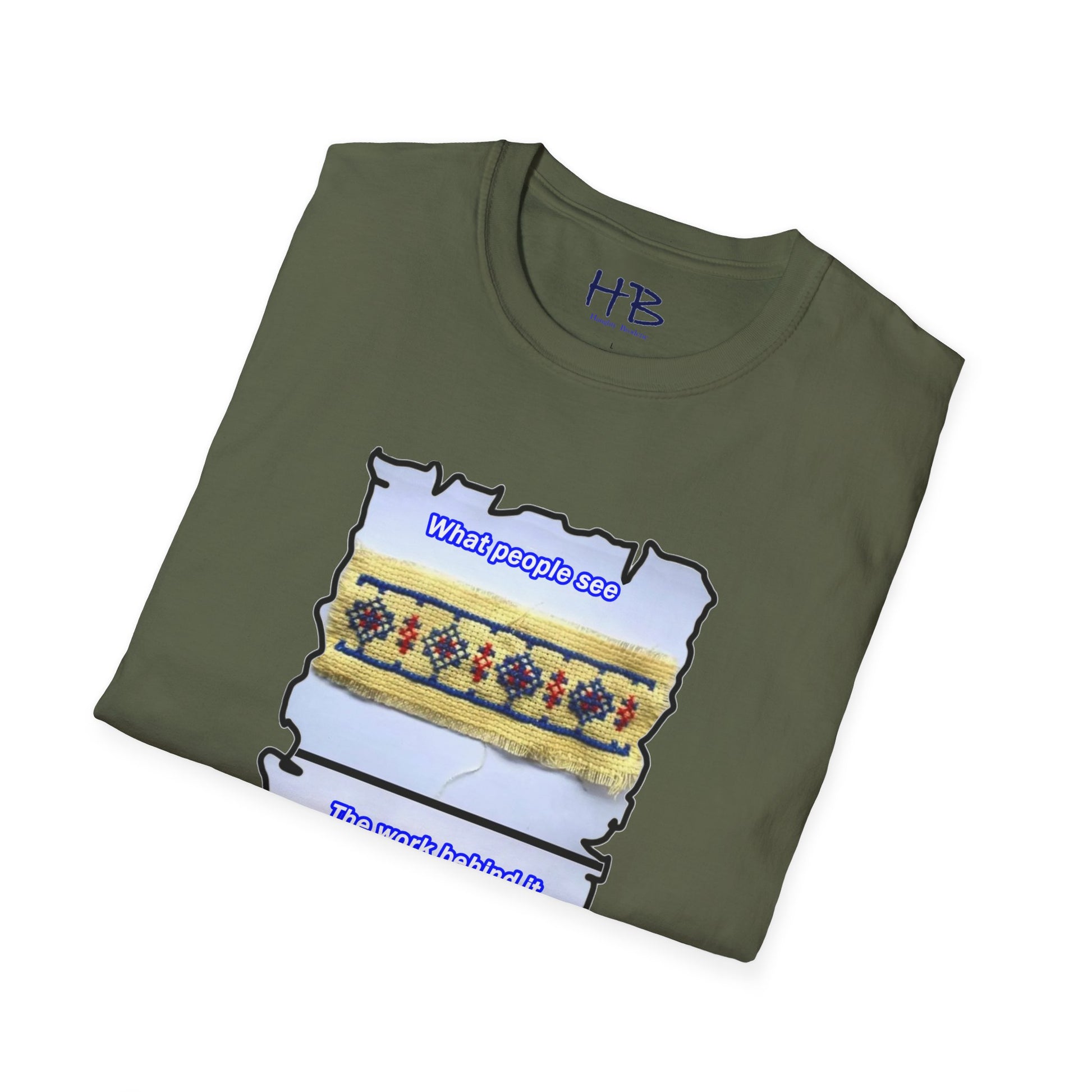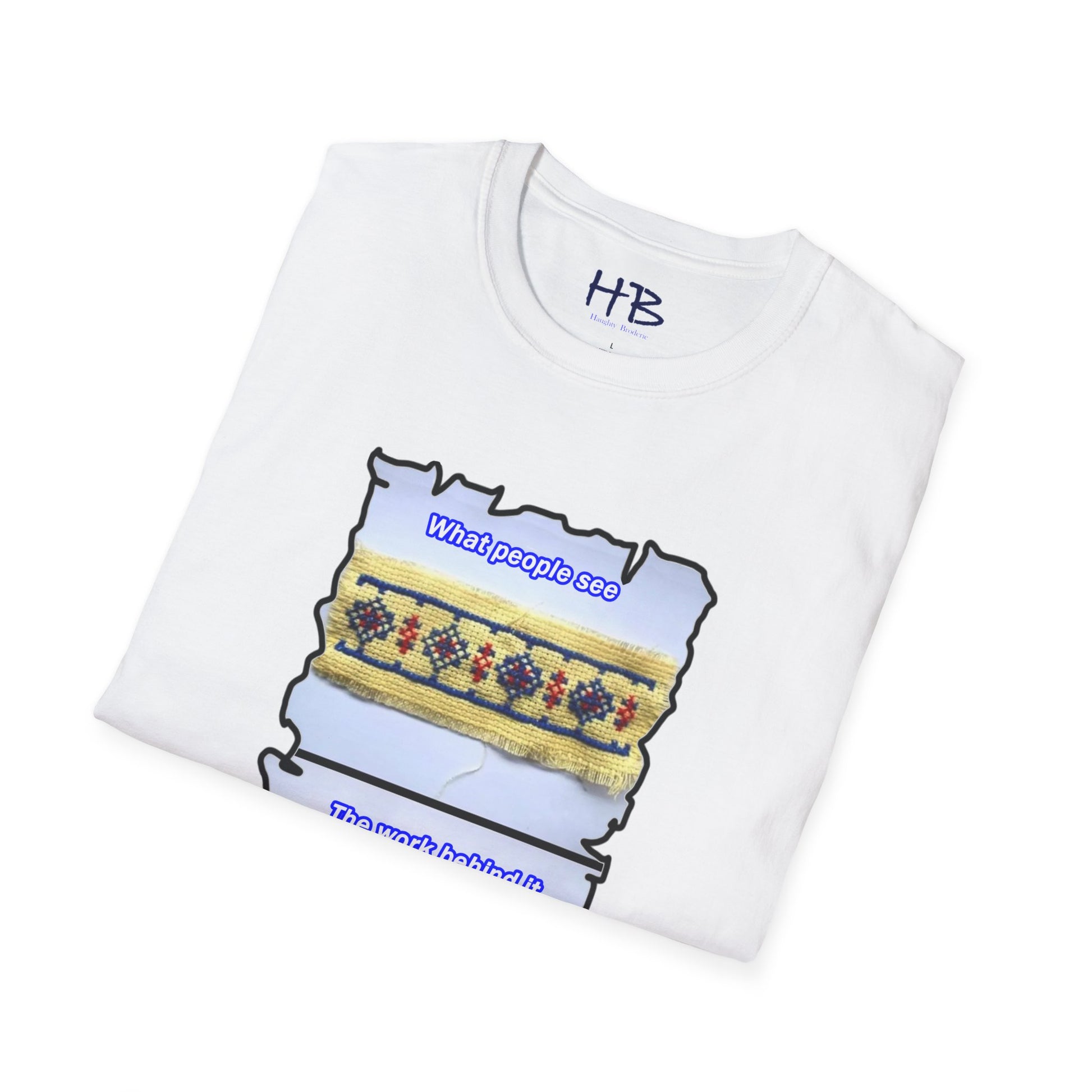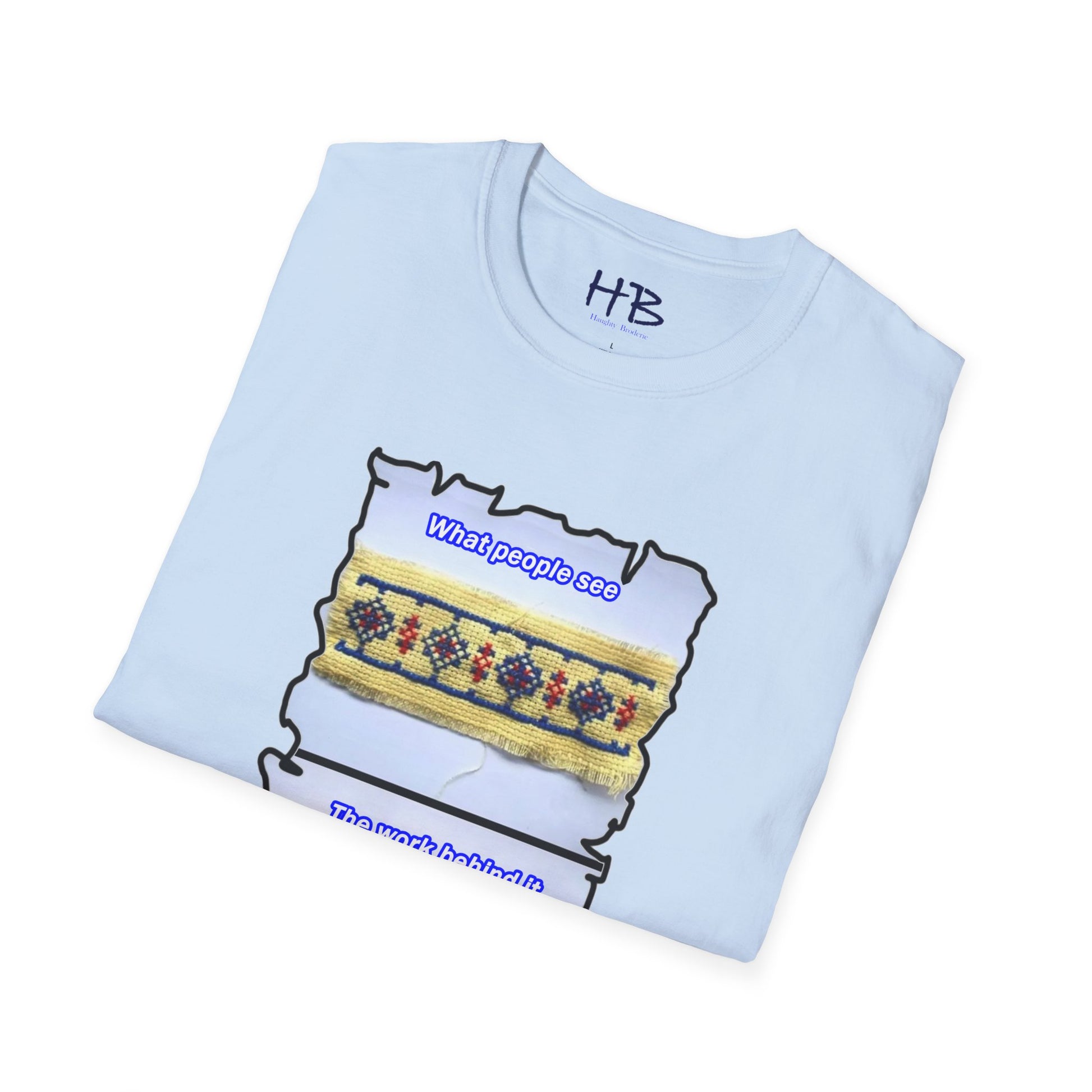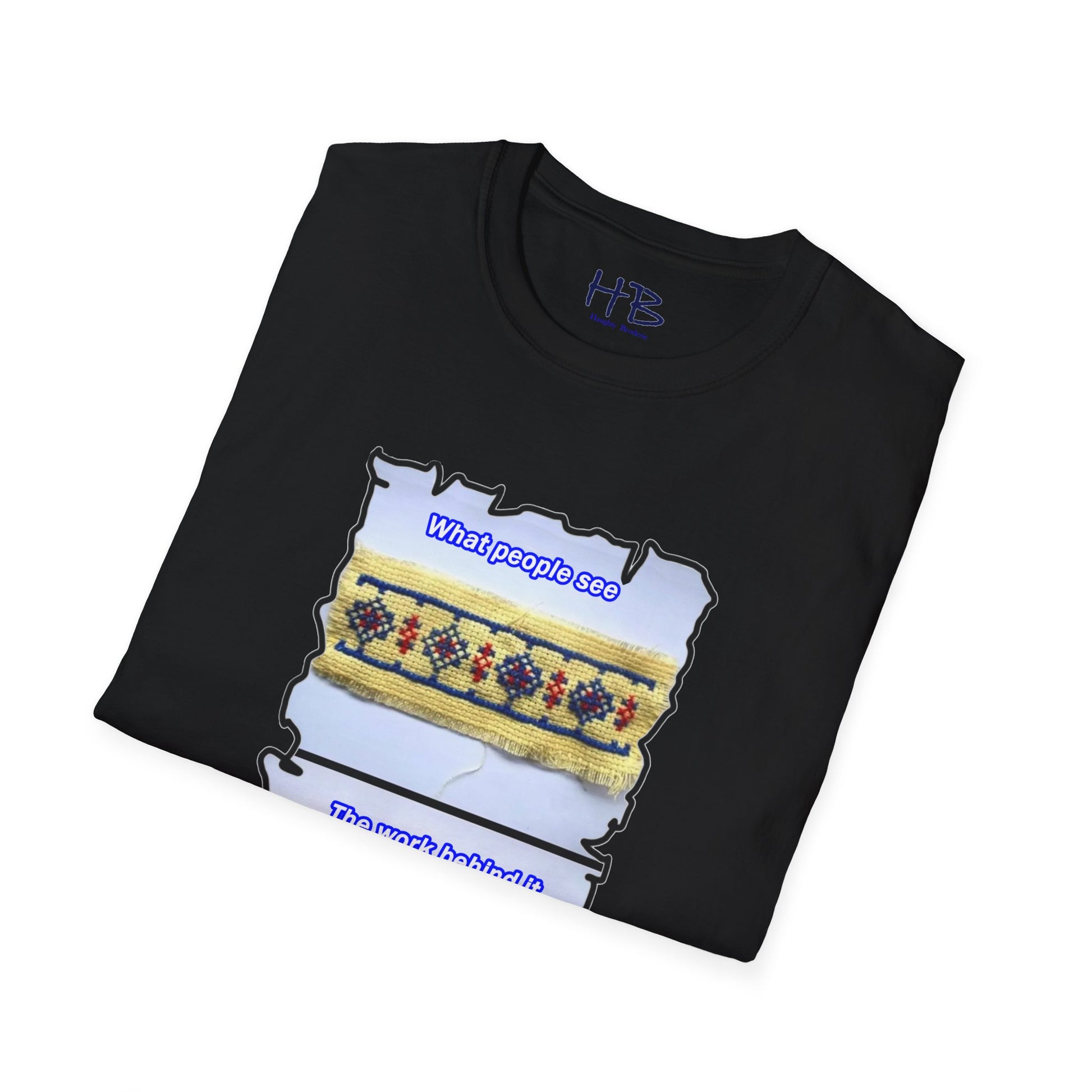 But beneath this captivating facade lies a tale of unyielding perseverance and tireless coordination, depicted in the lower picture—The work behind it. The excessive threads at the back reveal the laborious efforts and meticulous preparations undertaken to achieve the flawless masterpiece showcased on the front. The countless hours spent intricately weaving every thread and ensuring flawless execution are the true essence of this tee shirt.