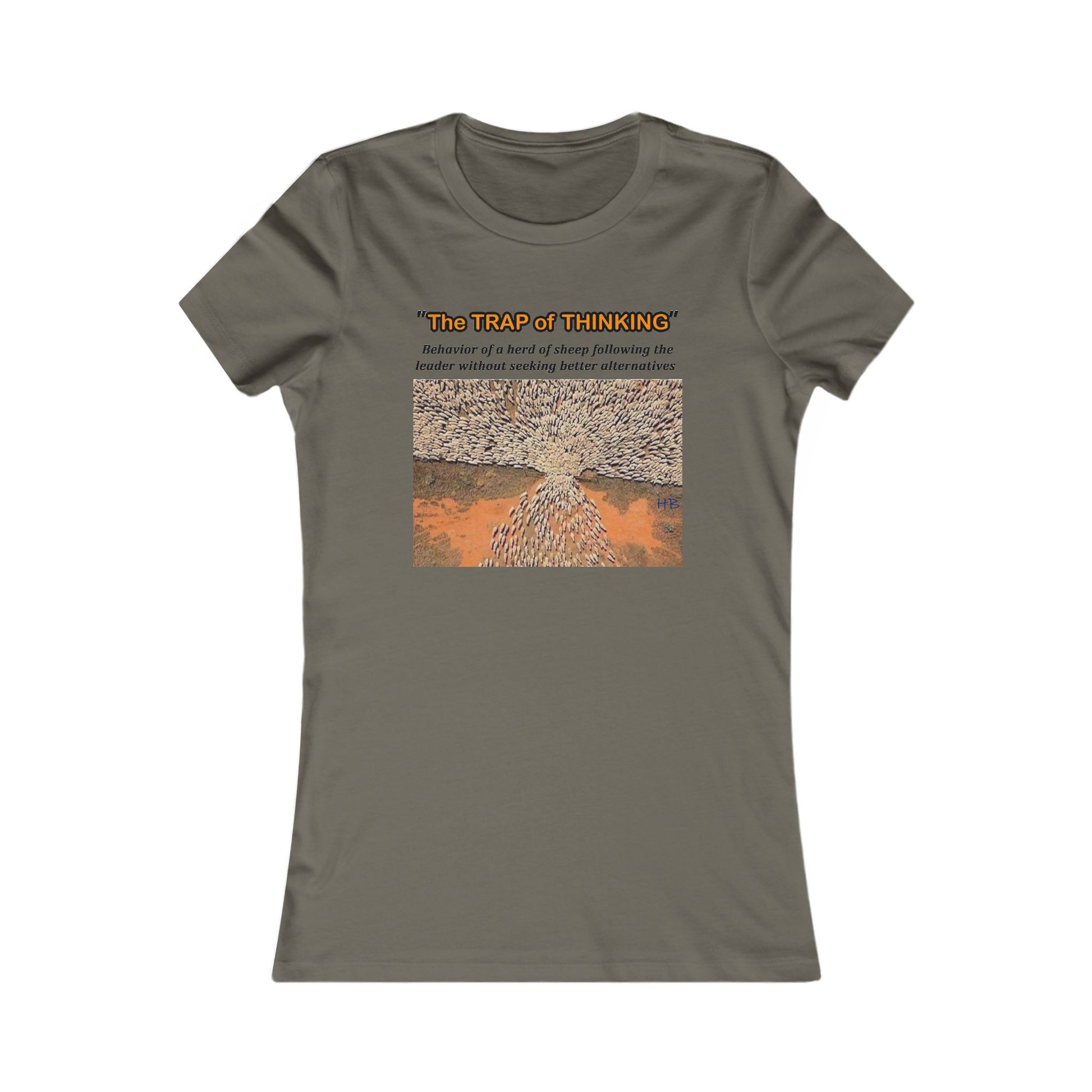 Introducing our latest tee shirt, entitled "The Trap of Thinking," featuring a powerful image that illustrates the perils of following blindly without questioning our actions. The design showcases a herd of sheep following their leader through a door, even though there is a simpler path available that would require no effort at all.