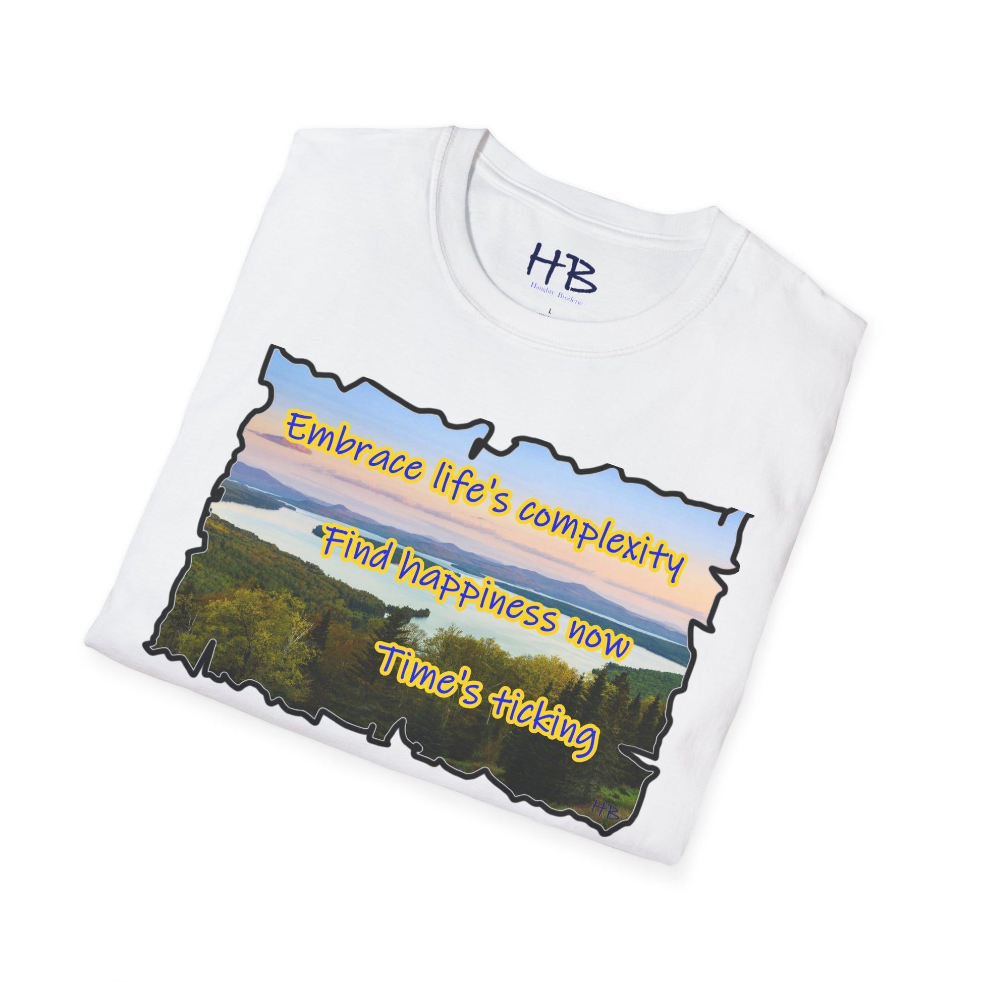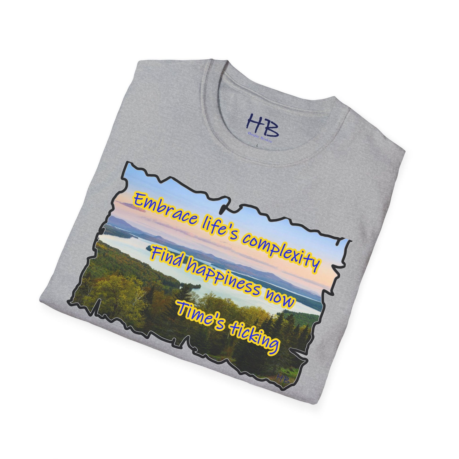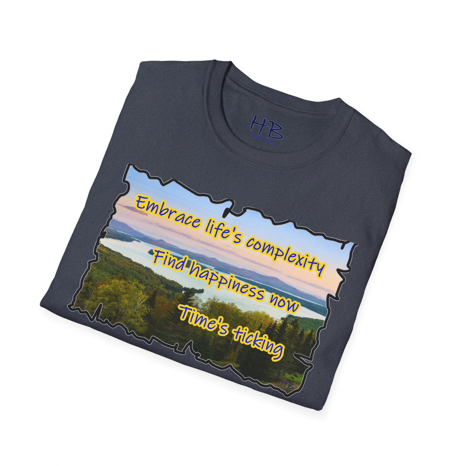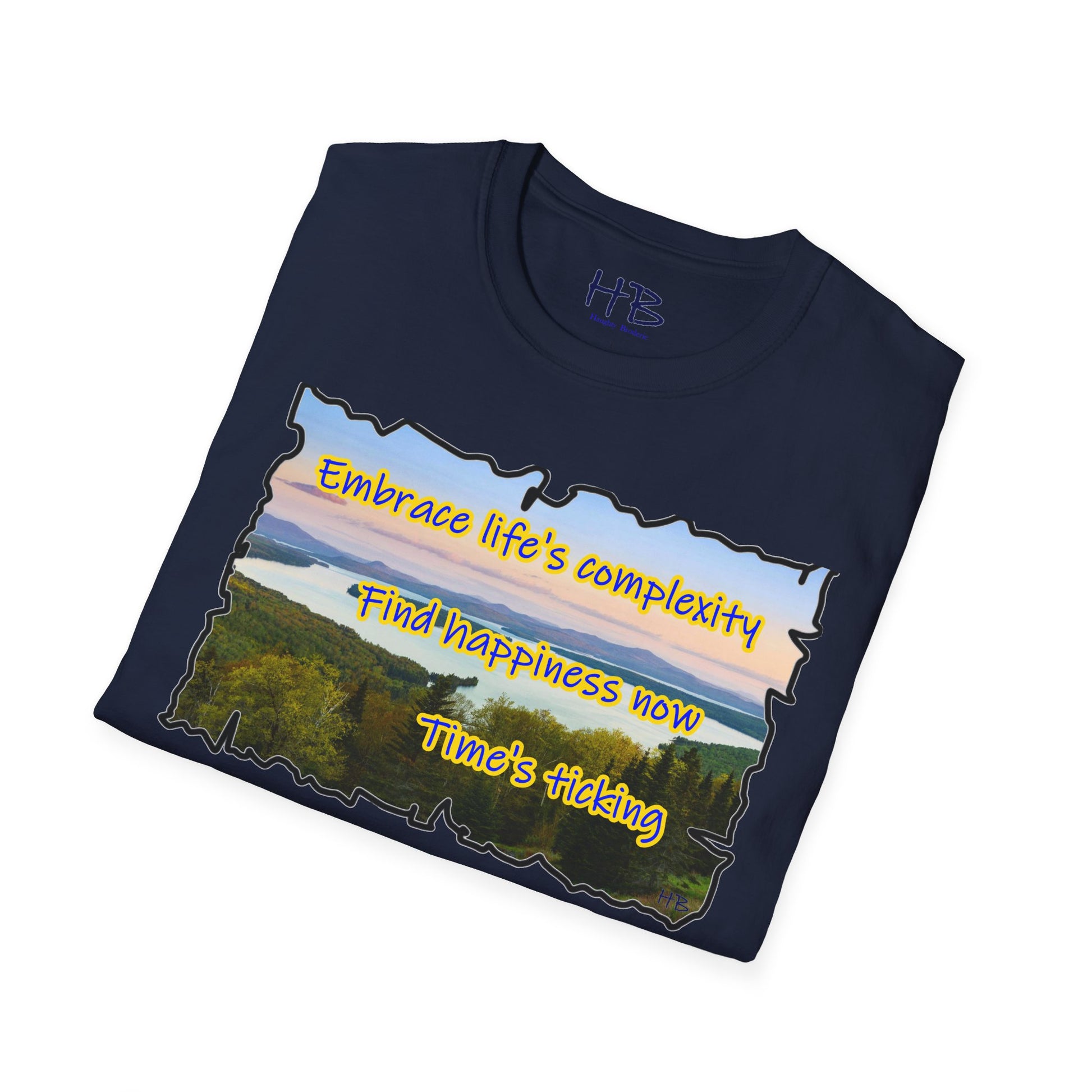 Let your gaze now drift to the carefully scripted words, a timeless mantra echoing through the ages: "Embrace life's complexity, find happiness now, time's ticking." This isn't just a t-shirt; it's a wearable philosophy, a reminder that the beauty of life unfolds in the present moment. It’s a call to embrace the intricacies of existence without waiting for a future that may never come.