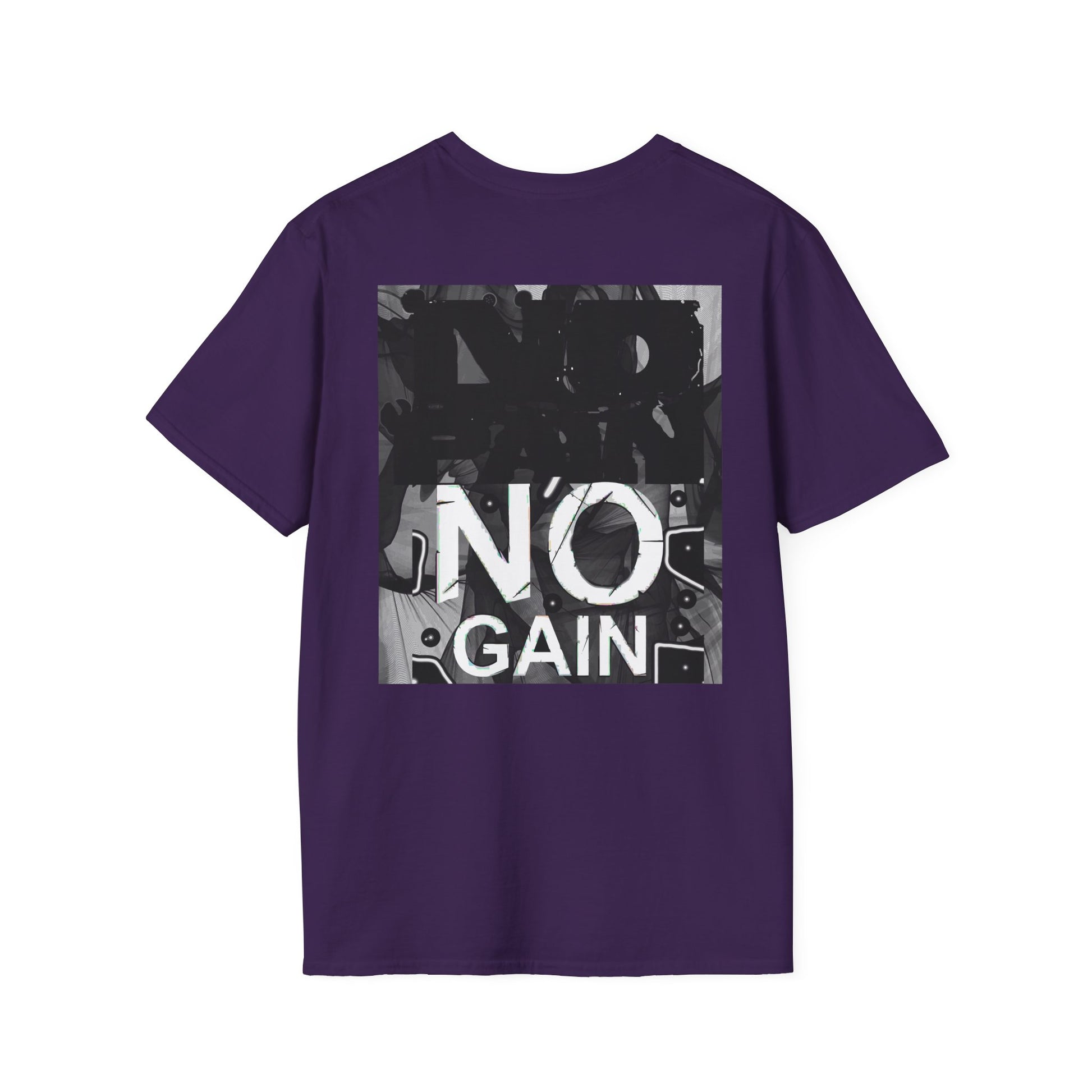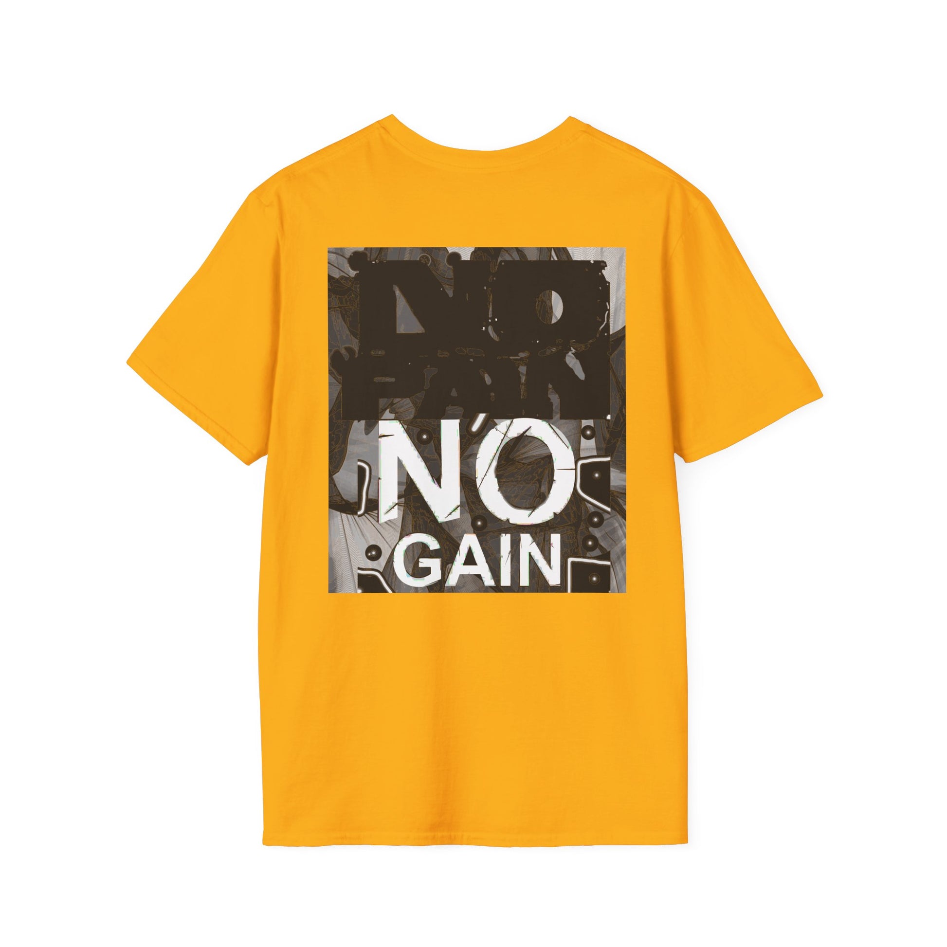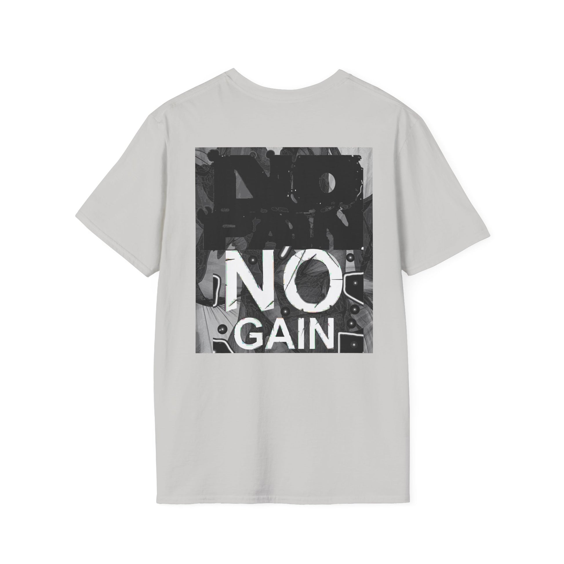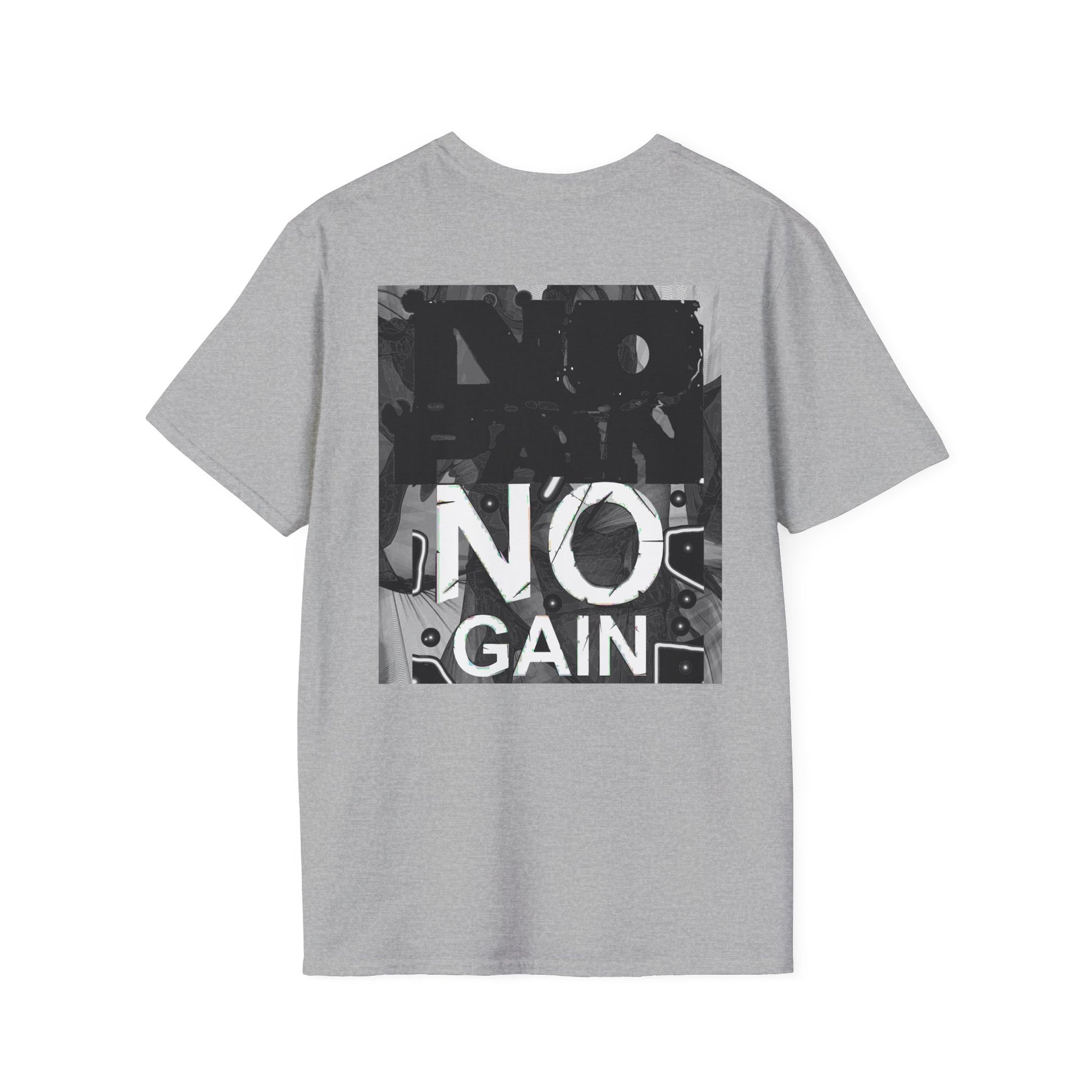 On the back of the tee shirt, the message is loud and clear - "NO PAIN, NO GAIN" is boldly emblazoned in all caps, reminding us that the road to success is not easy, but the rewards are worth the effort.