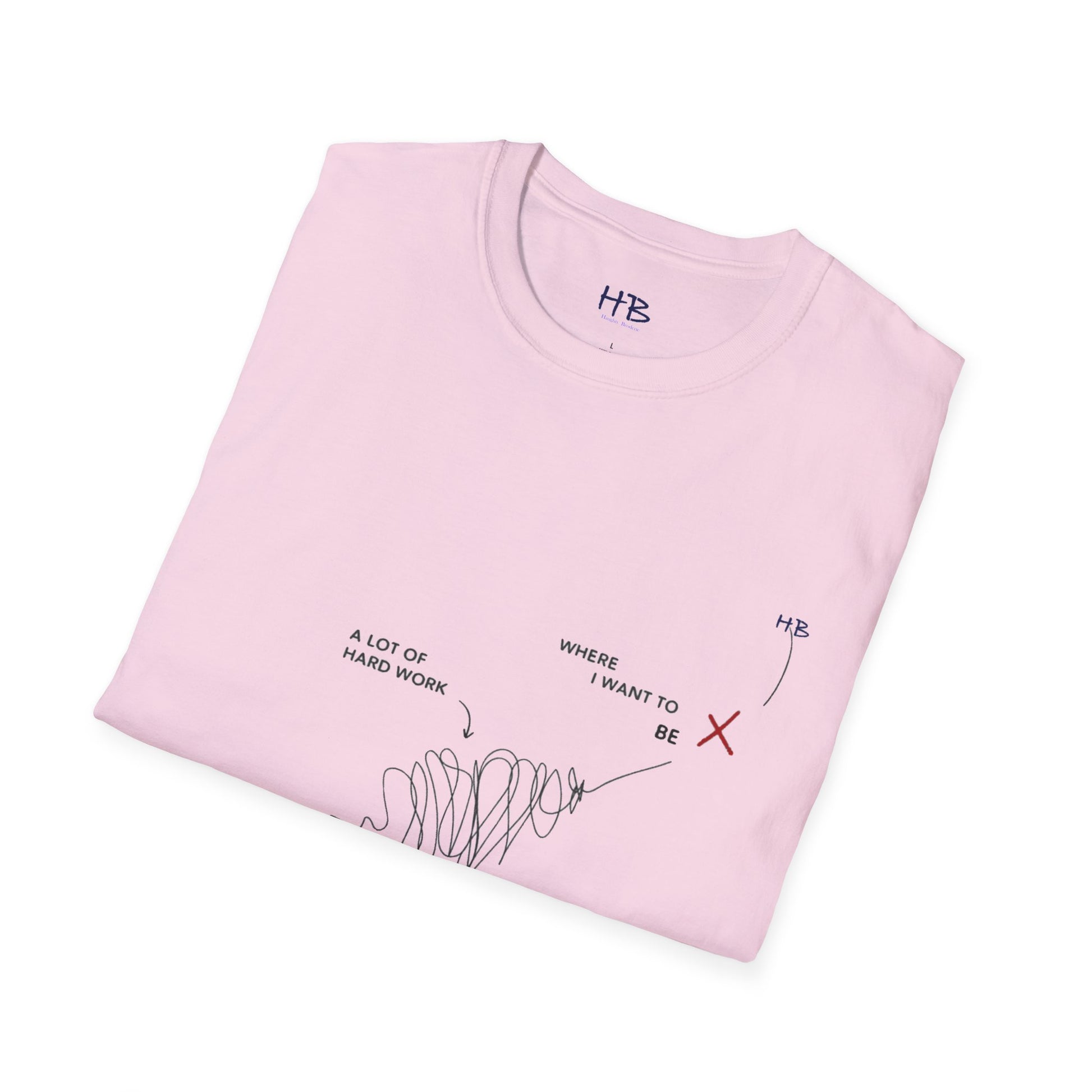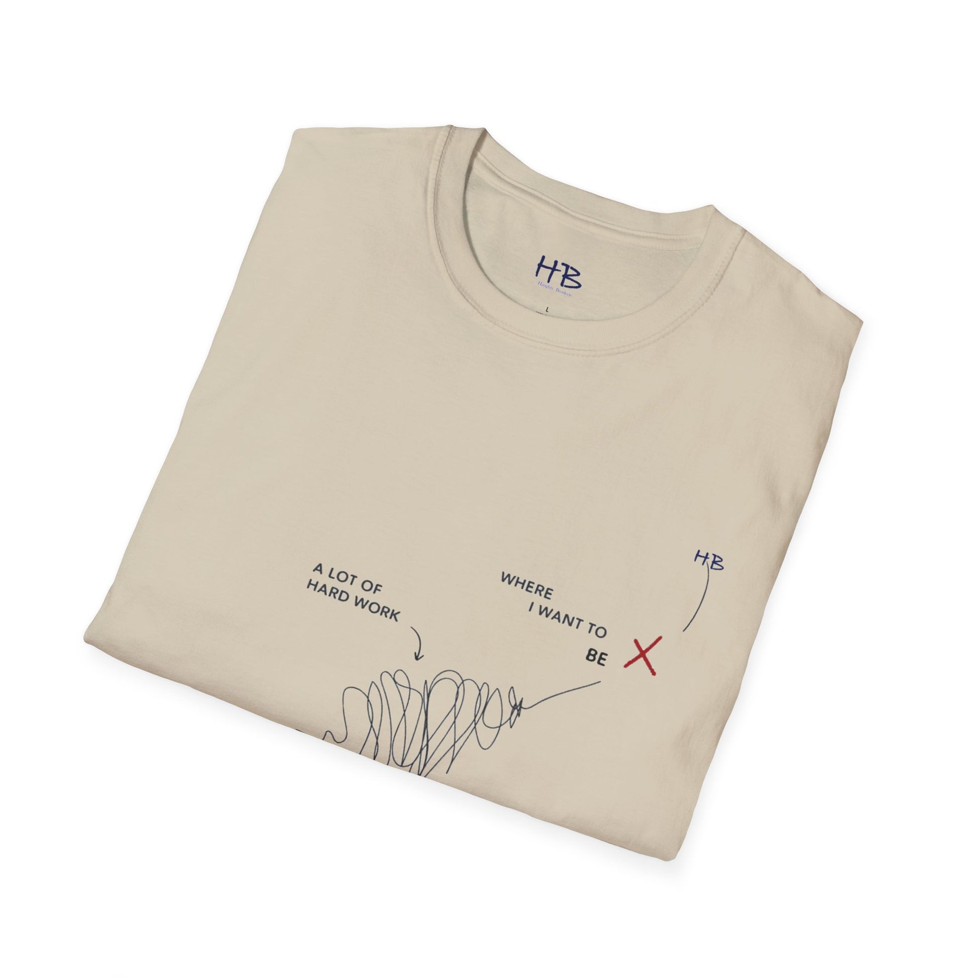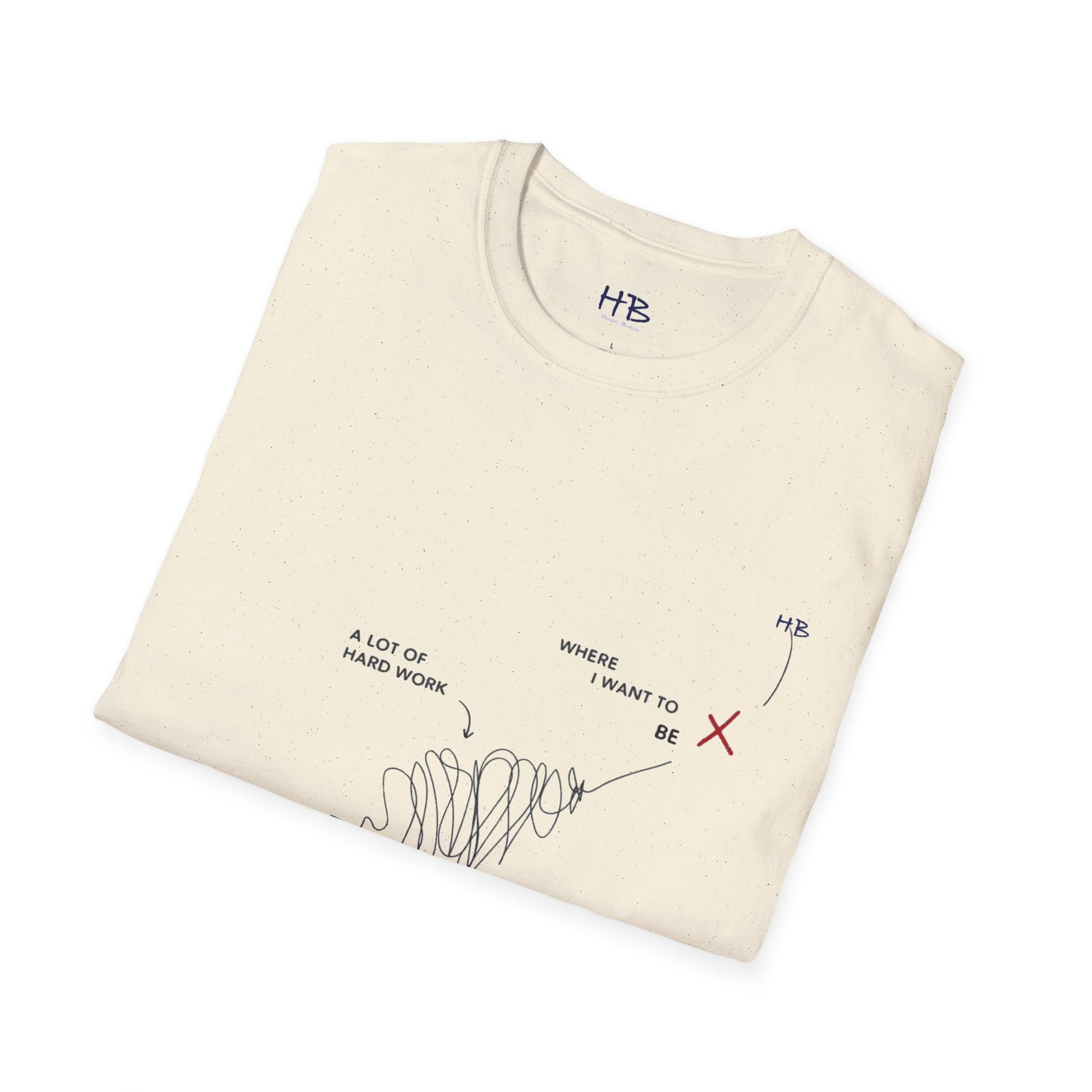The tee shirt design begins with a scribble line that represents where you are currently at in your journey. This line is followed by a chaotic scribble line that symbolizes the hard work and effort required to reach your desired destination. The straight line that comes next represents the path to success, leading to a final red X that marks where you want to be.