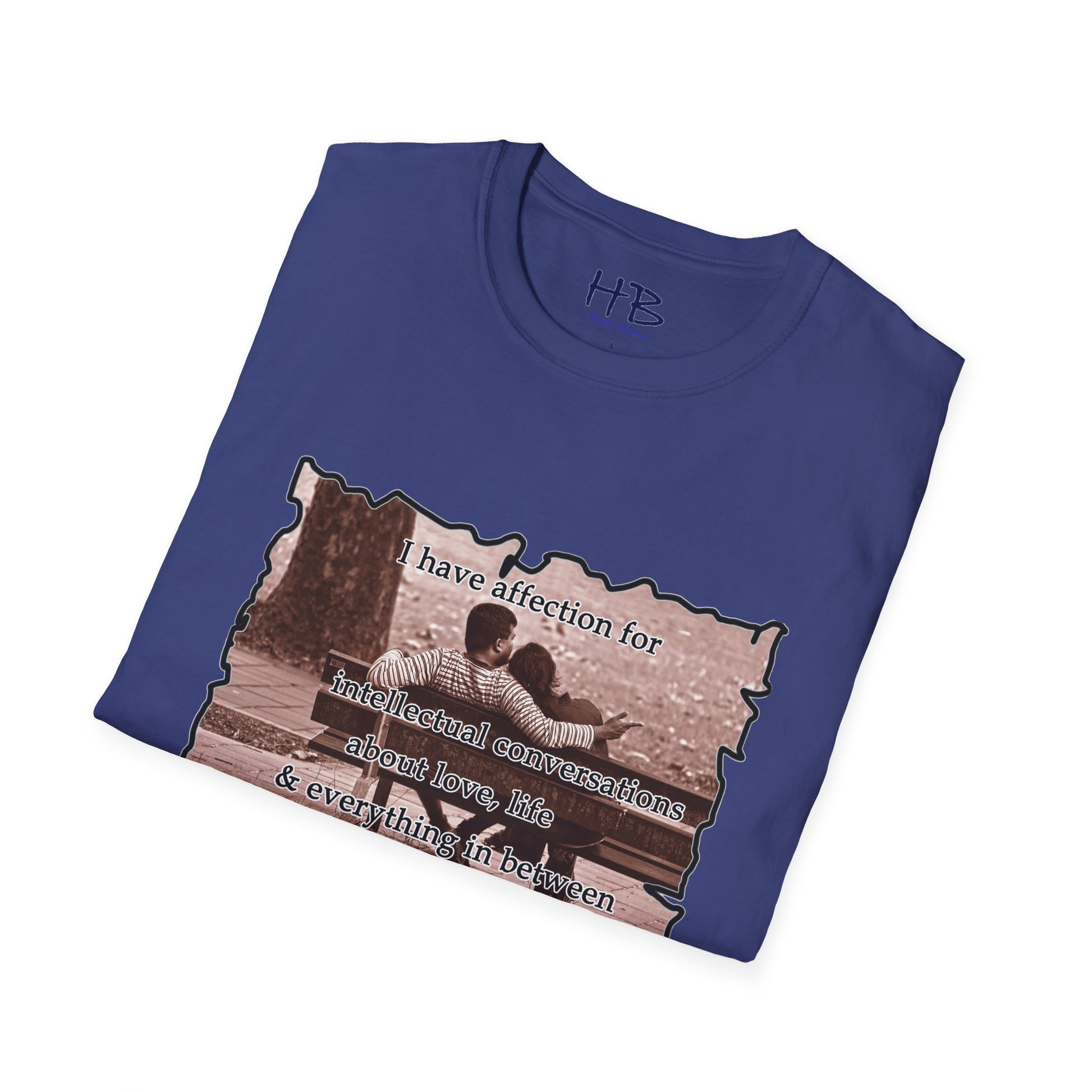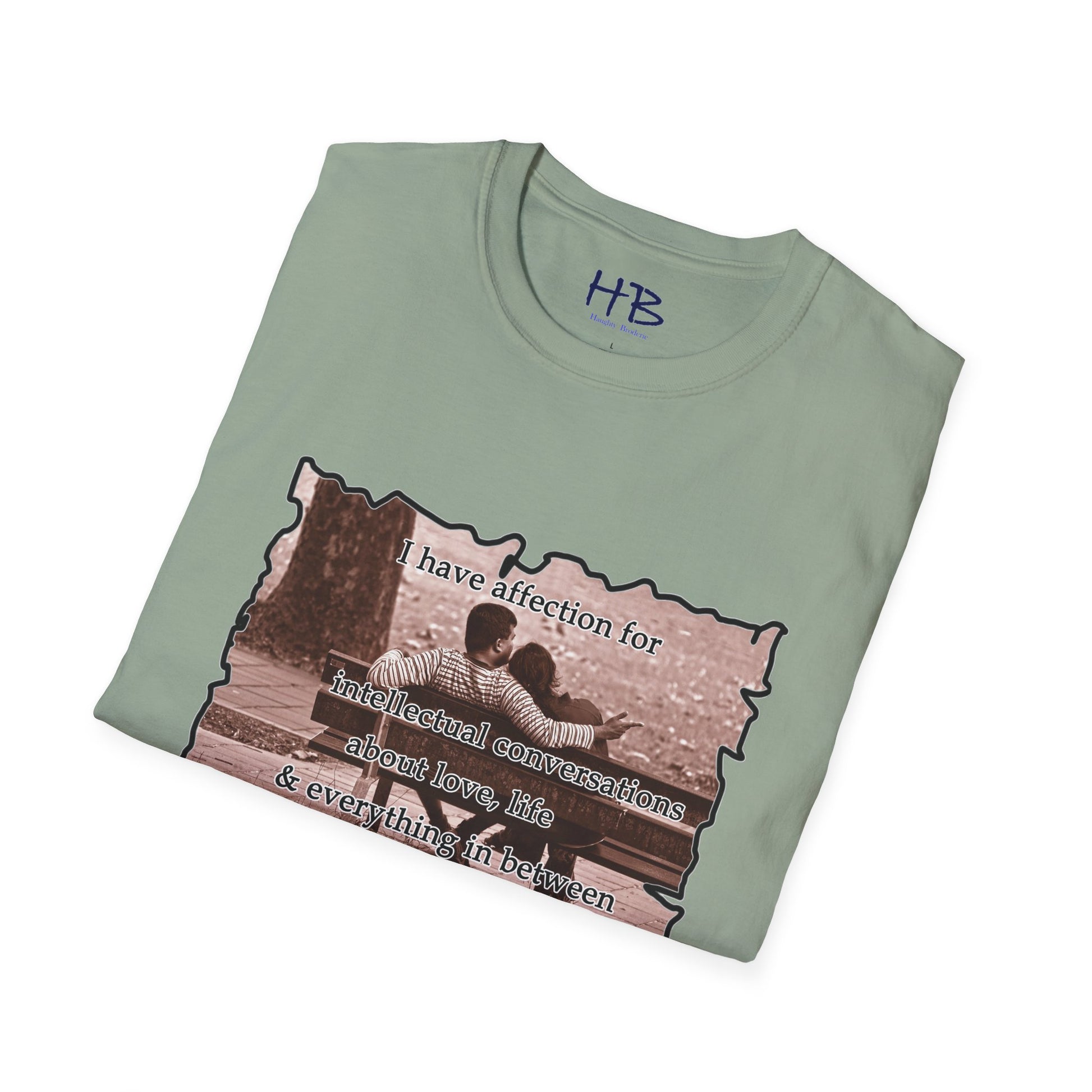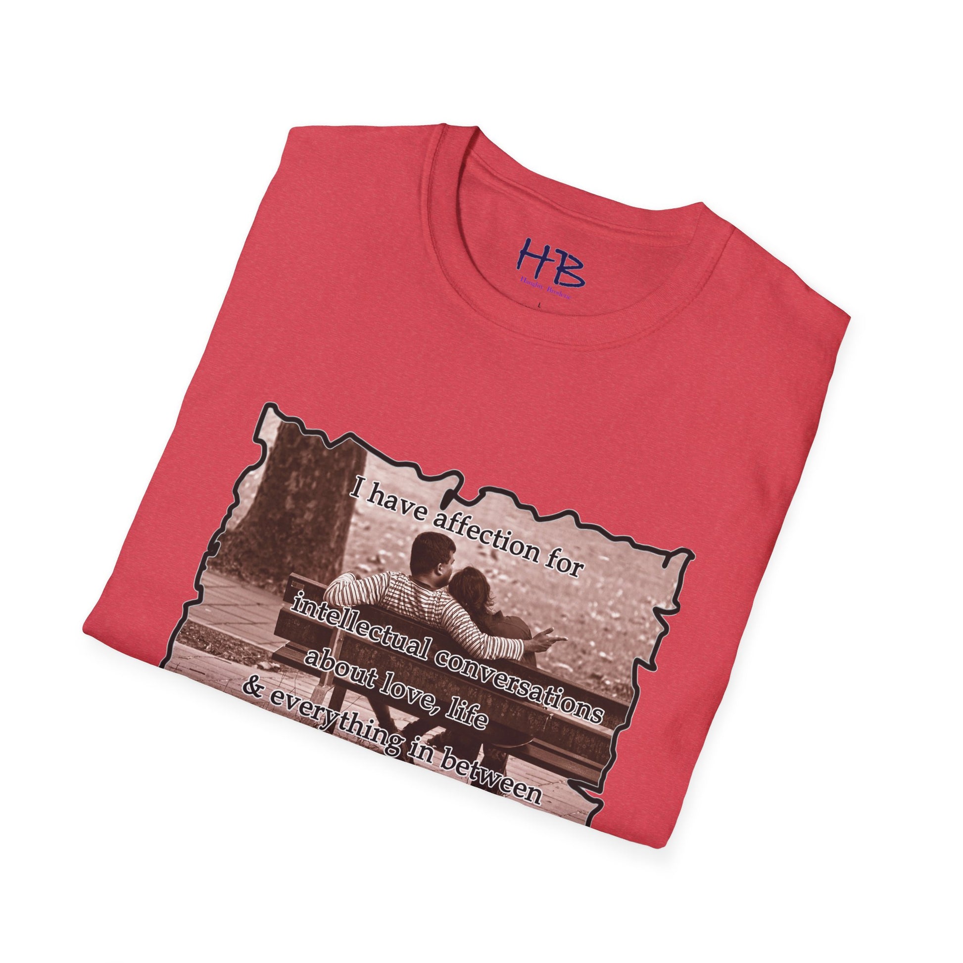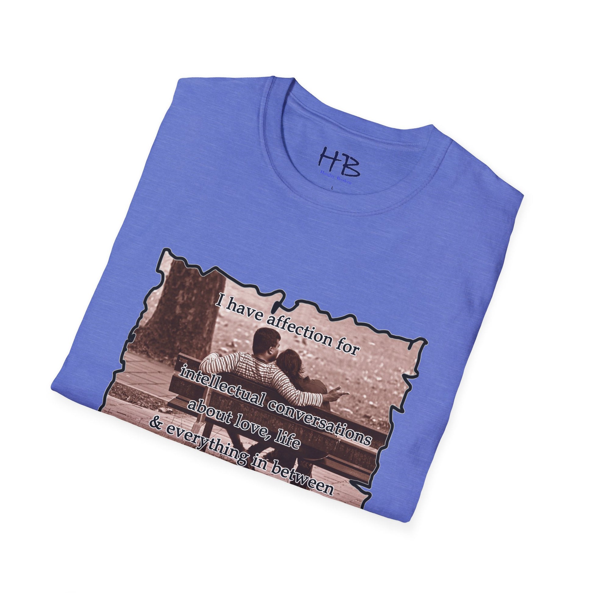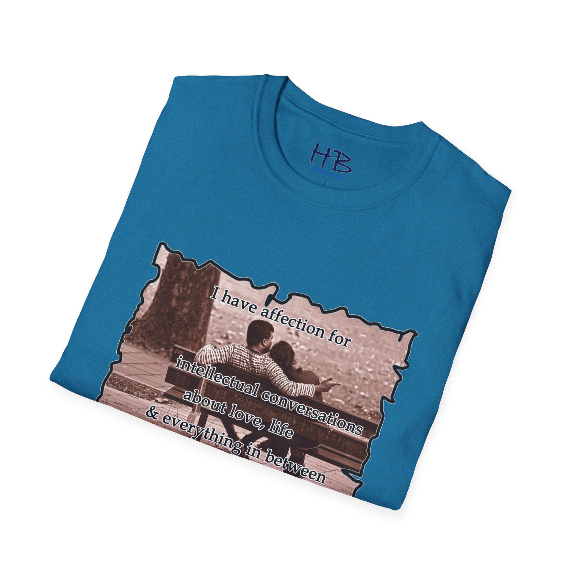 Introducing our exceptional apparel, showcasing a heartwarming image of a couple seated closely on a bench, their arms entwined, as they gaze out into the open expanse. Enhanced by the inspiring text that declares, "I hold the deepest affection for intellectual conversations, encompassing love, life, and everything in between."