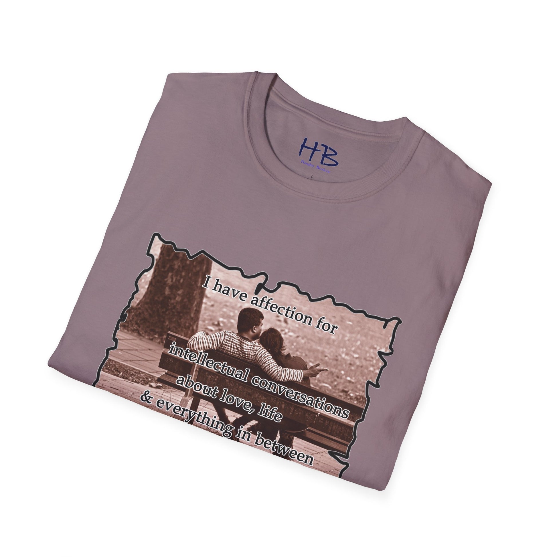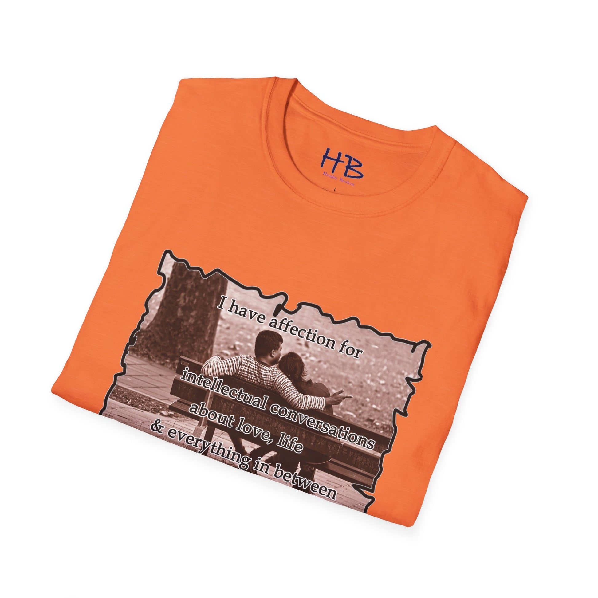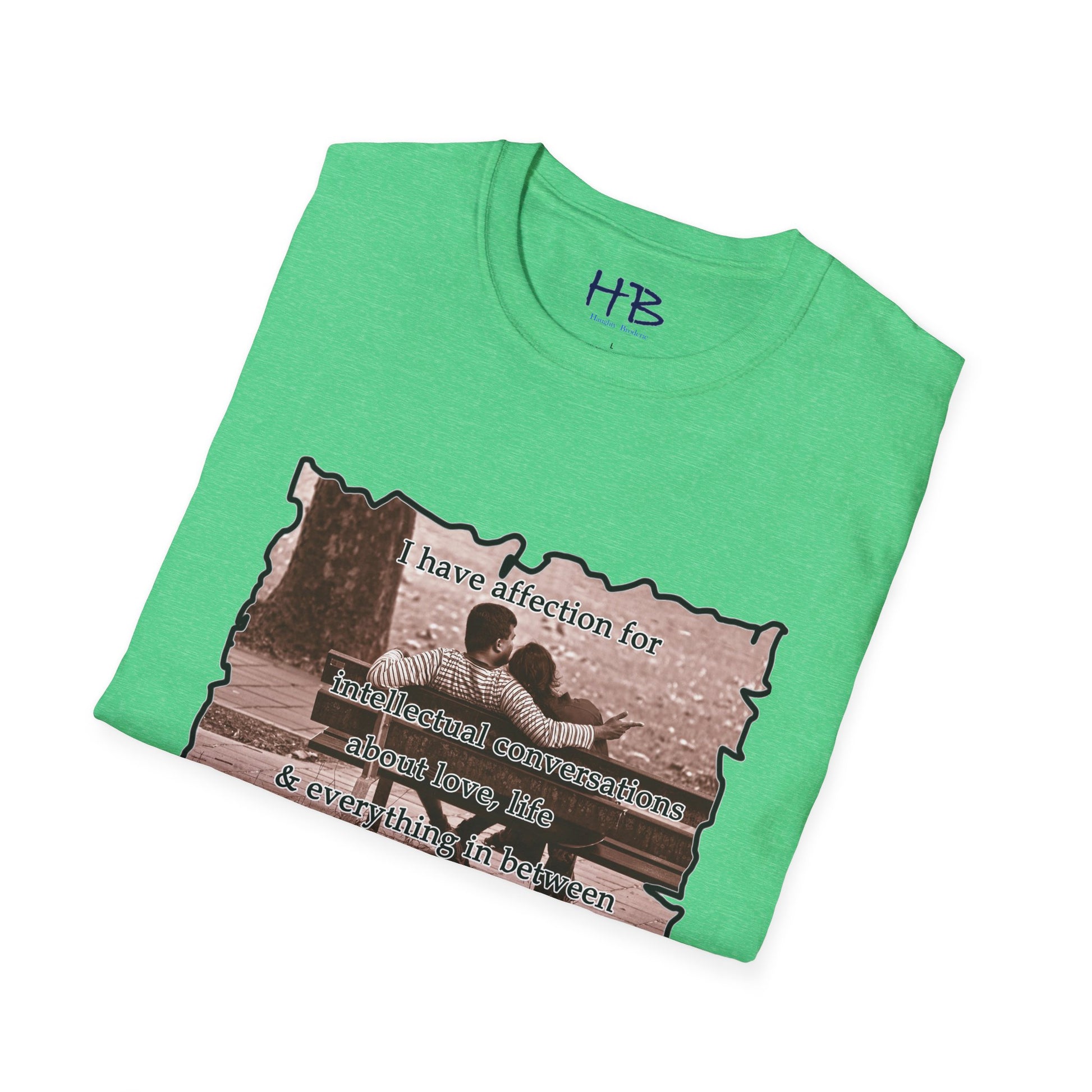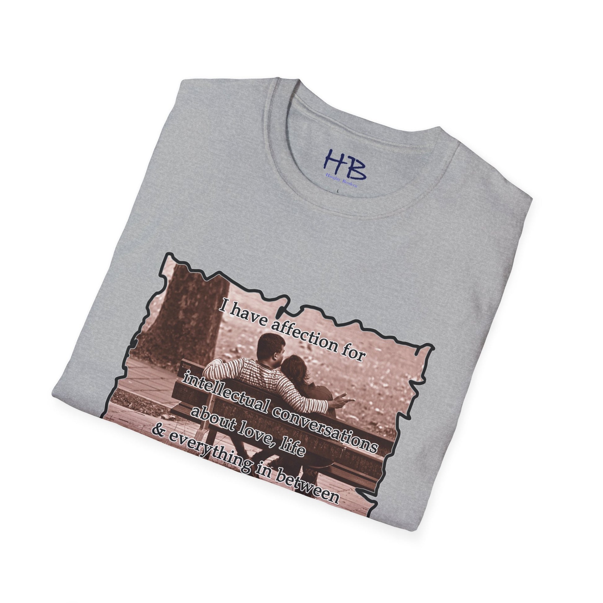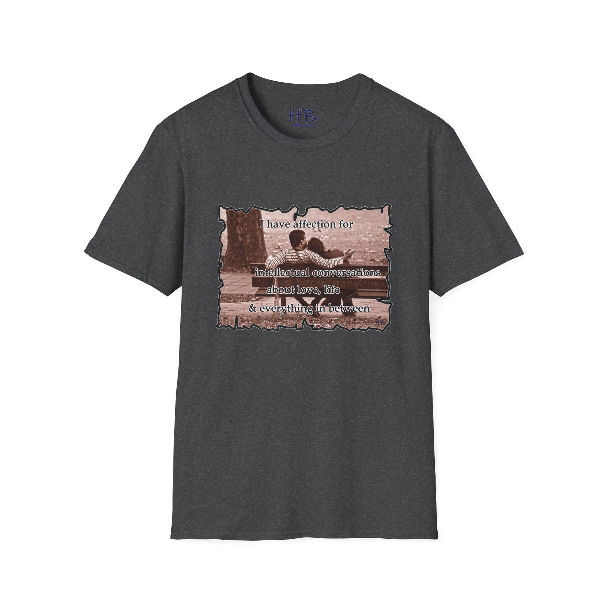 Introducing our exceptional apparel, showcasing a heartwarming image of a couple seated closely on a bench, their arms entwined, as they gaze out into the open expanse. Enhanced by the inspiring text that declares, "I hold the deepest affection for intellectual conversations, encompassing love, life, and everything in between."