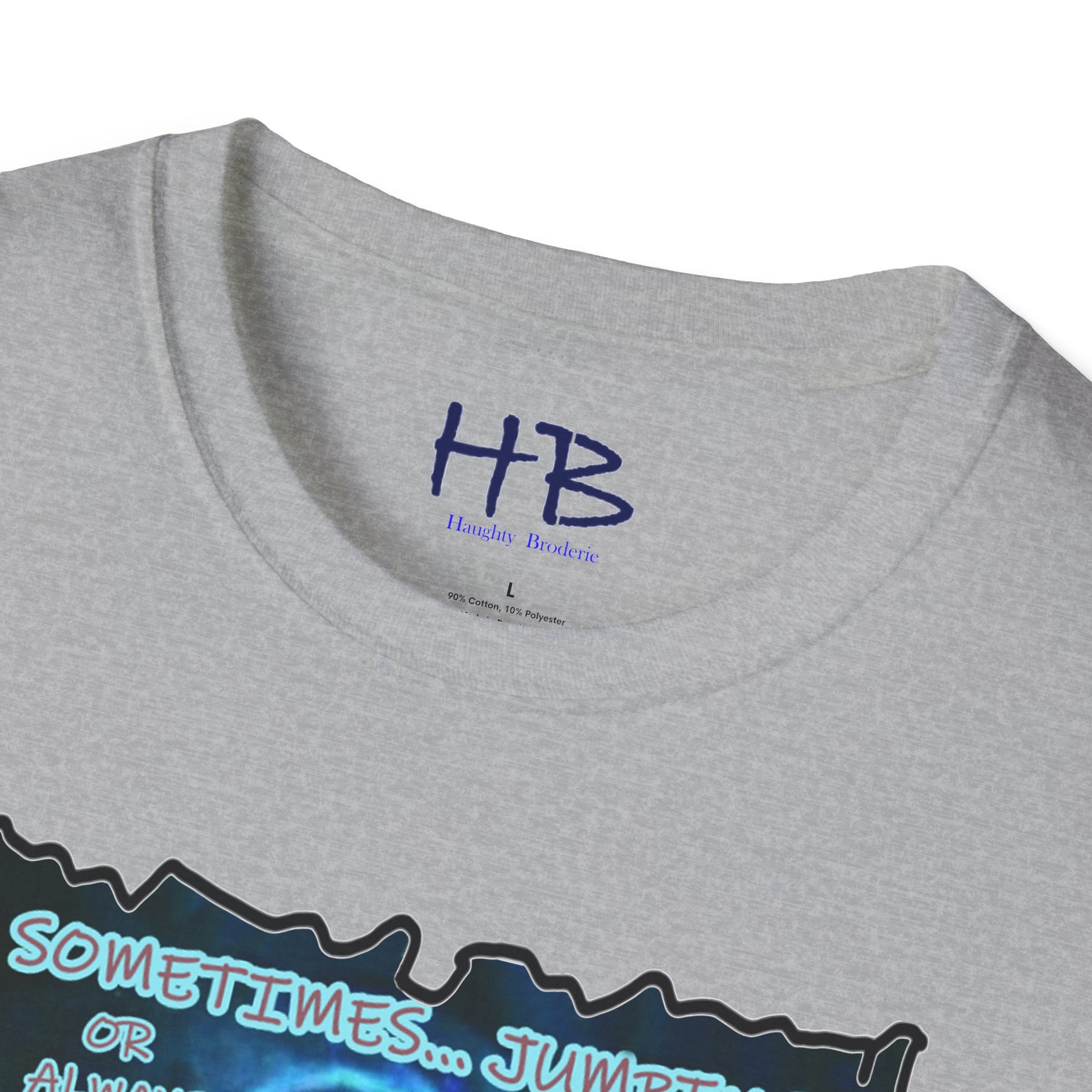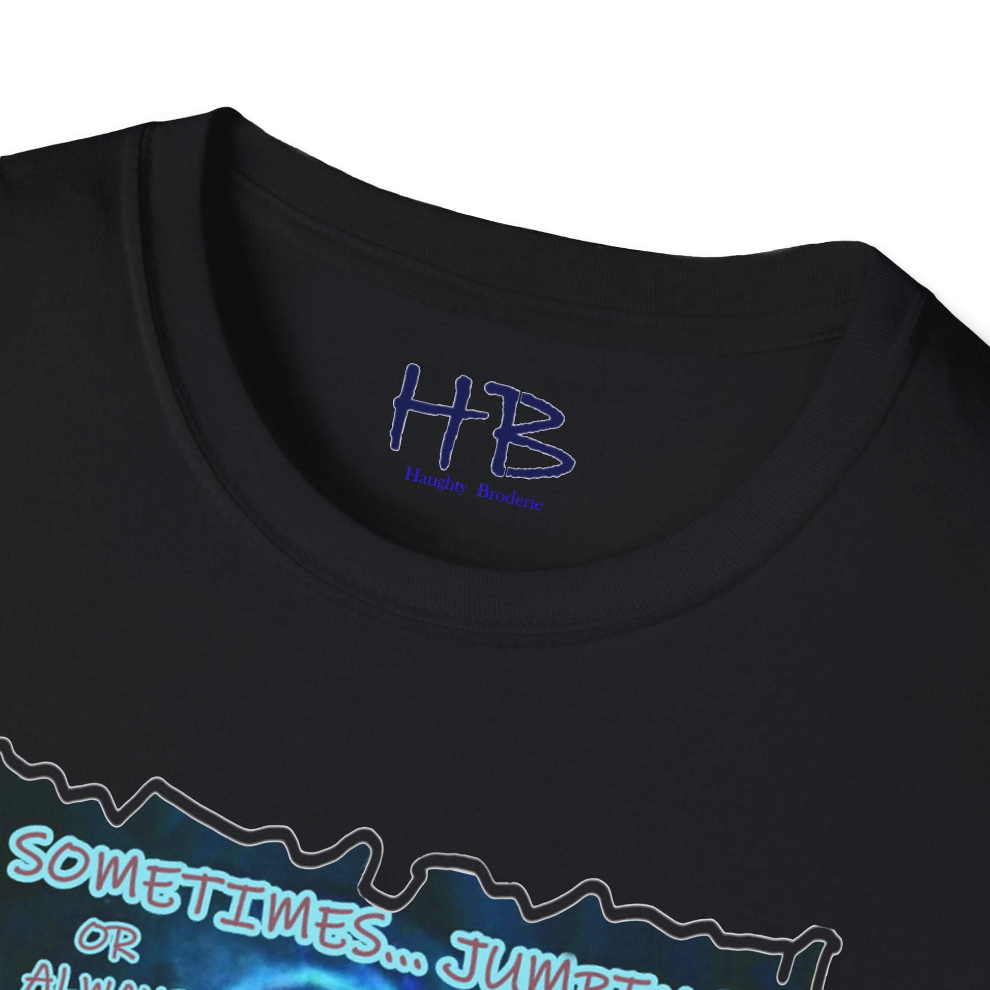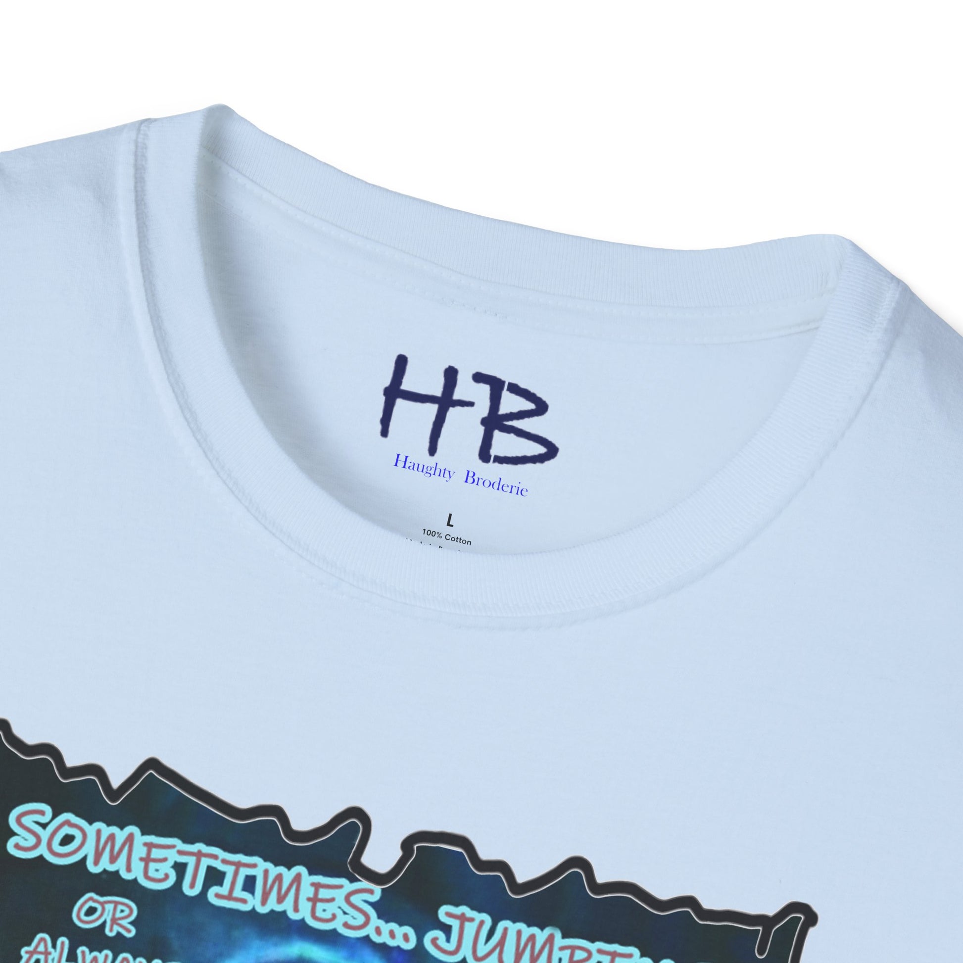 Introducing our extraordinary apparel that captures the essence of life's unpredictable twists and turns. Our mesmerizing creation showcases a captivating scene unfolding in the vast expanse of the sky—an awe-inspiring vortex whirlpool, swirling with a harmonious blend of tranquil blues and pristine whites. Adorned with a profound message, it reads, "Sometimes or Always... Jumping in the Vortex & counting on the Universe is the best thing to do."