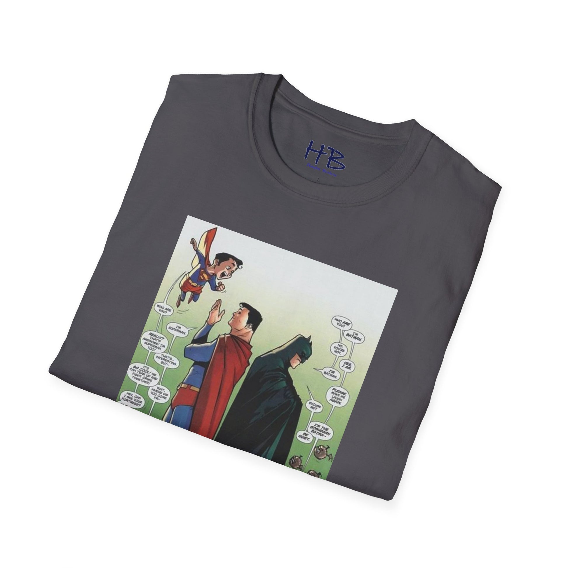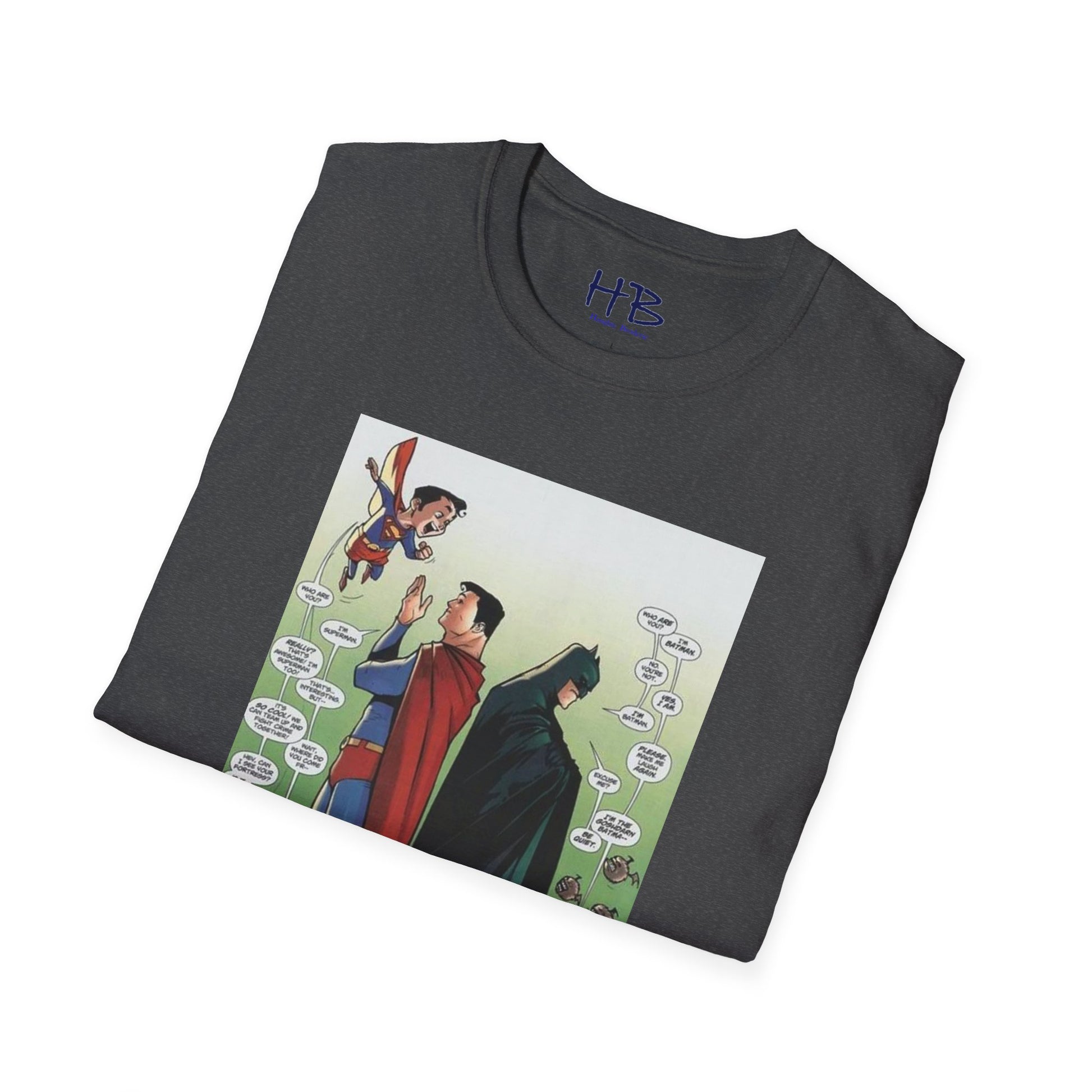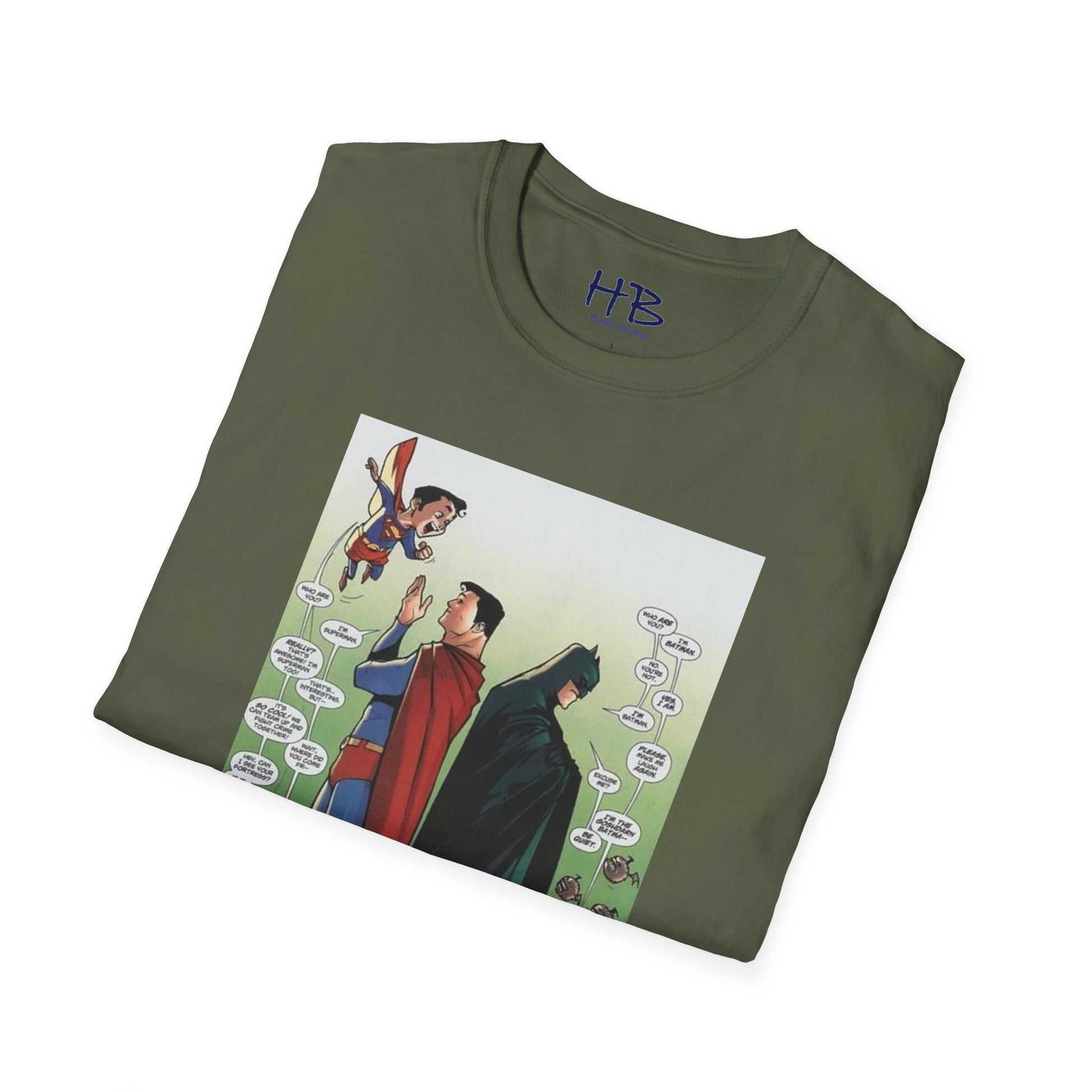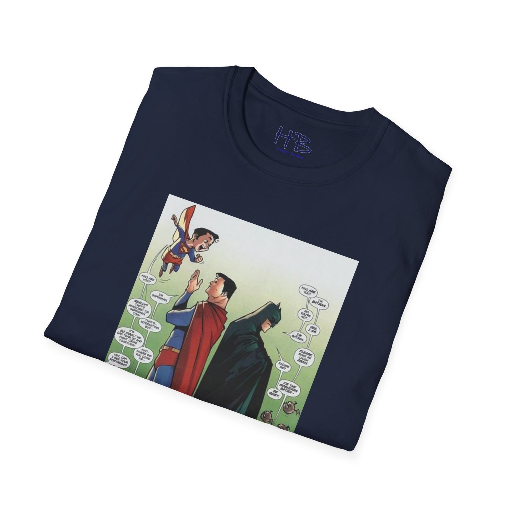 Presenting our exceptional garment that embodies the essence of unity, strength, and heroic adventures. Feast your eyes upon our extraordinary creation, a clothing masterpiece adorned with a captivating image that portrays a momentous encounter between legendary characters. Within this magnificent design, you shall find "The Invincible", an embodiment of power and righteousness, casting a watchful gaze upon Superboy, his youthful protégé. Meanwhile, the Vigilante, the guardian of justice, directs his attention to Batboy, his own apprentice.
