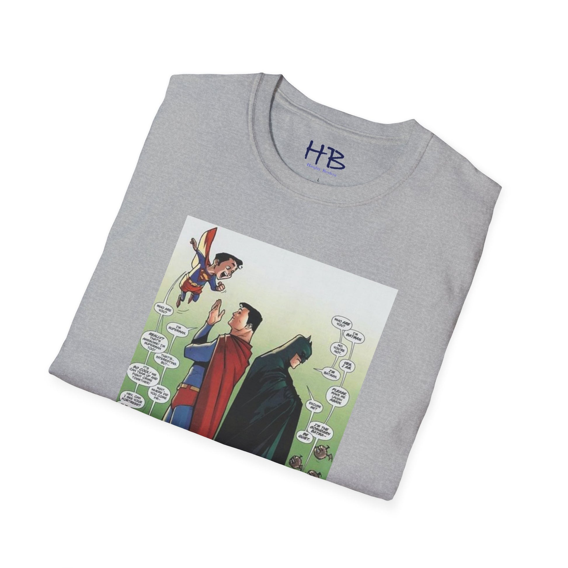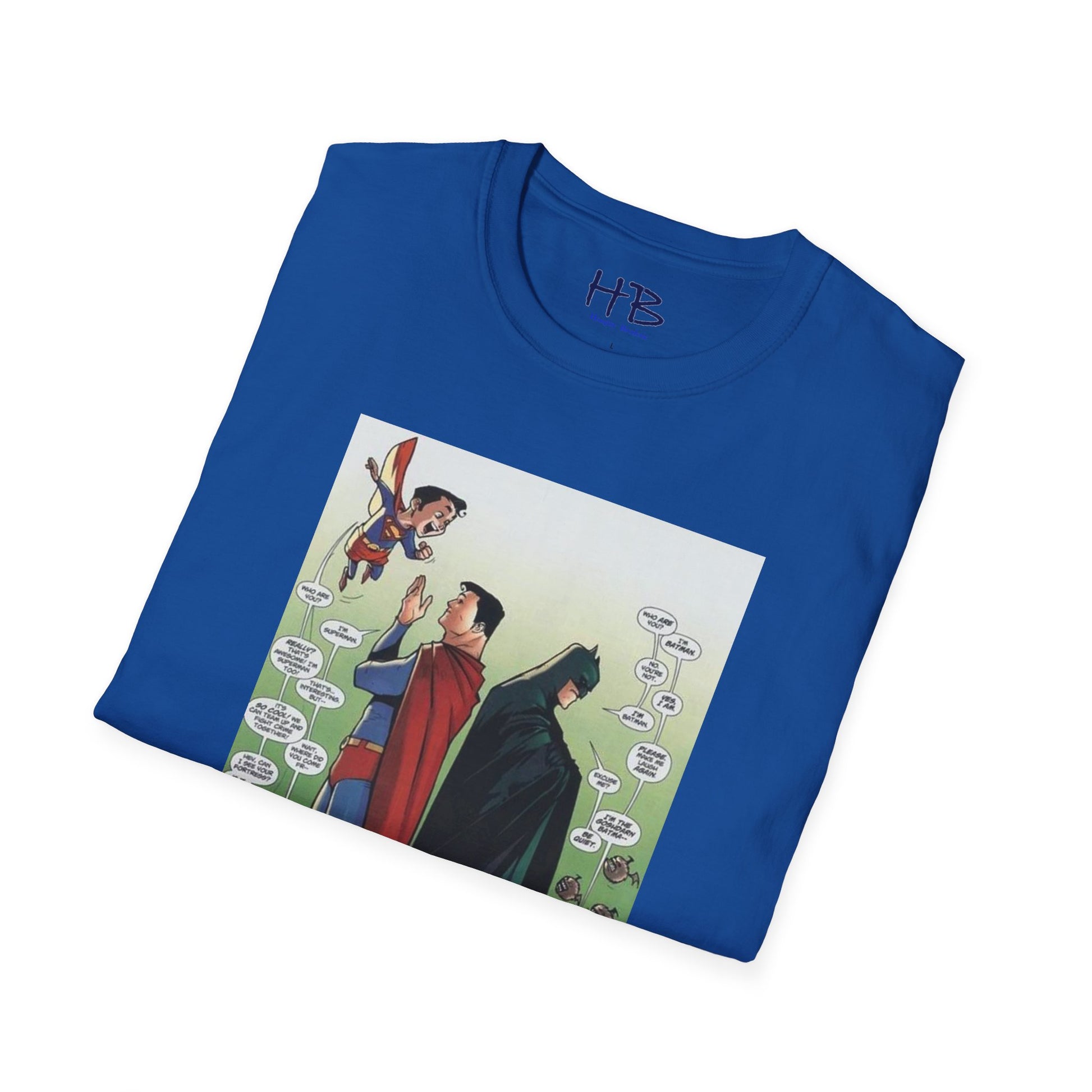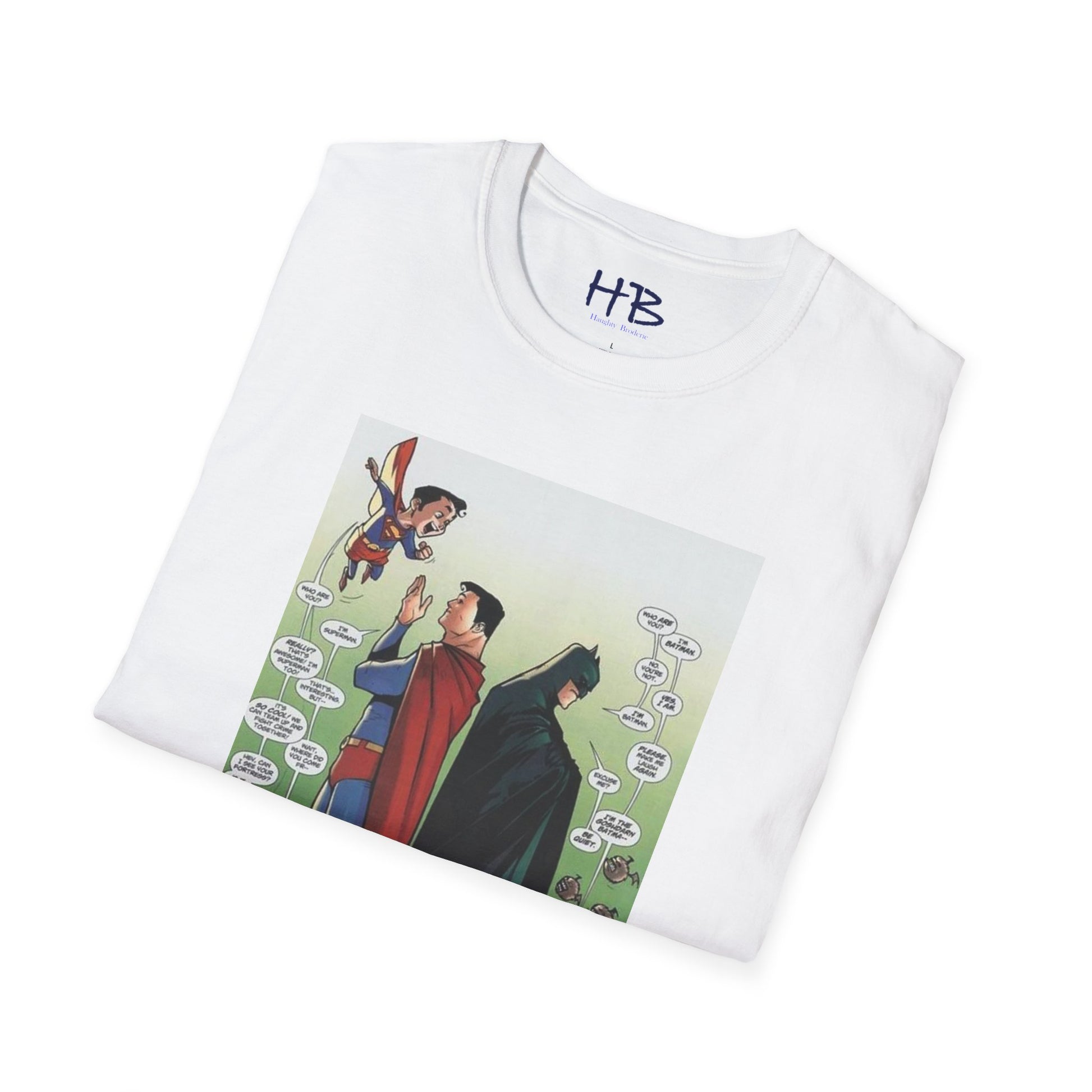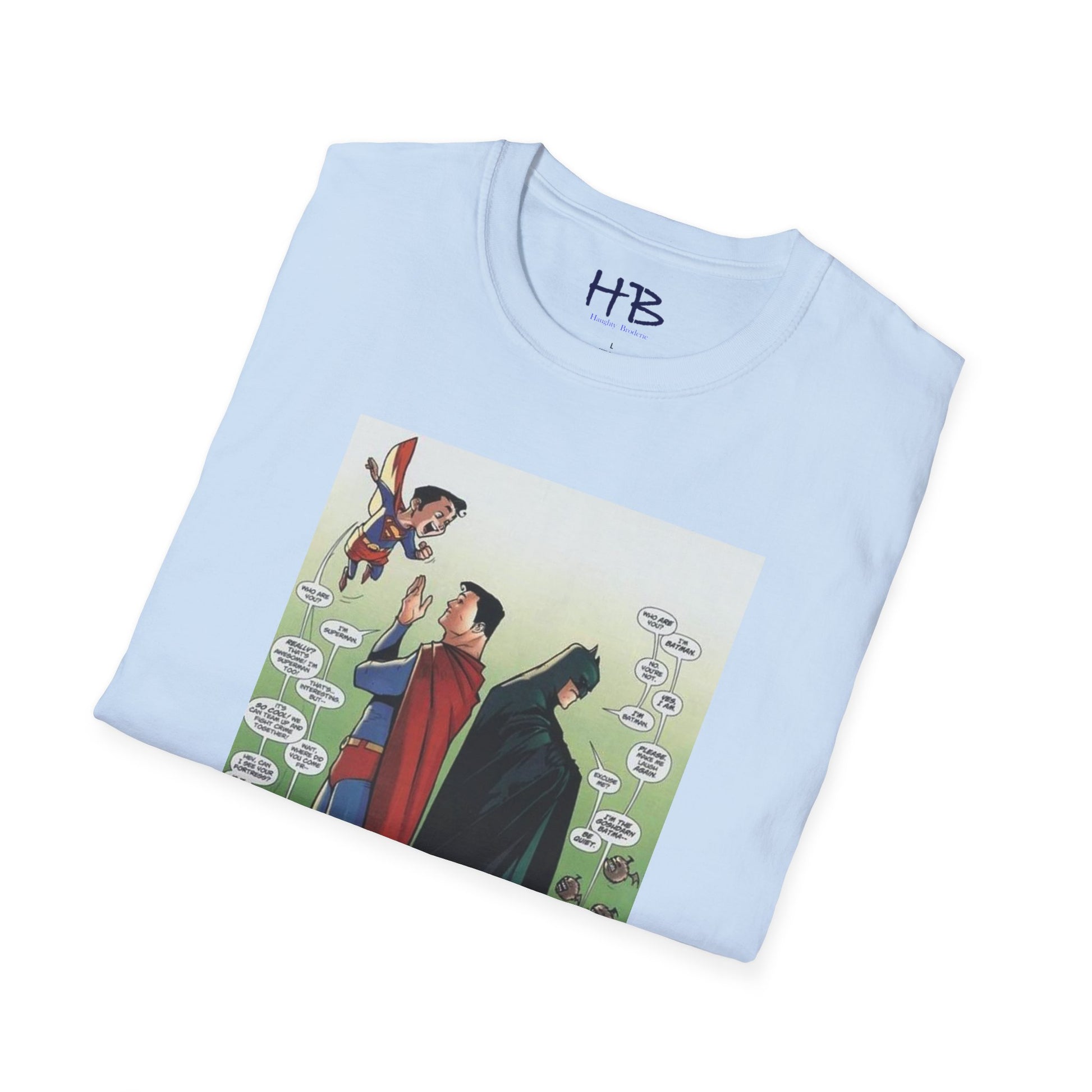 This awe-inspiring tee shirt encapsulates the intricate dynamics of mentorship, the passing of wisdom, and the profound significance of nurturing young minds. The image captures a scene where the superheroes' sons, filled with youthful exuberance, engage in a spirited dialogue with their esteemed fathers. Amidst their sporadic and occasionally nonsensical inquiries, an atmosphere of affection and mutual understanding prevails.