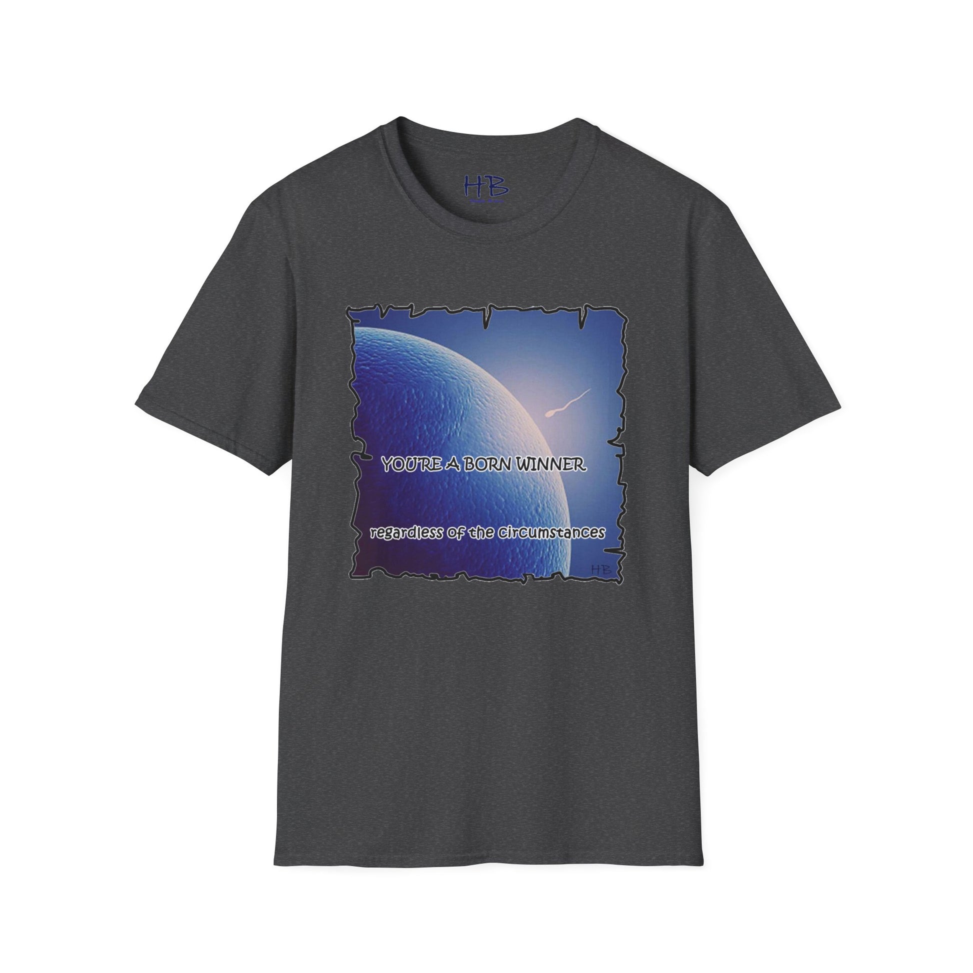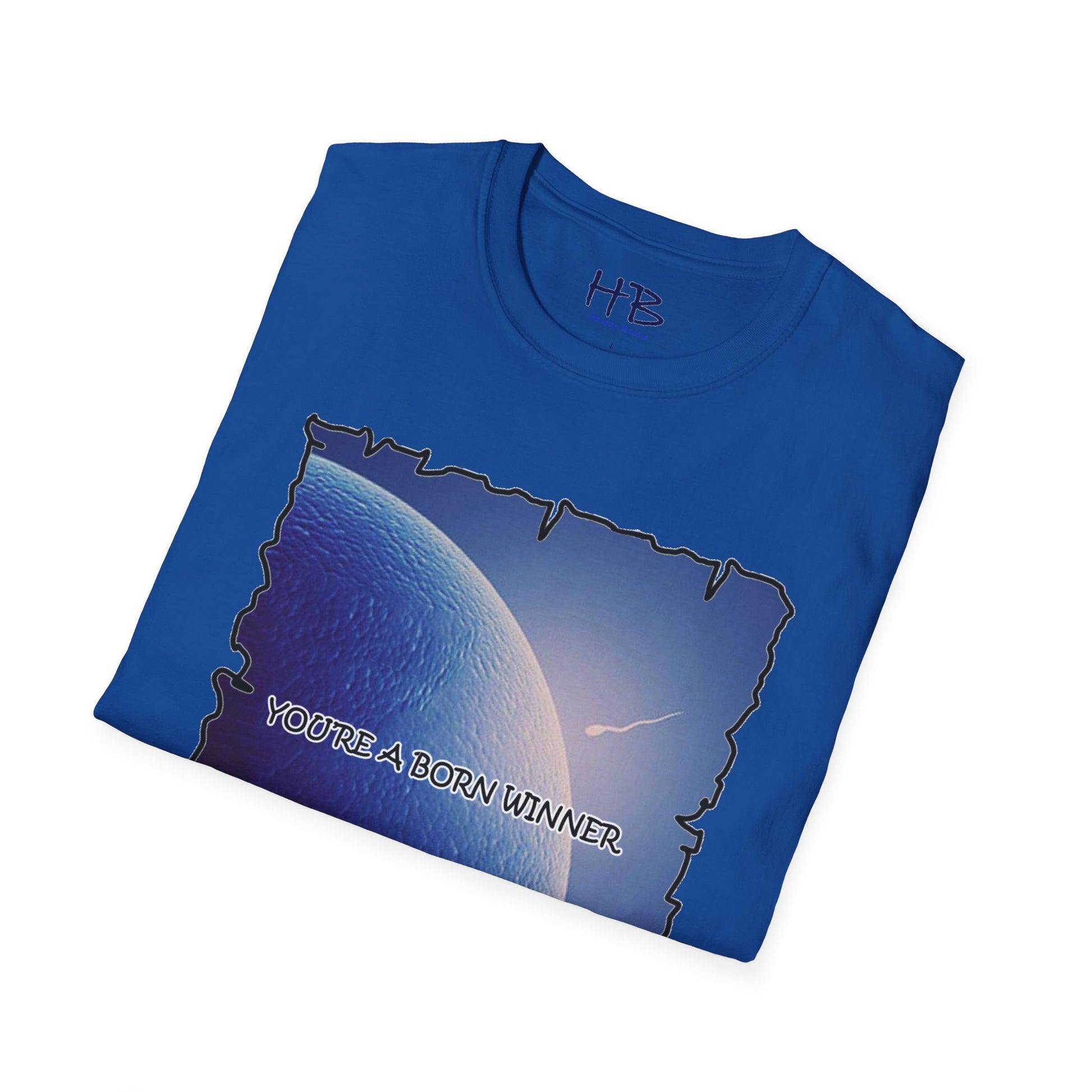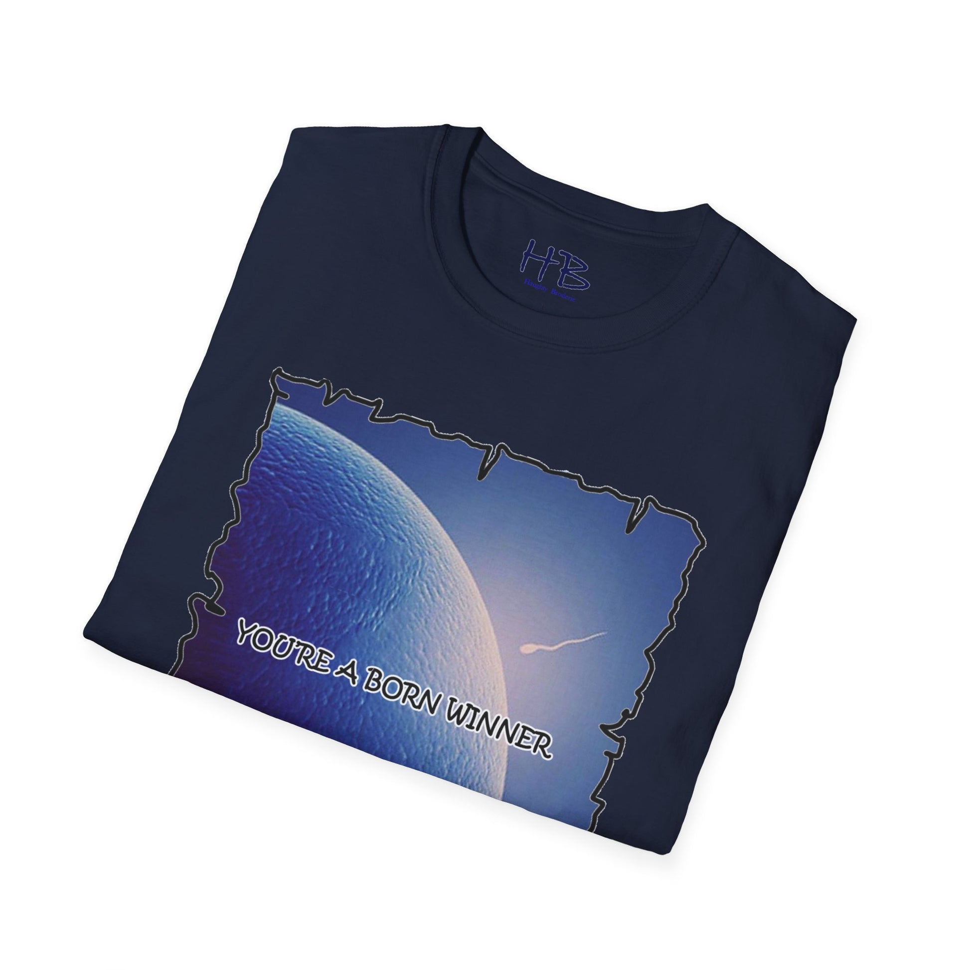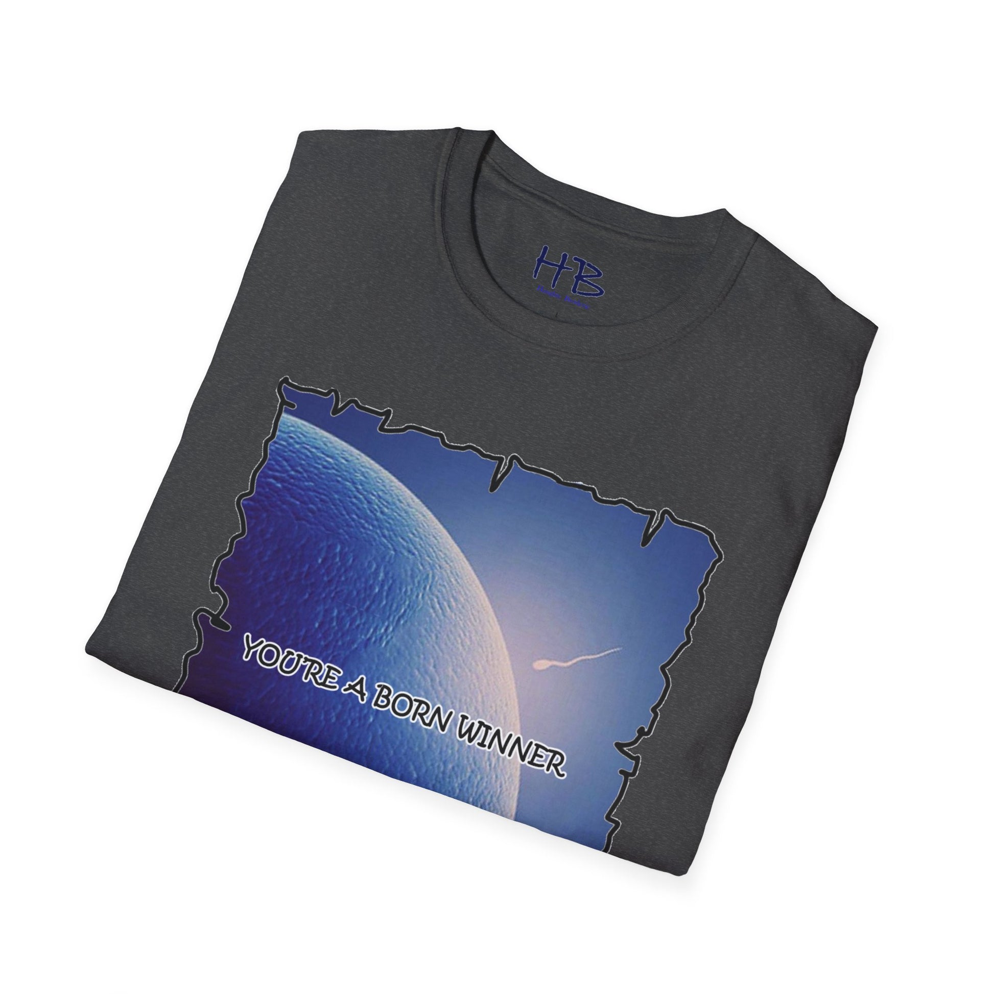 Introducing our extraordinary tee shirt, featuring a thought-provoking image that encapsulates the miracle of life. Picture a determined spermatozoa approaching the fetal egg, accompanied by the powerful statement, "You're a born winner, regardless of the circumstances."
