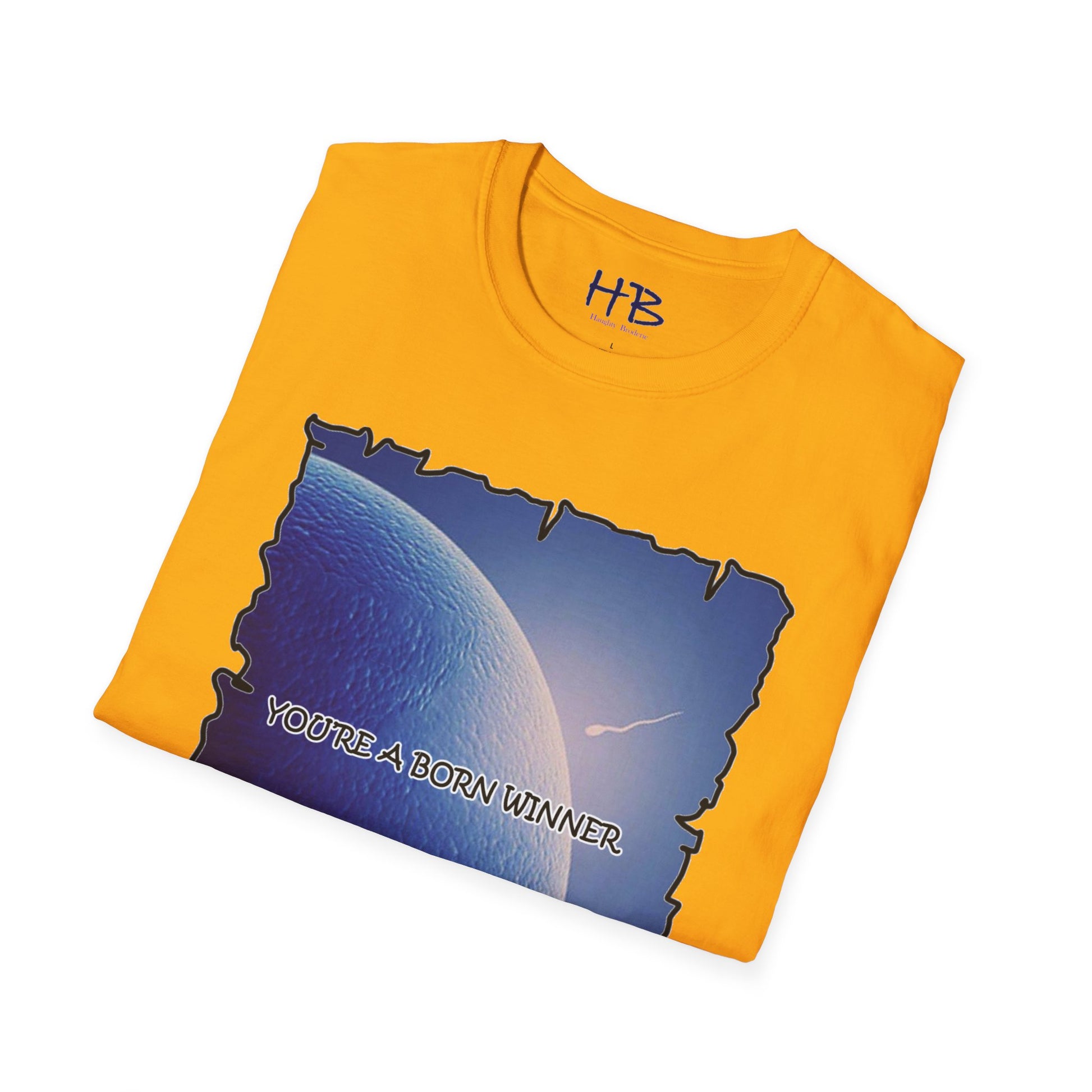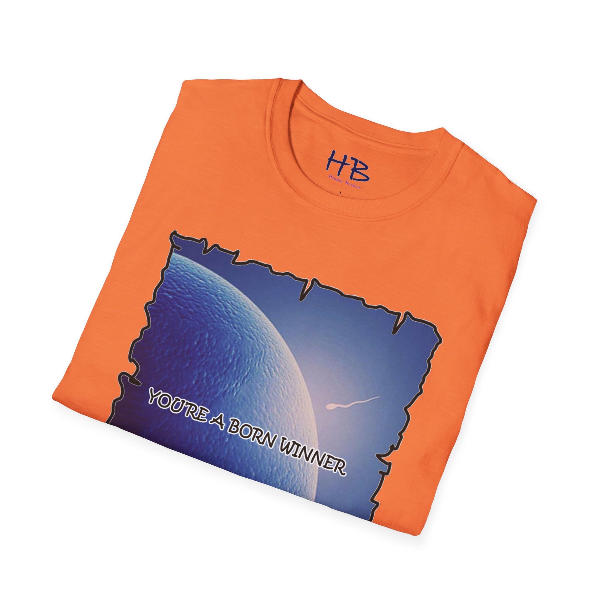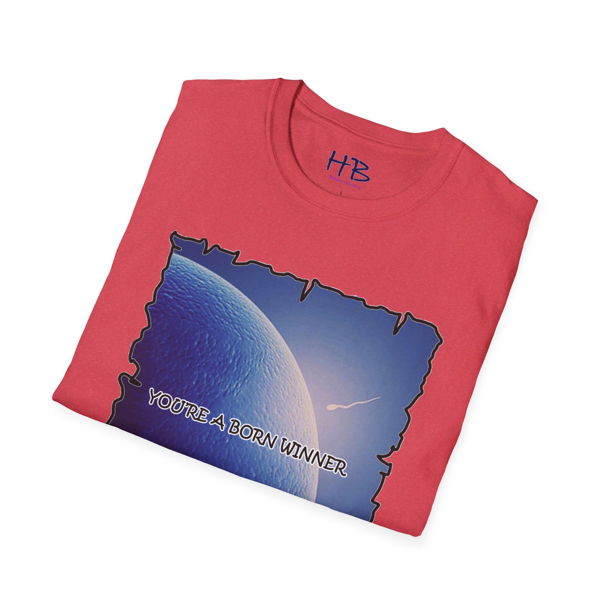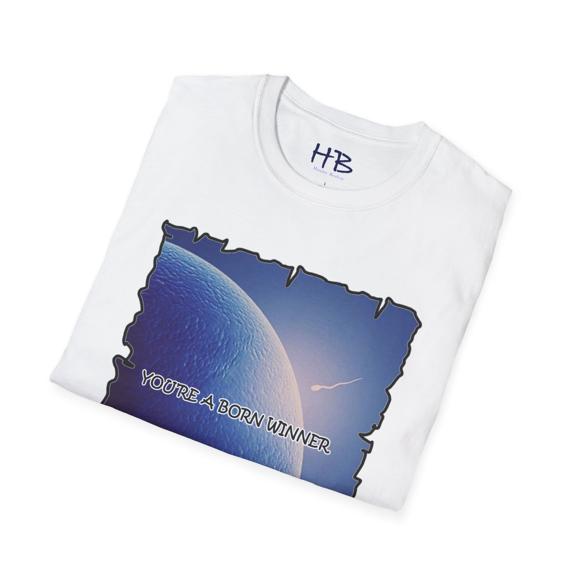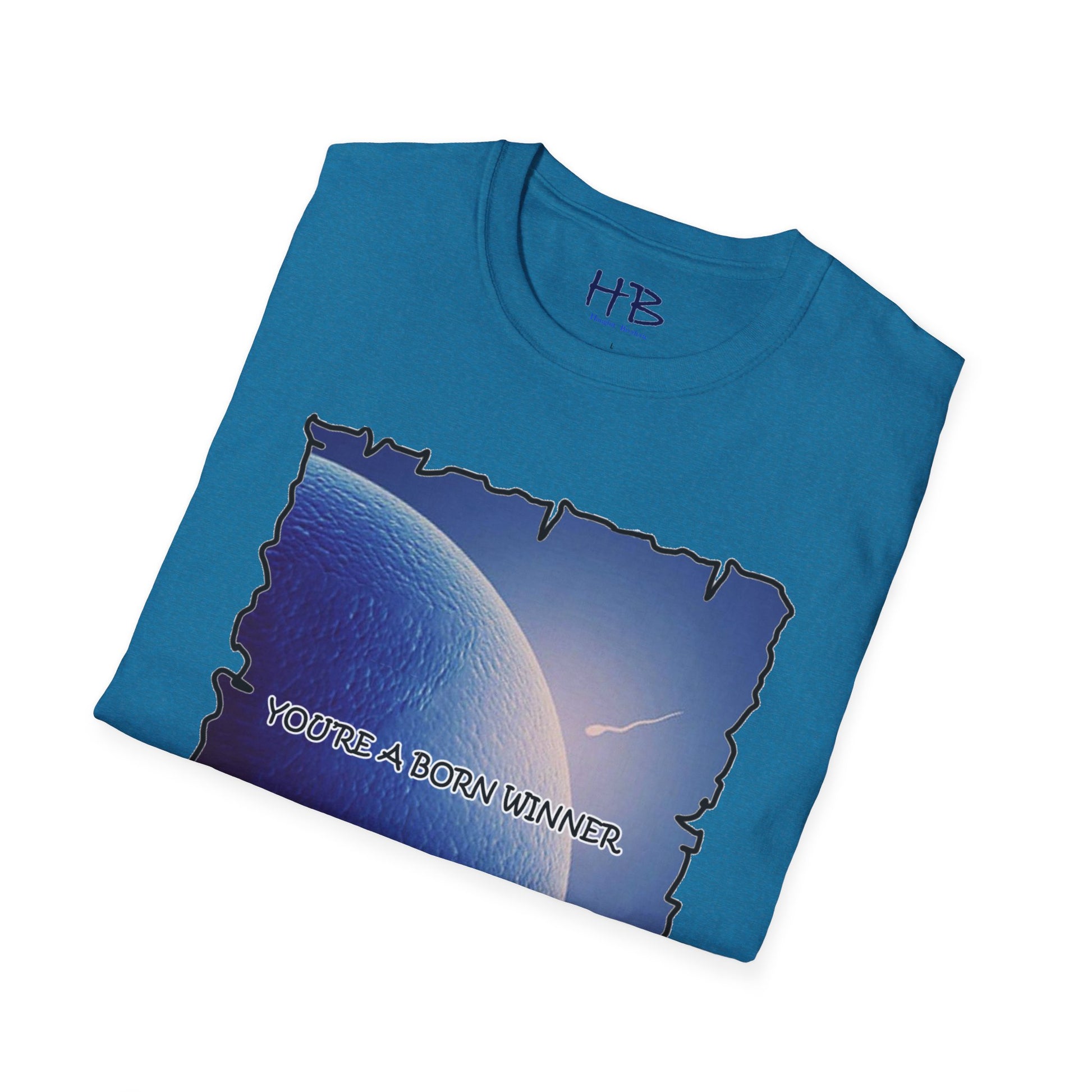 Introducing our extraordinary tee shirt, featuring a thought-provoking image that encapsulates the miracle of life. Picture a determined spermatozoa approaching the fetal egg, accompanied by the powerful statement, "You're a born winner, regardless of the circumstances."