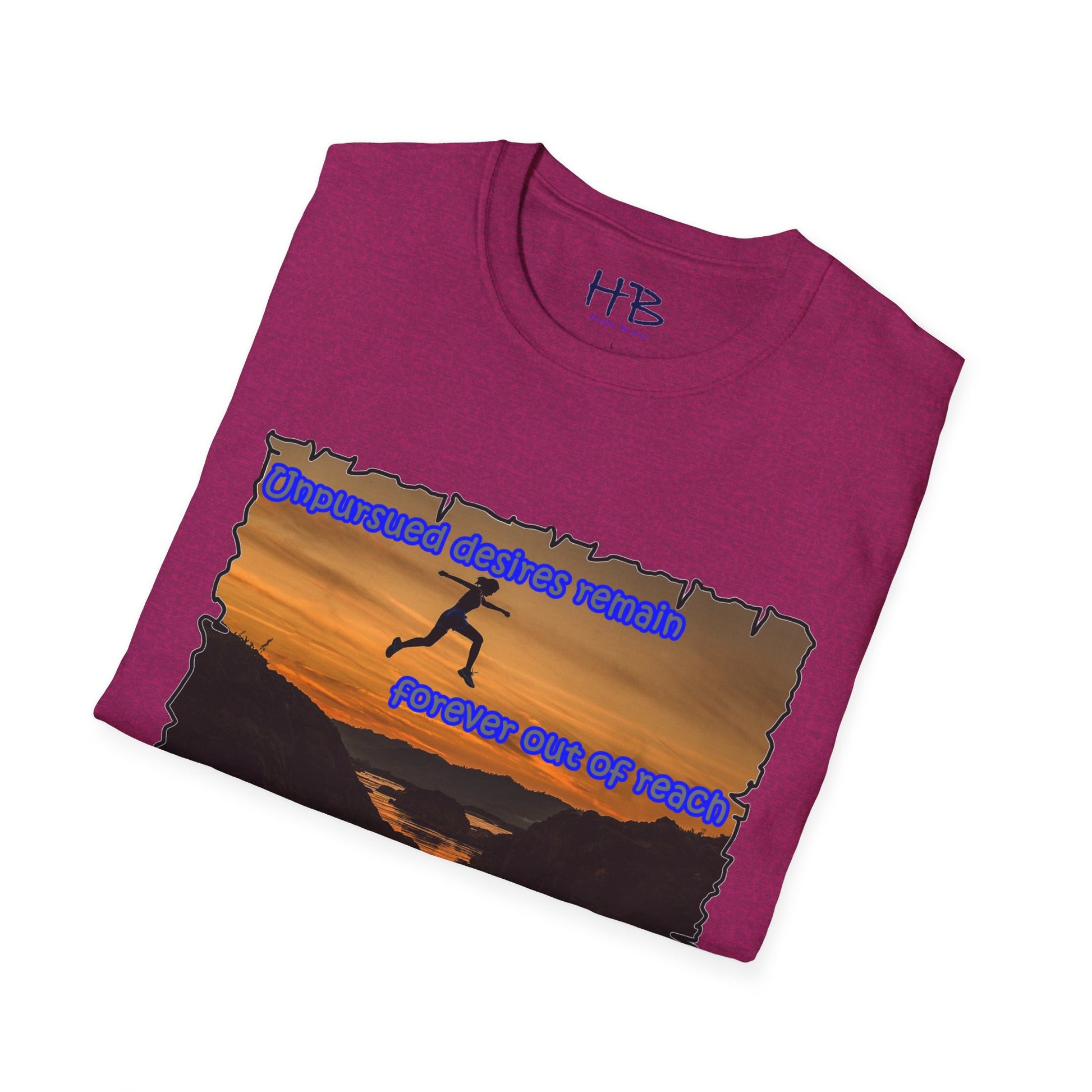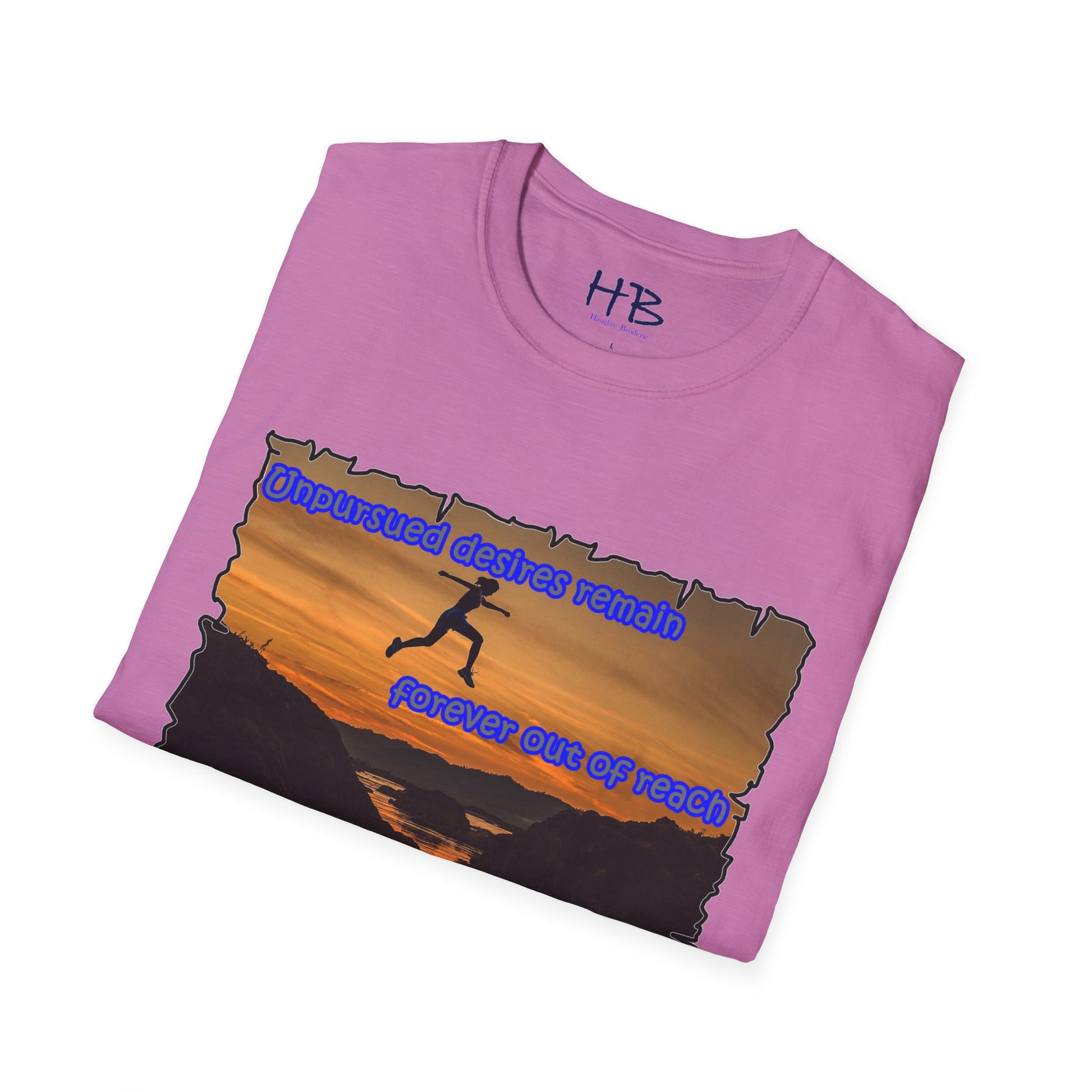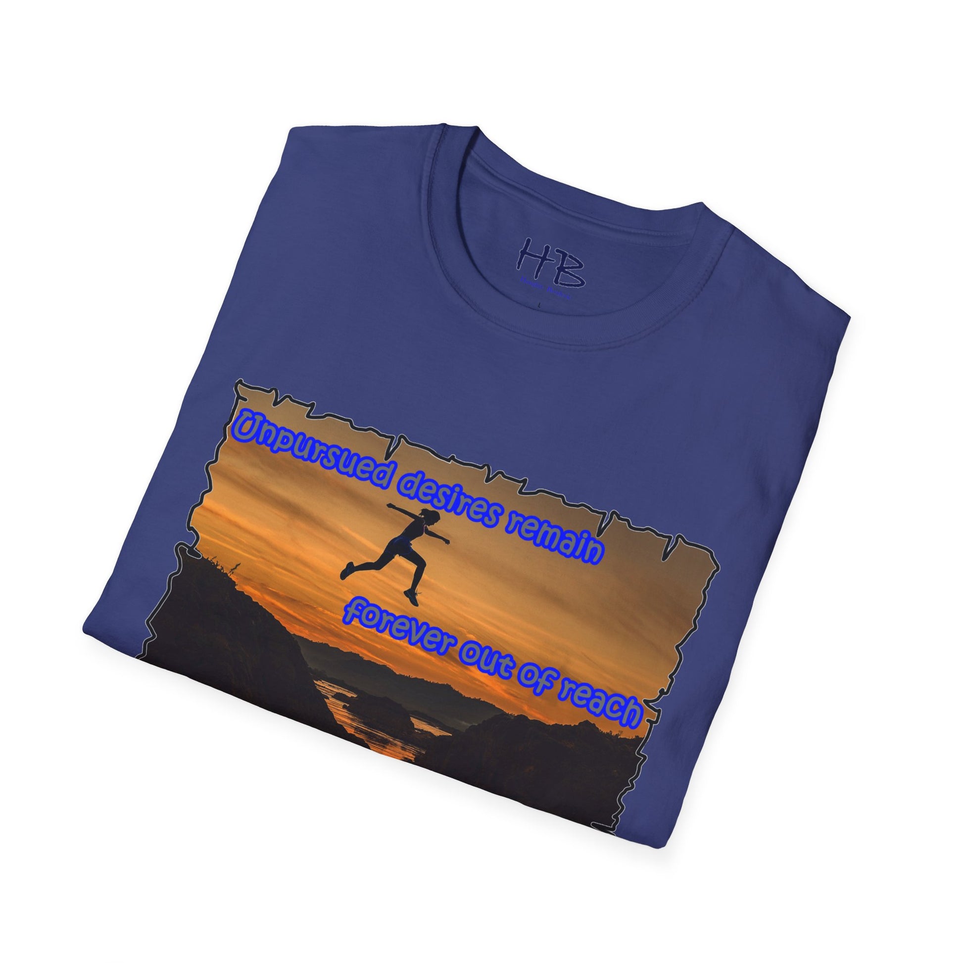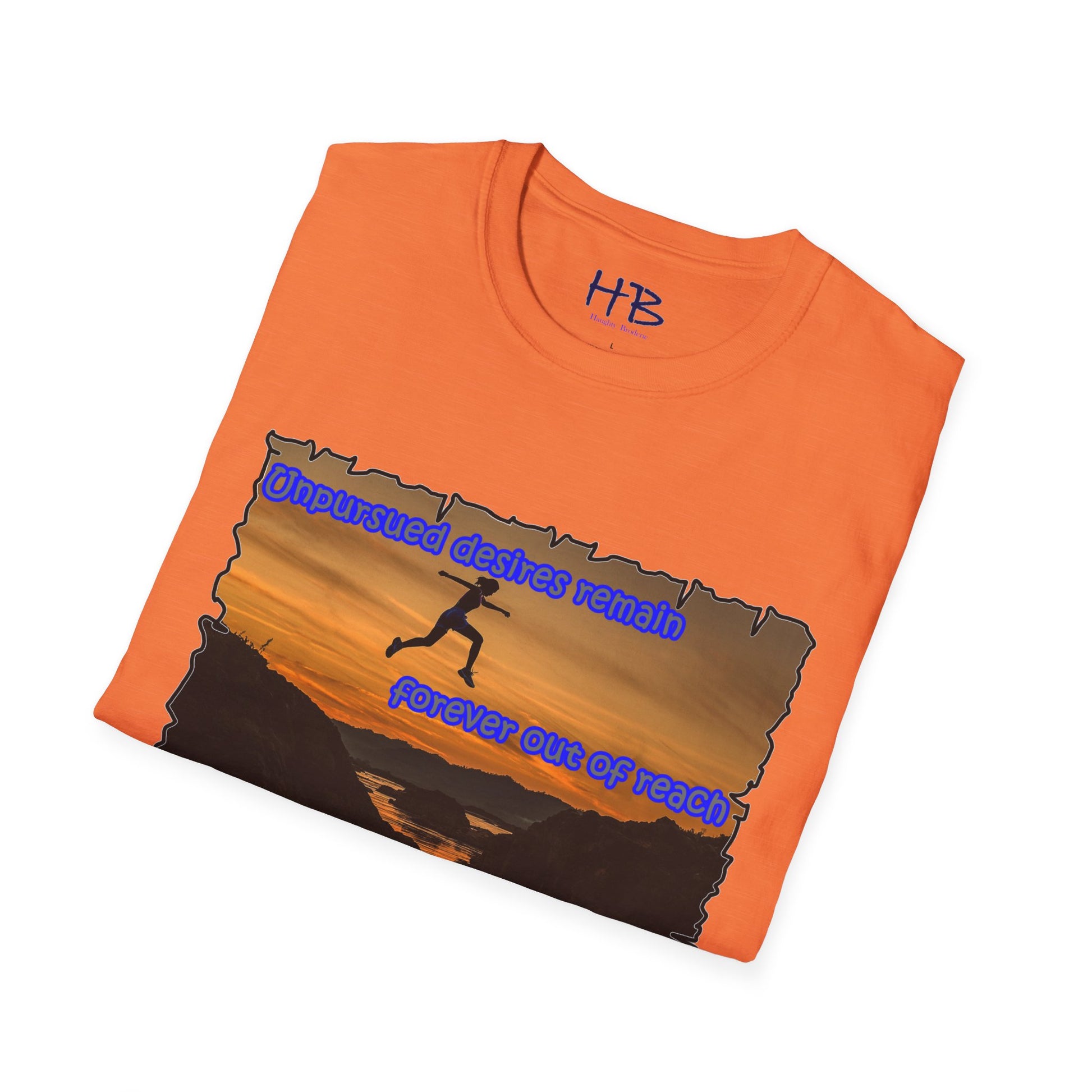Introducing our captivating garment featuring an awe-inspiring image set against a vibrant orange-hued sky. The picture portrays a spirited woman donned in sportswear, gracefully leaping from one rock to another, embodying the essence of determination and ambition. Accompanying this awe-inspiring visual is a powerful declaration: "Unpursued desires remain forever out of reach."
