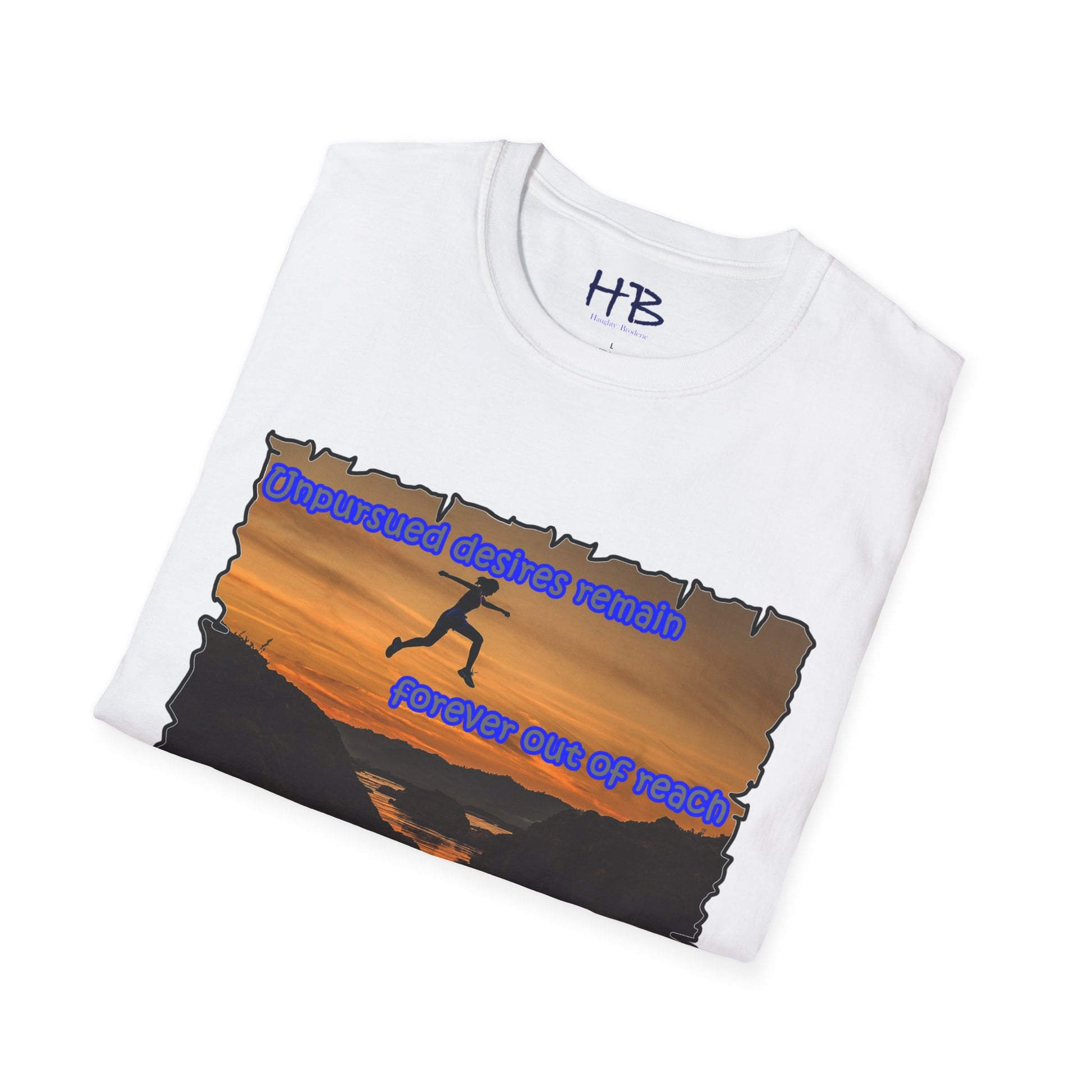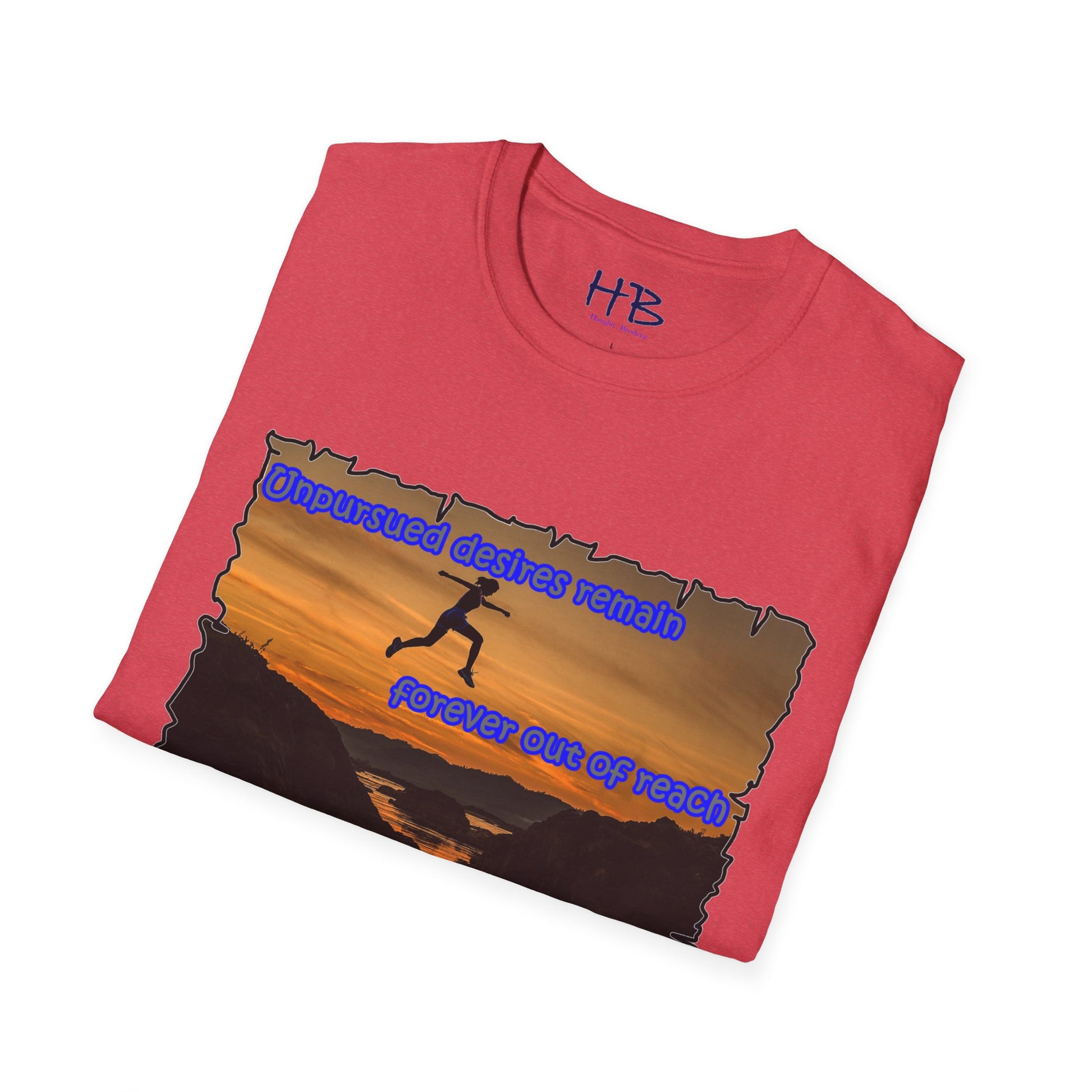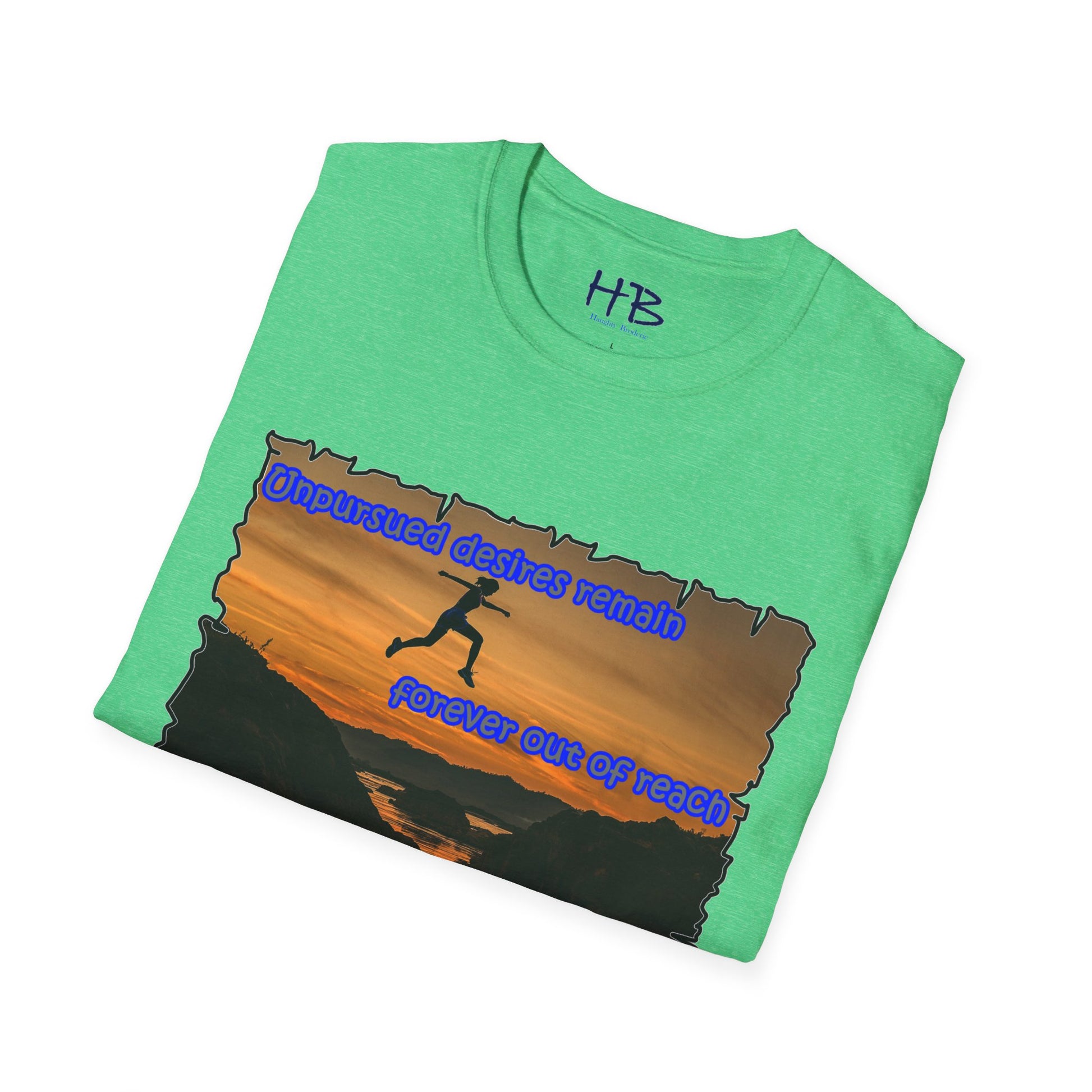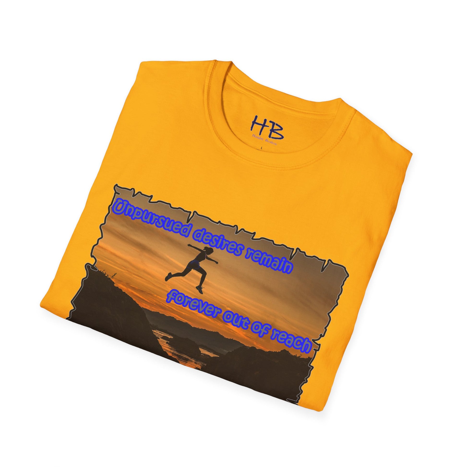 Introducing our captivating garment featuring an awe-inspiring image set against a vibrant orange-hued sky. The picture portrays a spirited woman donned in sportswear, gracefully leaping from one rock to another, embodying the essence of determination and ambition. Accompanying this awe-inspiring visual is a powerful declaration: "Unpursued desires remain forever out of reach."