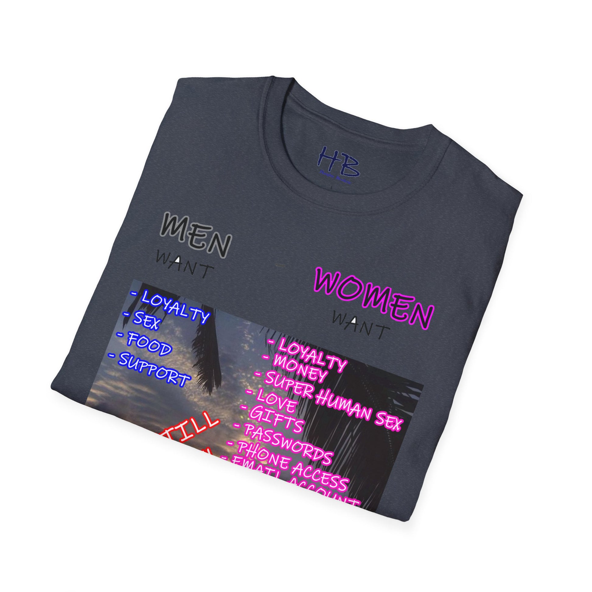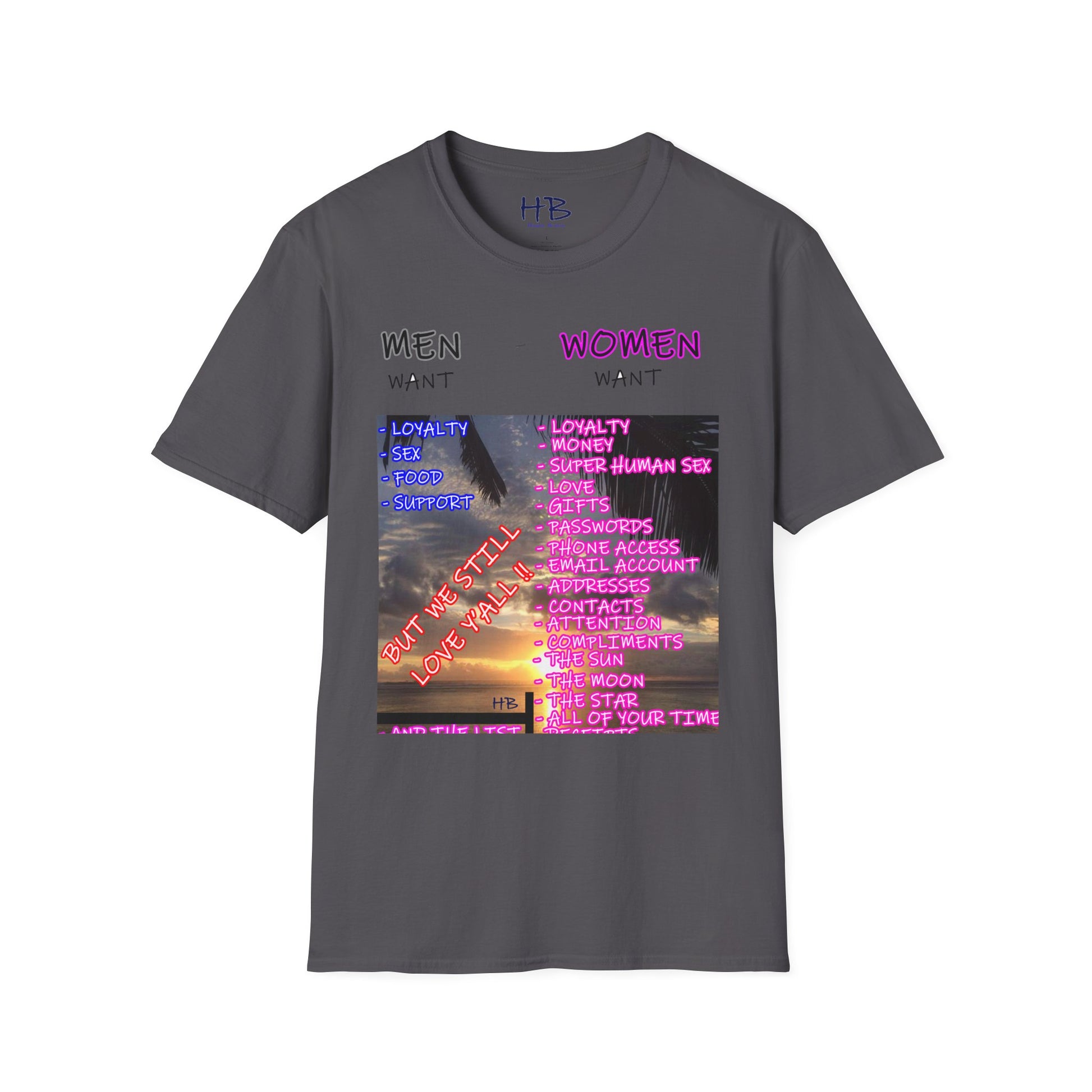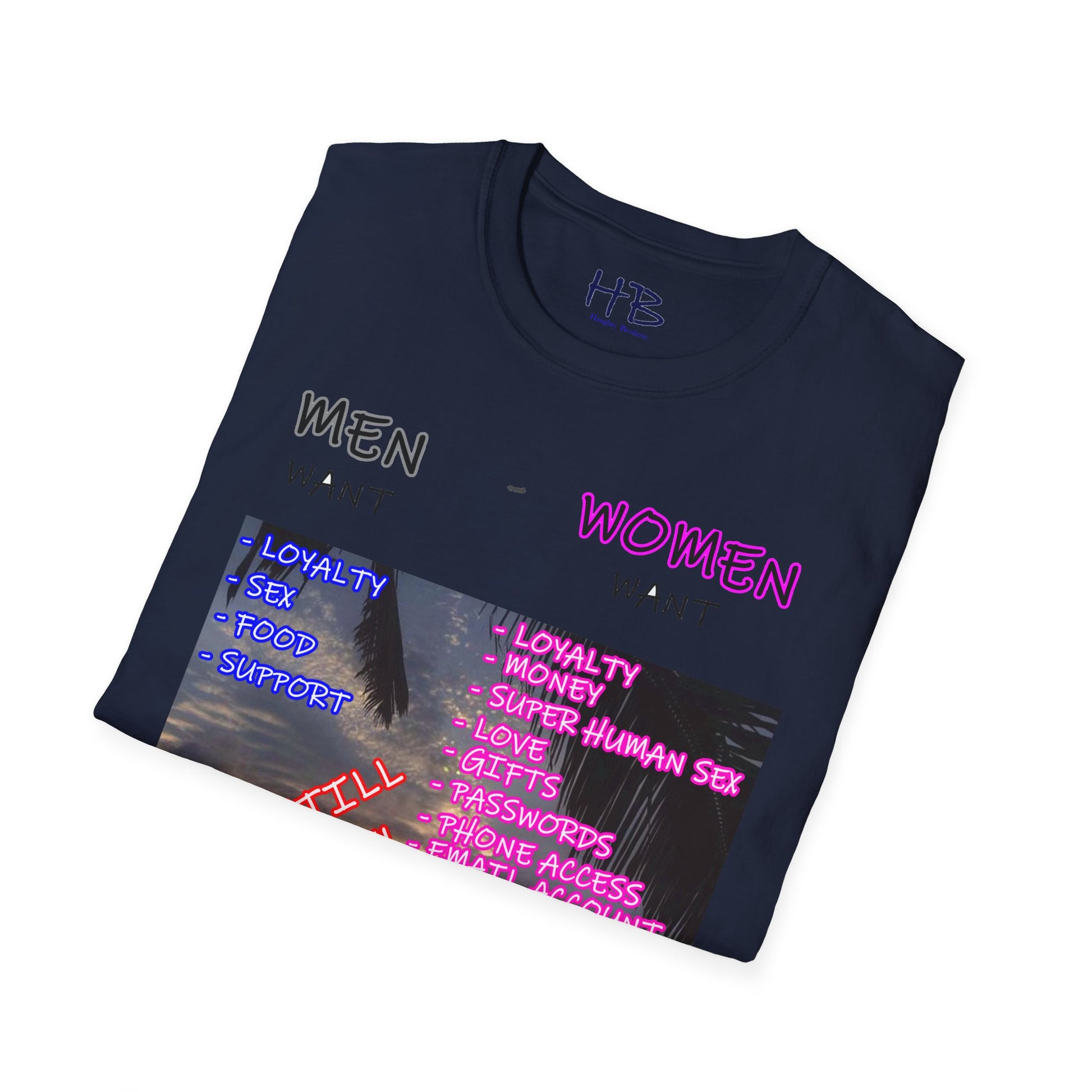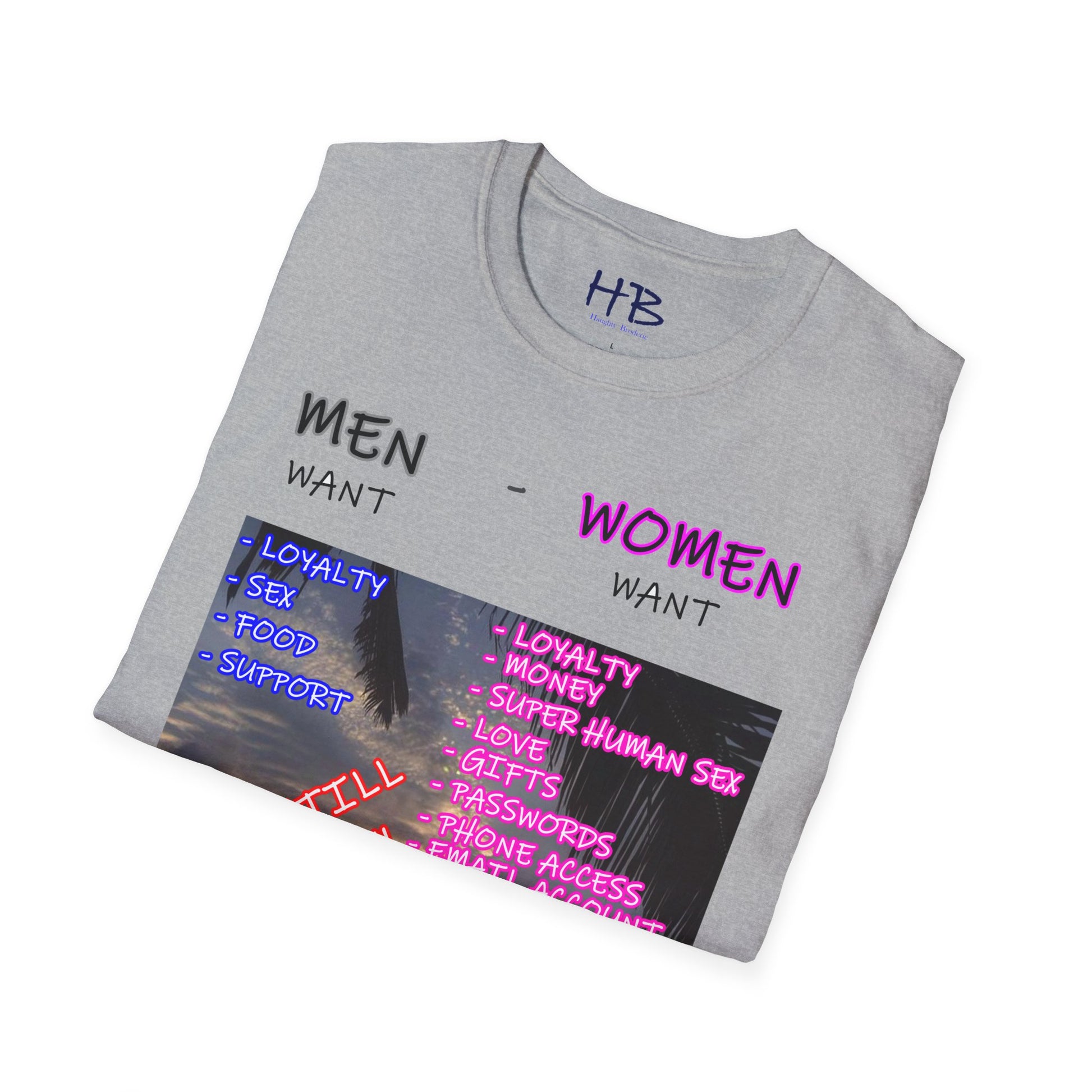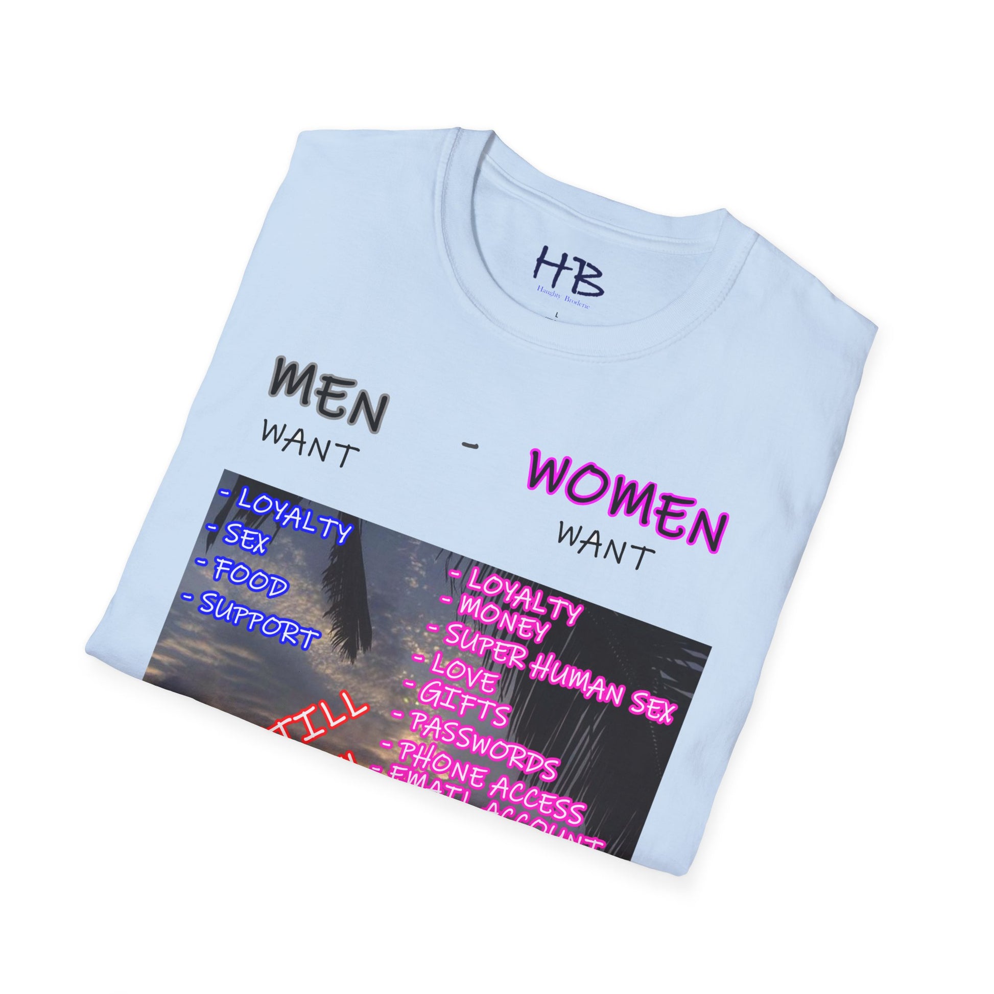 Introducing our hilarious yet thought-provoking tee shirt featuring a clever image that perfectly captures the contrasting desires of men and women. This tee shirt showcases two lists, symbolizing the wants of both genders. On the left side, we have what "MEN WANT," and on the right side, we have what "WOMEN WANT."
