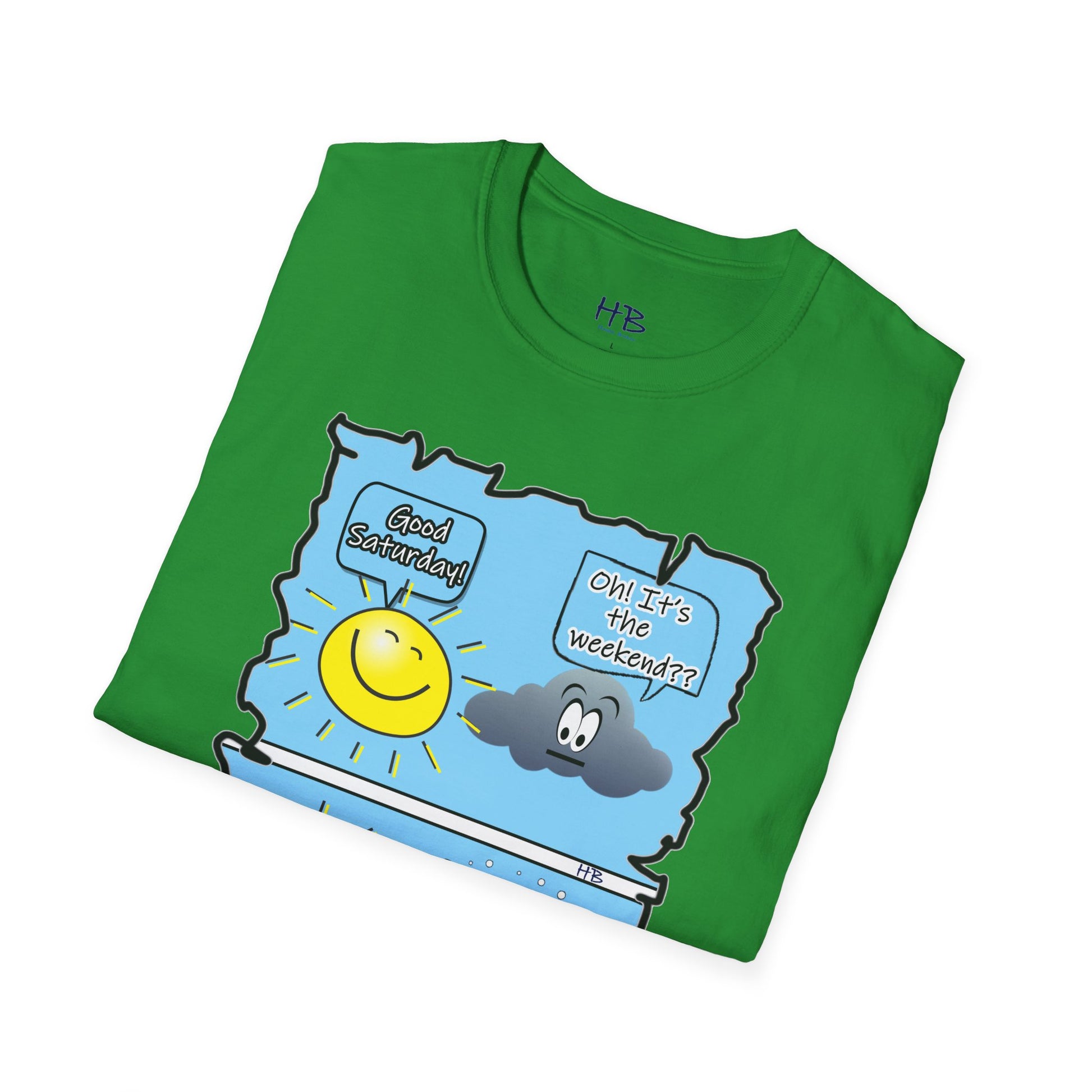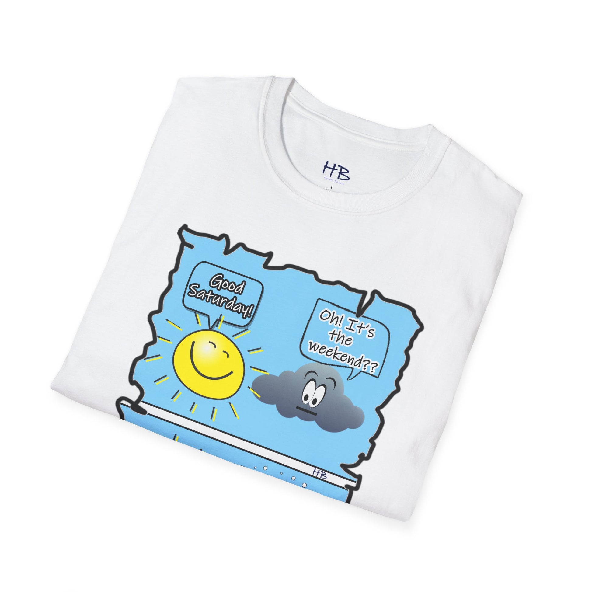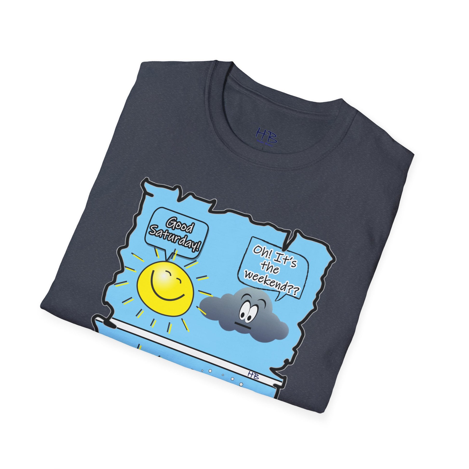 This tee shirt is not just an artistic expression; it's a relatable commentary on the unpredictability of weekends. How many times have we eagerly awaited the sunshine, only to have our plans dampened by unexpected rain? It's a humorous take on the irony that life often throws our way.