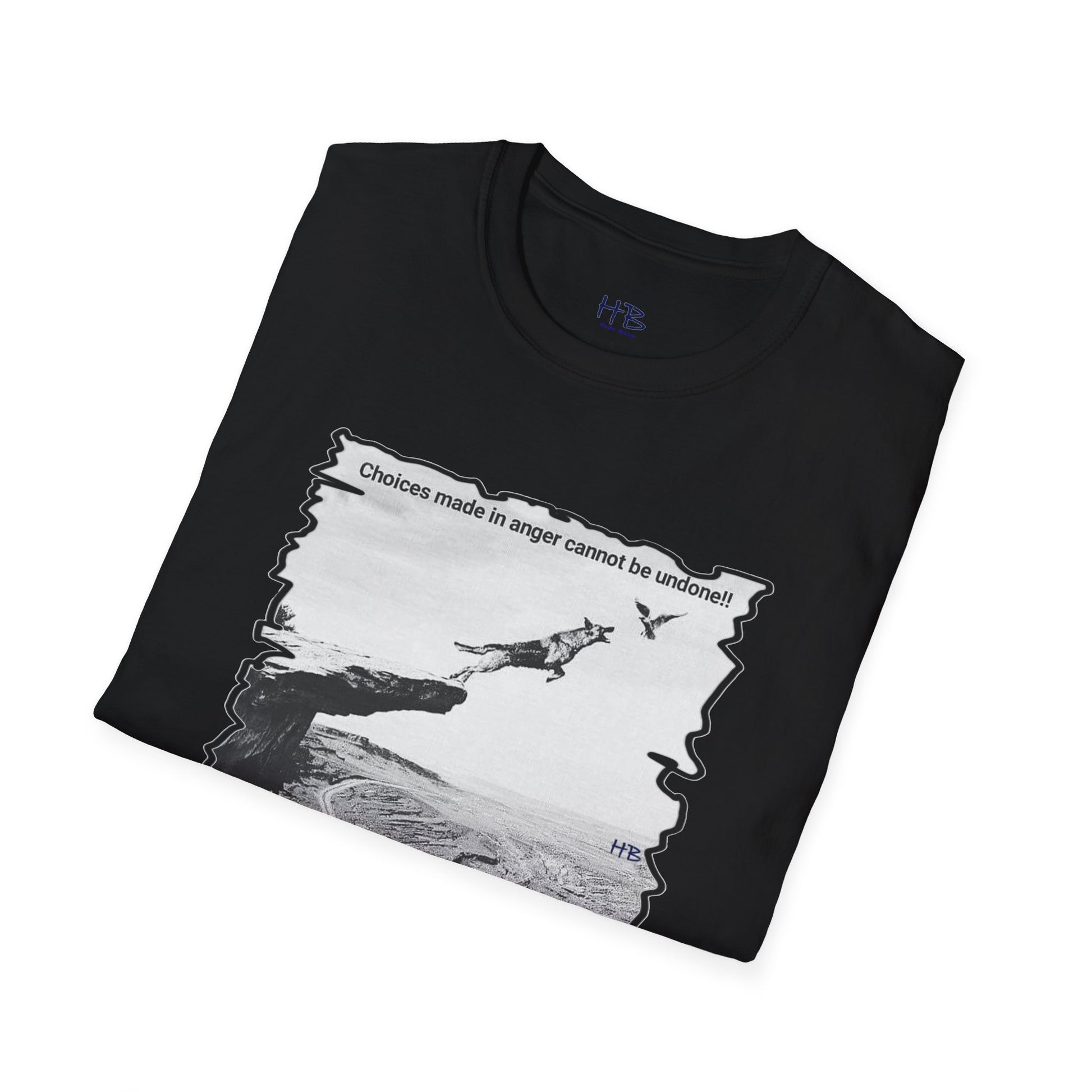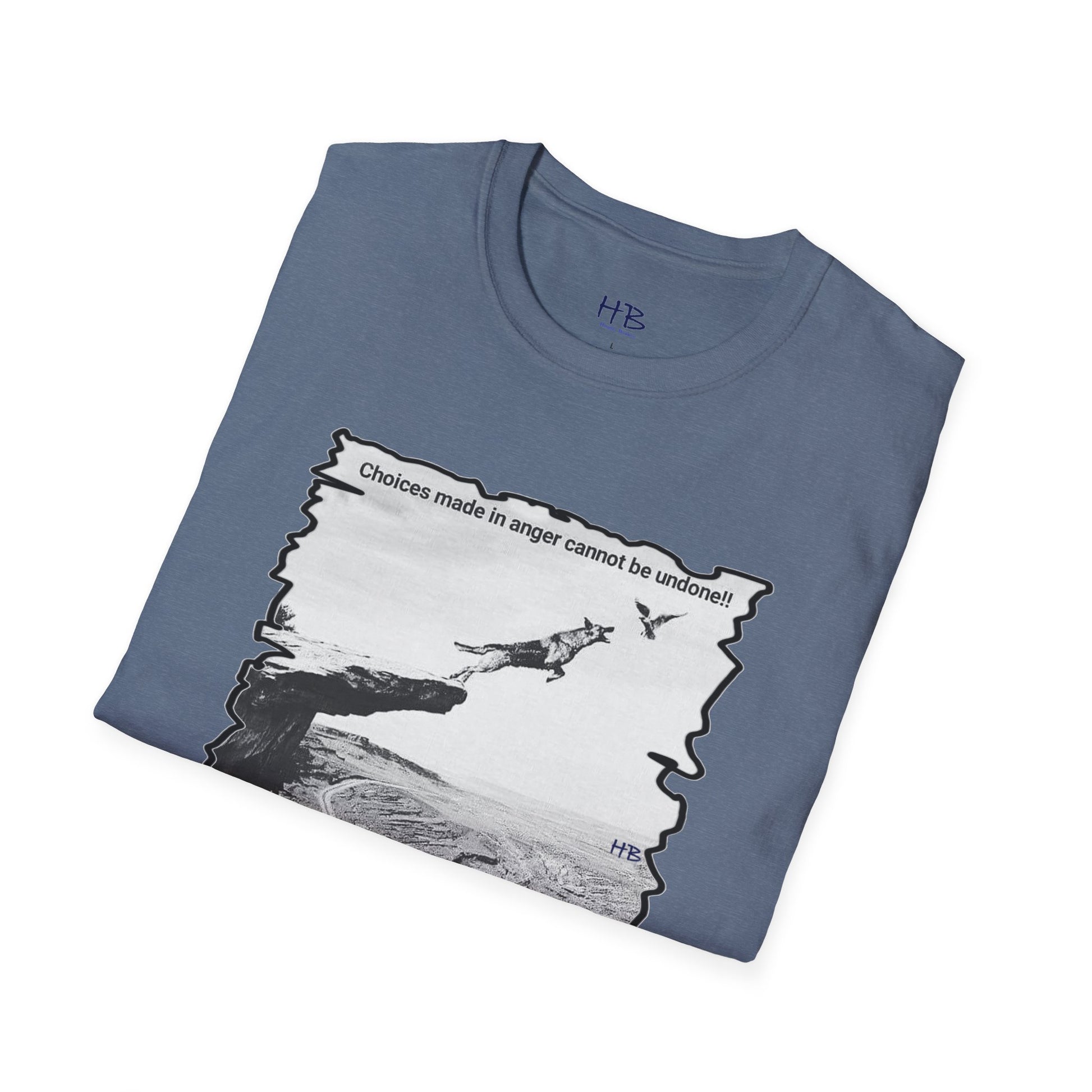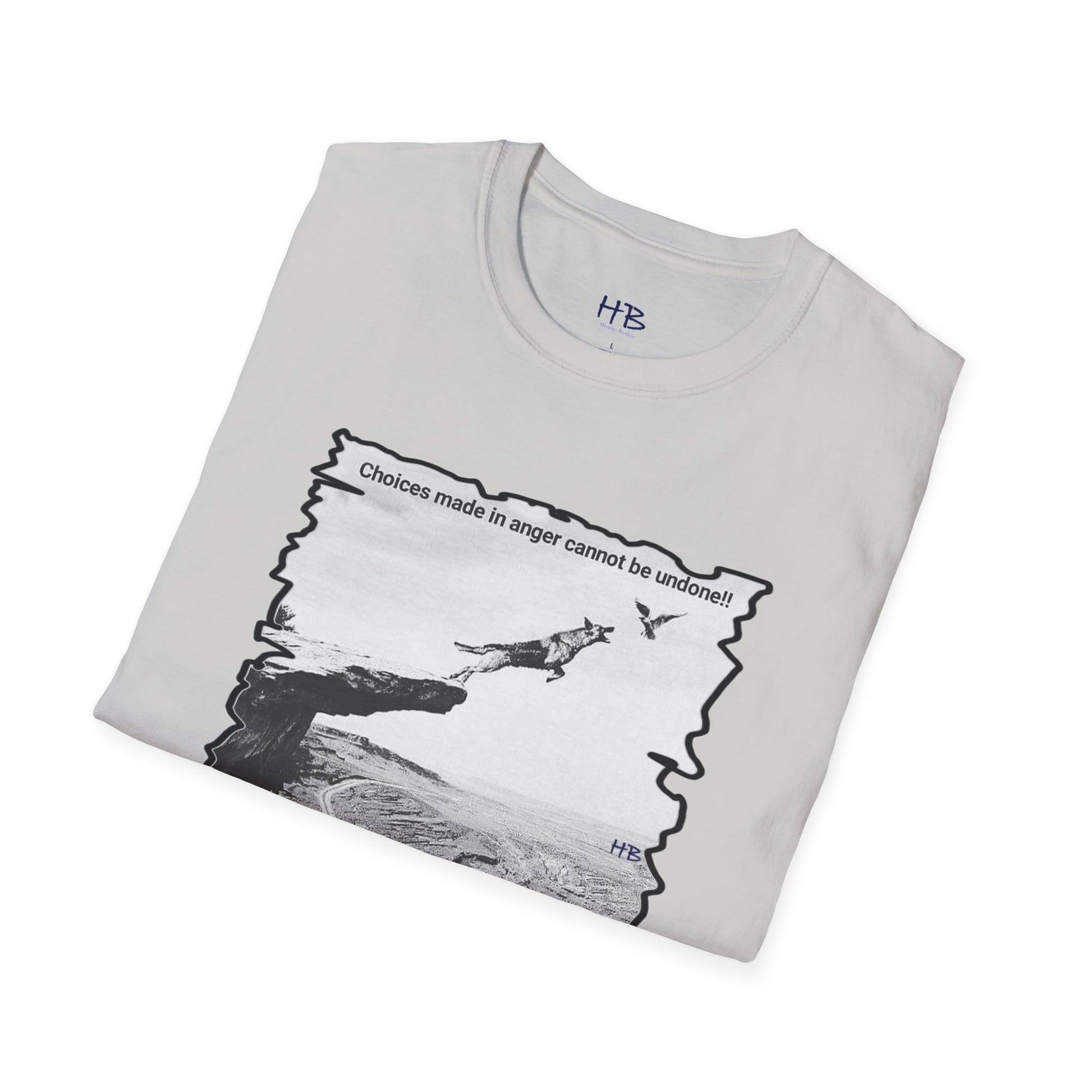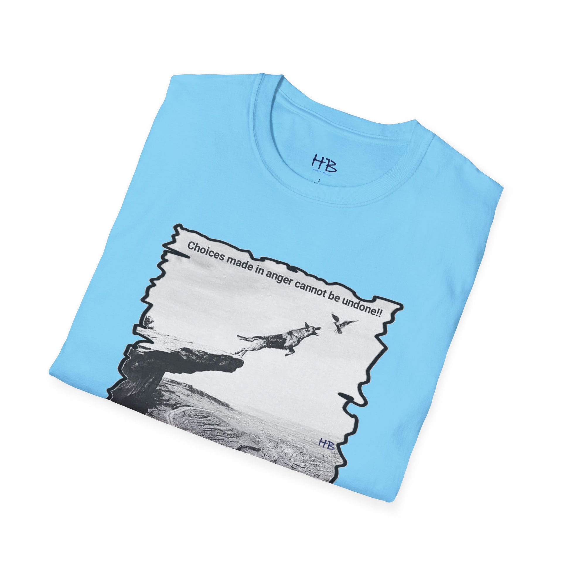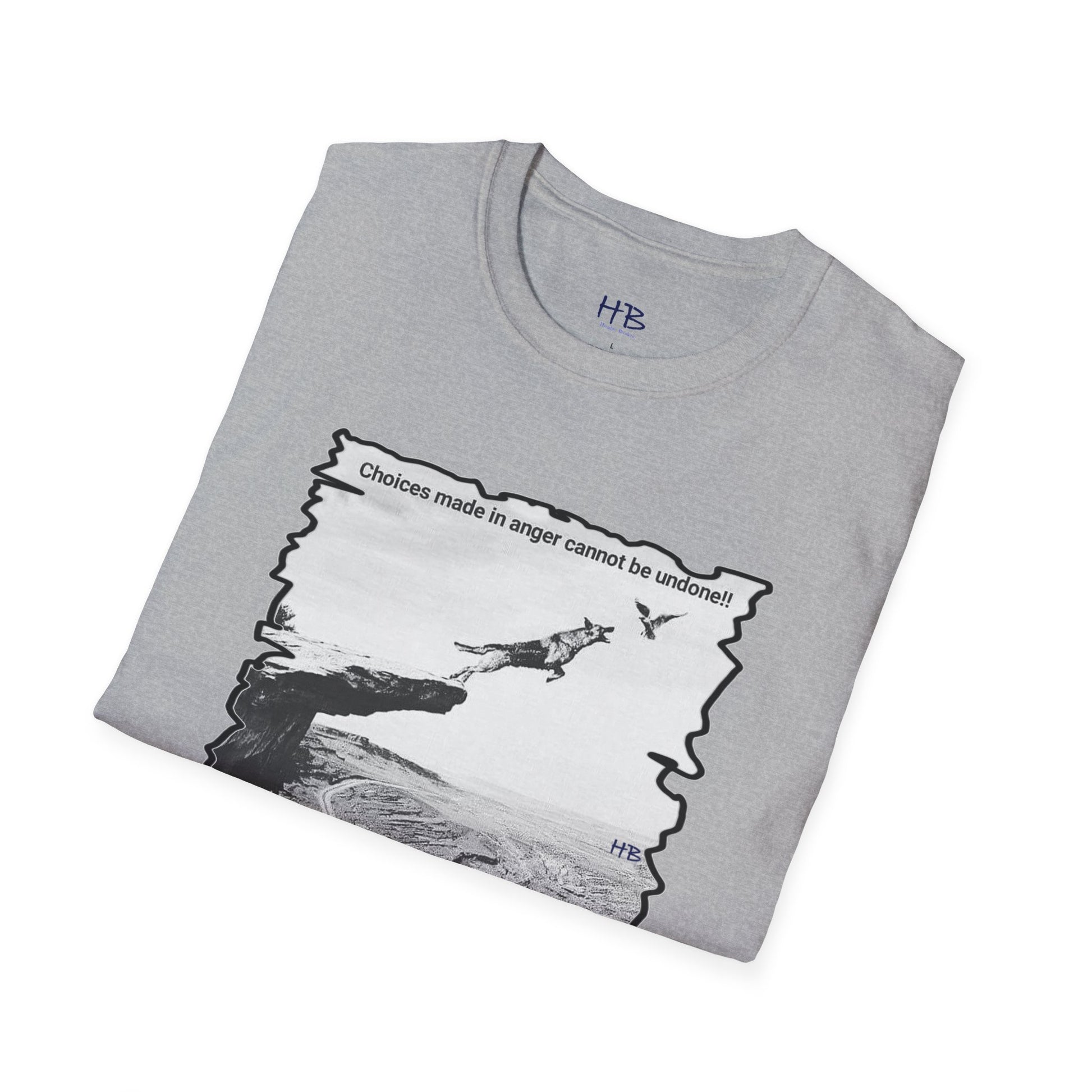 Introducing our latest tee shirt design that features an image of a daring dog leaping off a cliff in an attempt to catch a bird. The bold and powerful statement "Choices made in anger cannot be undone!" is written in bold letters underneath the image. This shirt serves as a great reminder to think twice before making hasty decisions in the heat of the moment, as the consequences may be irreversible. Don't miss out on the opportunity to make a statement with this unique tee shirt that is sure to turn heads and start conversations!
