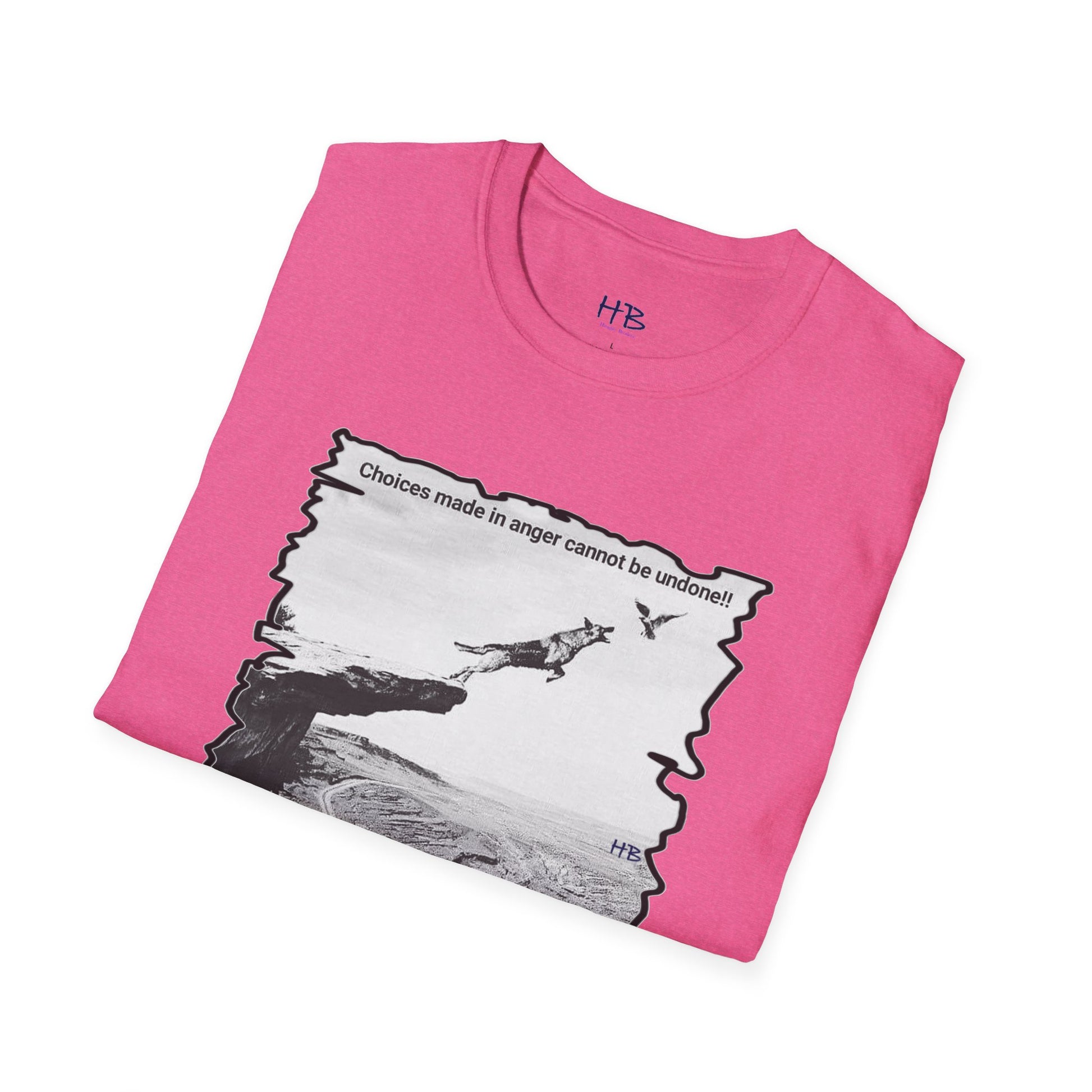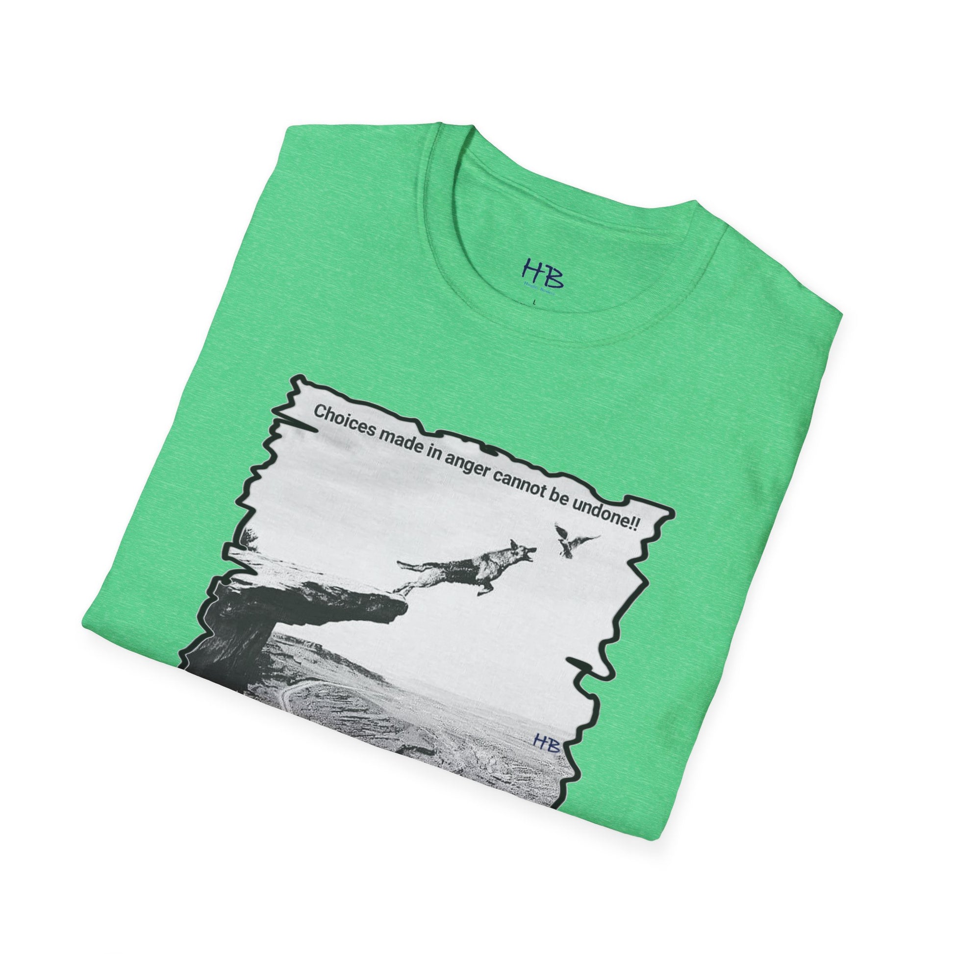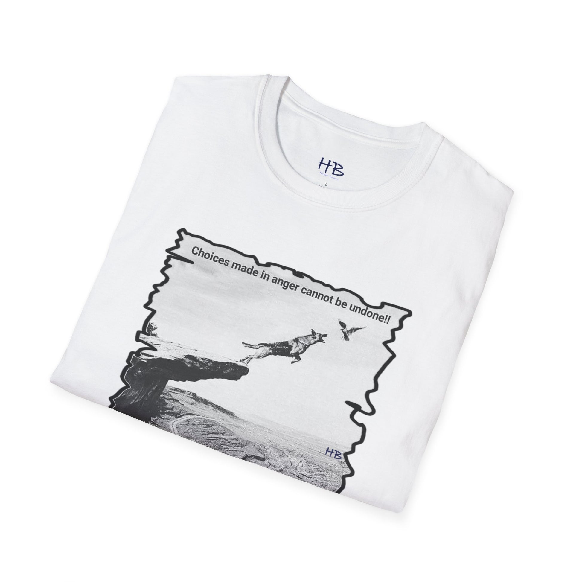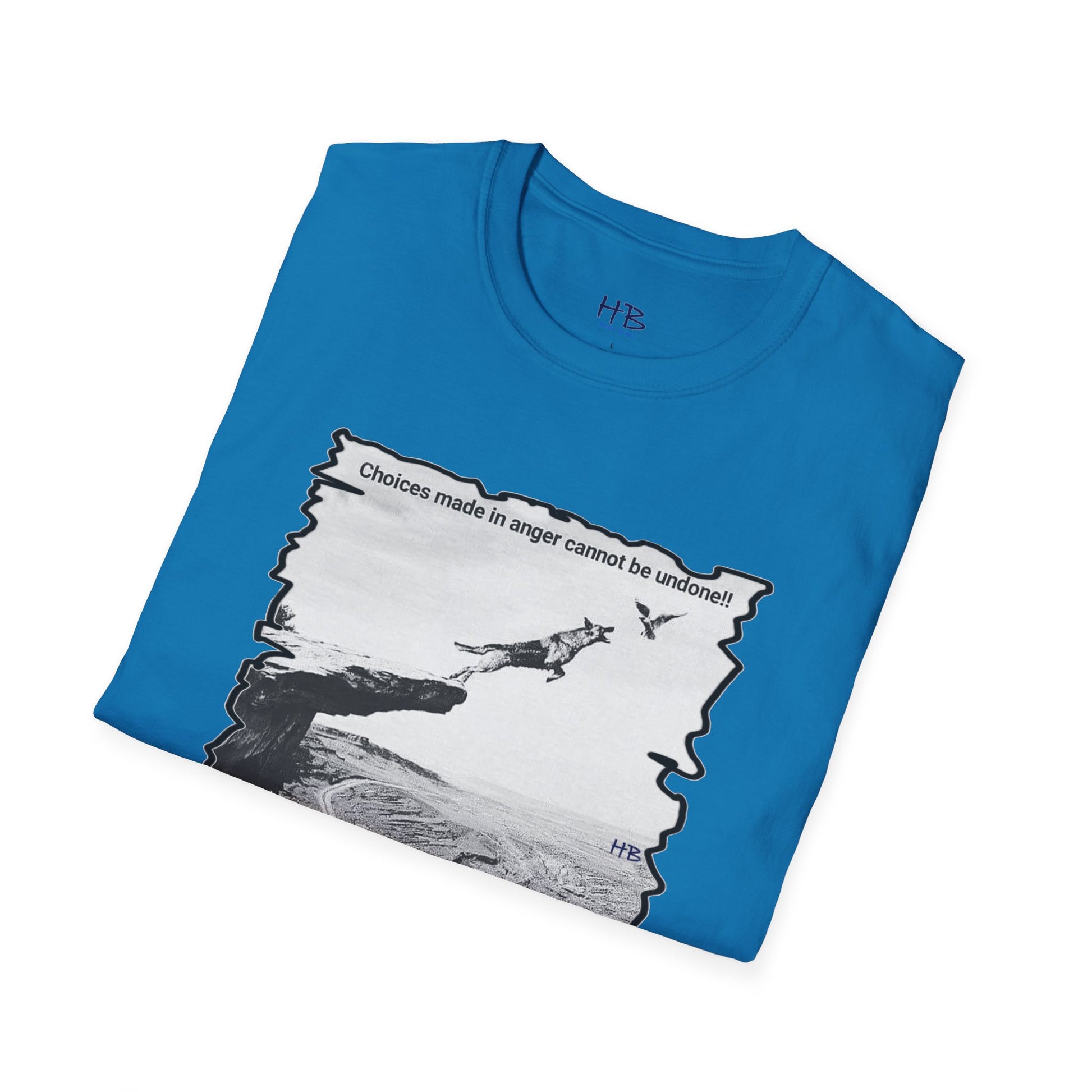 Introducing our latest tee shirt design that features an image of a daring dog leaping off a cliff in an attempt to catch a bird. The bold and powerful statement "Choices made in anger cannot be undone!" is written in bold letters underneath the image. This shirt serves as a great reminder to think twice before making hasty decisions in the heat of the moment, as the consequences may be irreversible. Don't miss out on the opportunity to make a statement with this unique tee shirt that is sure to turn heads and start conversations!