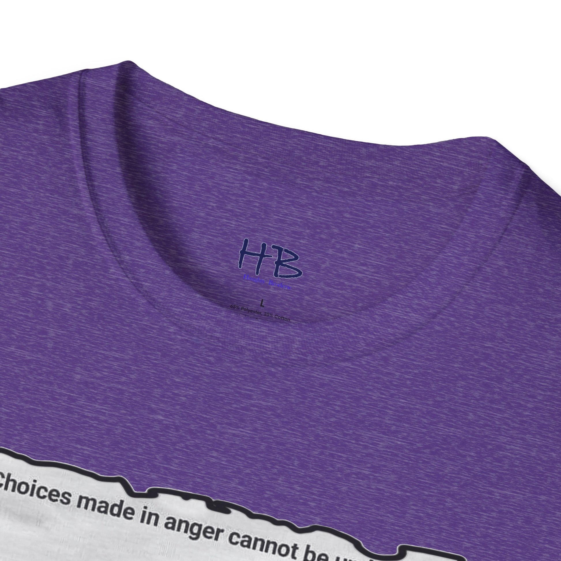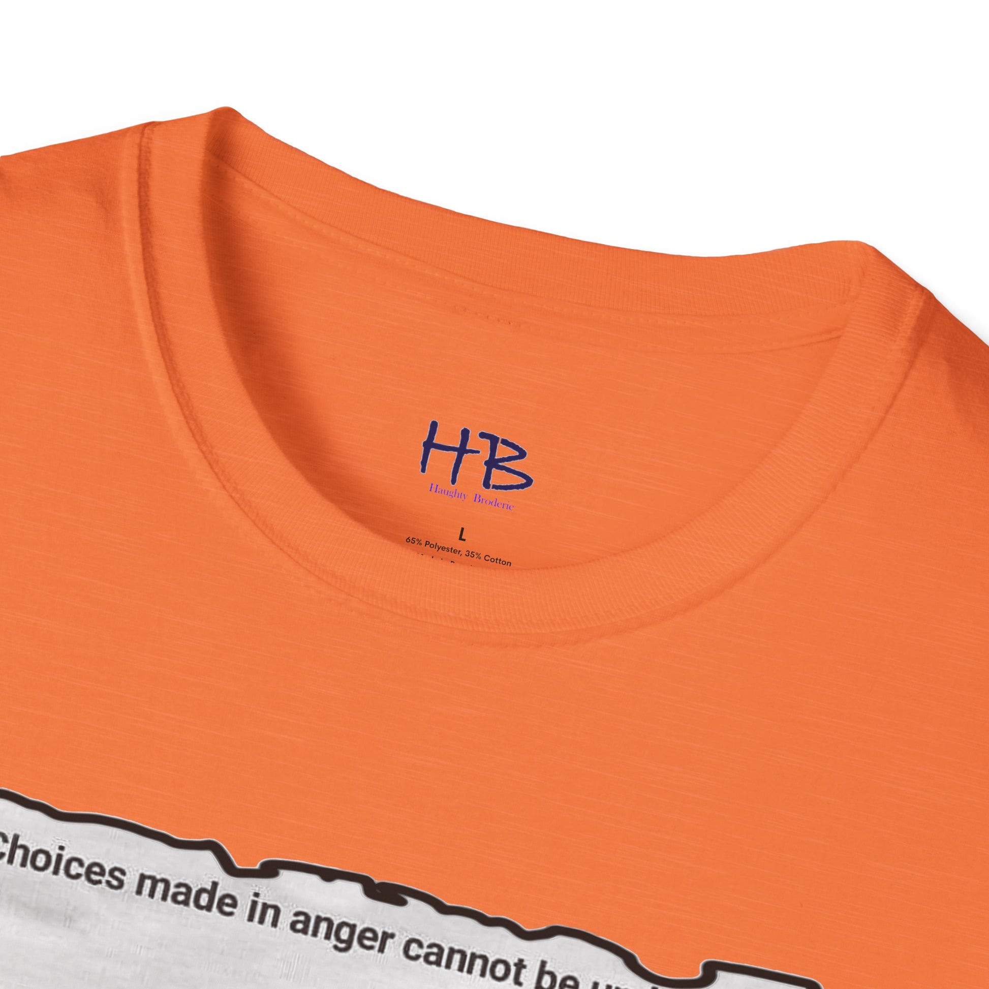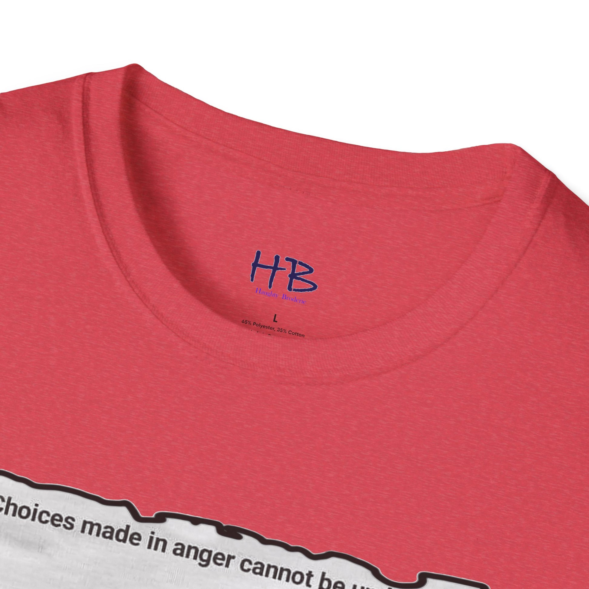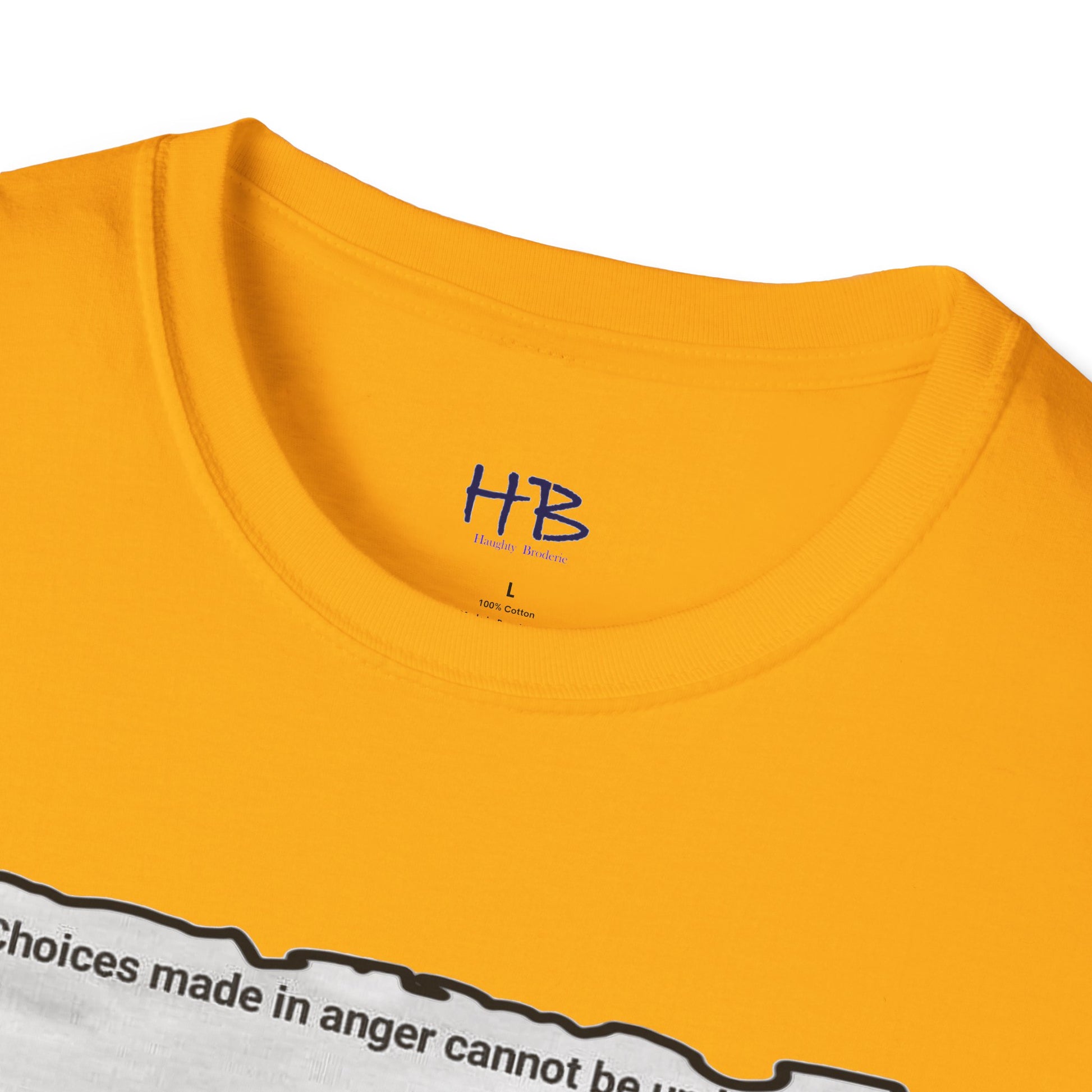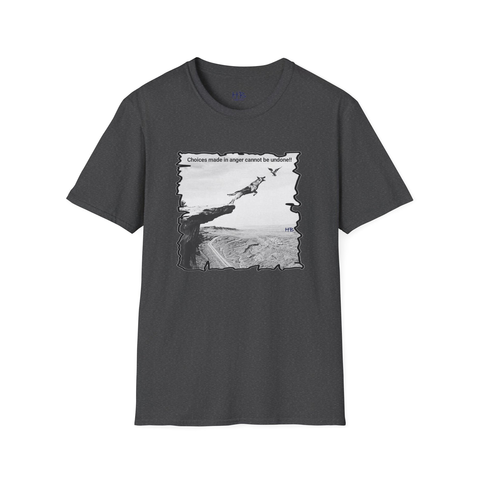 Introducing our latest tee shirt design that features an image of a daring dog leaping off a cliff in an attempt to catch a bird. The bold and powerful statement "Choices made in anger cannot be undone!" is written in bold letters underneath the image. This shirt serves as a great reminder to think twice before making hasty decisions in the heat of the moment, as the consequences may be irreversible. Don't miss out on the opportunity to make a statement with this unique tee shirt that is sure to turn heads and start conversations!