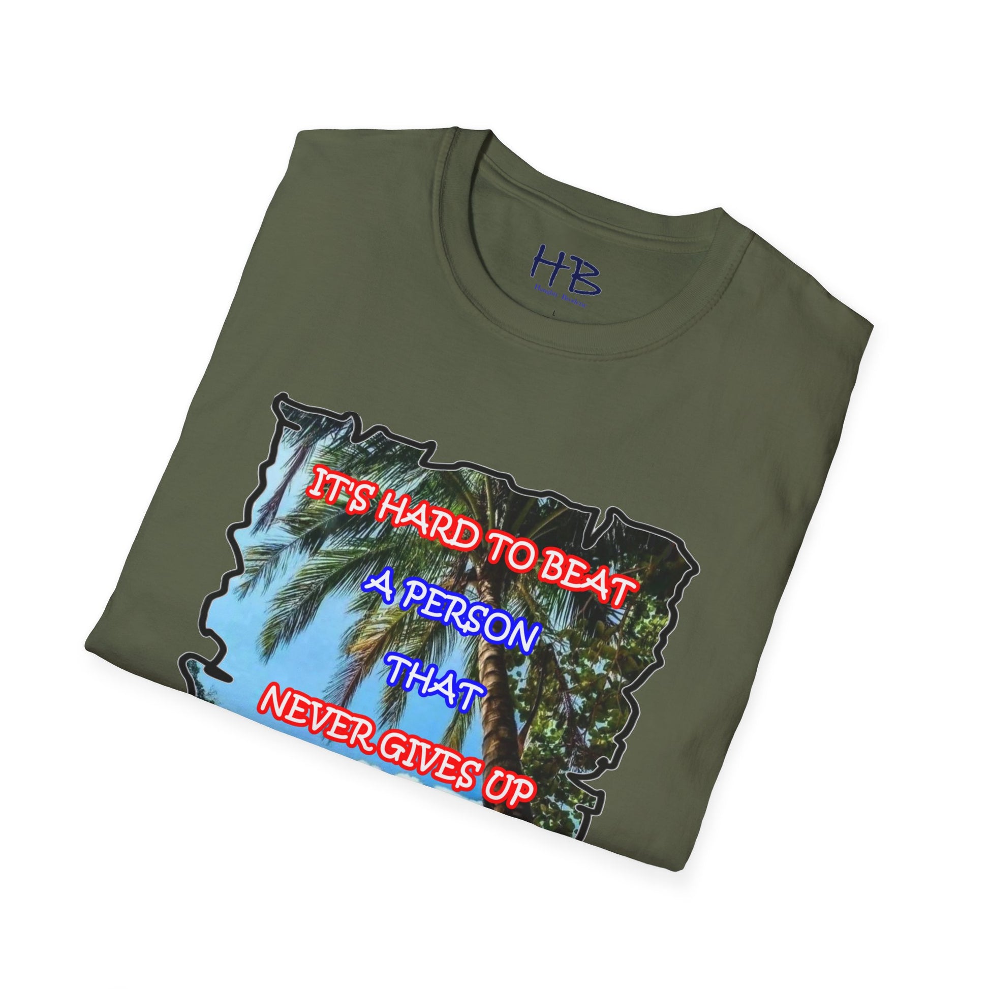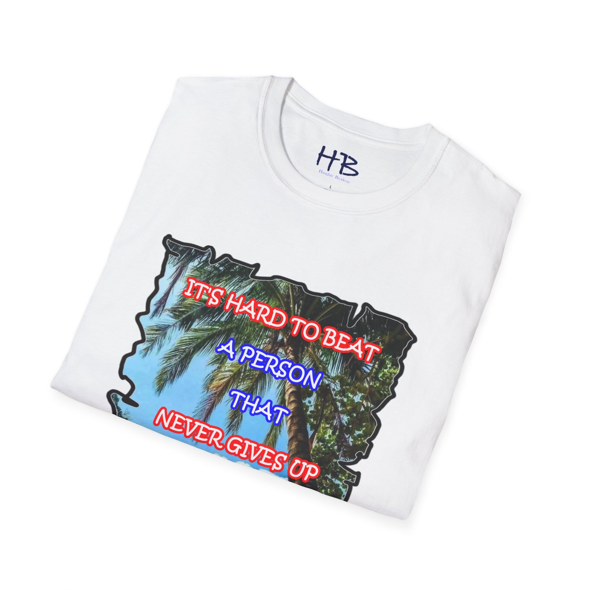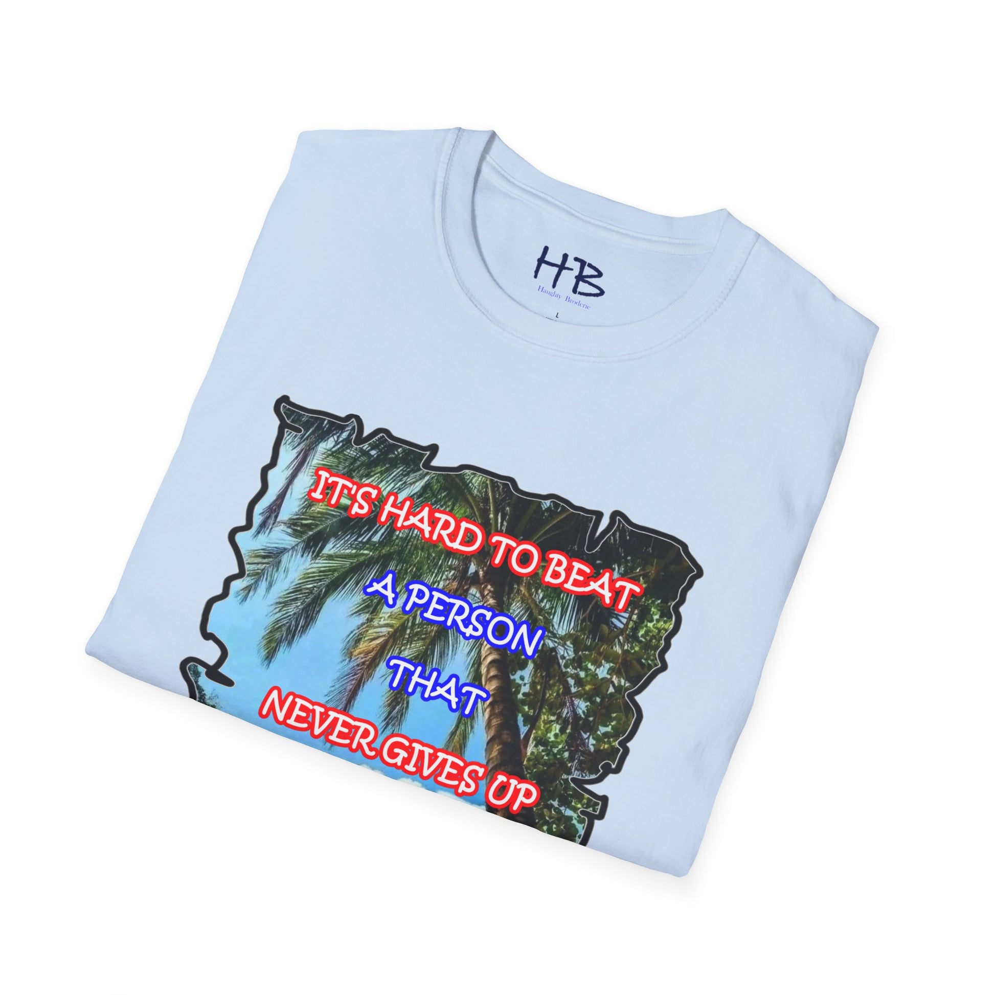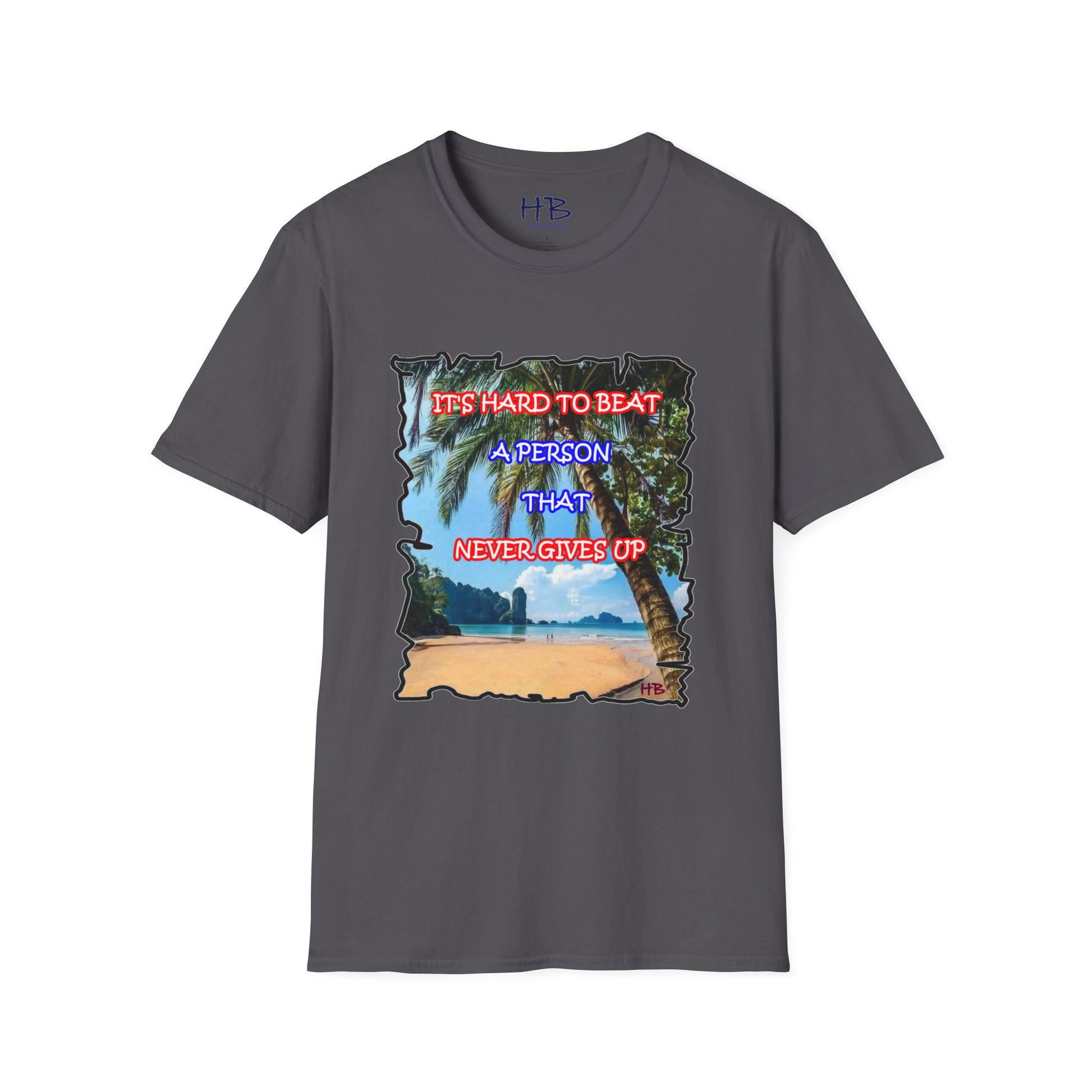 Introducing our captivating and inspiring Oceanic Persistence Tee Shirt! Behold a mesmerizing depiction of a serene sandy beach, adorned with the breathtaking view of a vast ocean, an aesthetic bay, and a majestic beach tree reaching skyward. This picturesque imagery is complemented by the profound words that read, "It's hard to beat a person that never gives up."