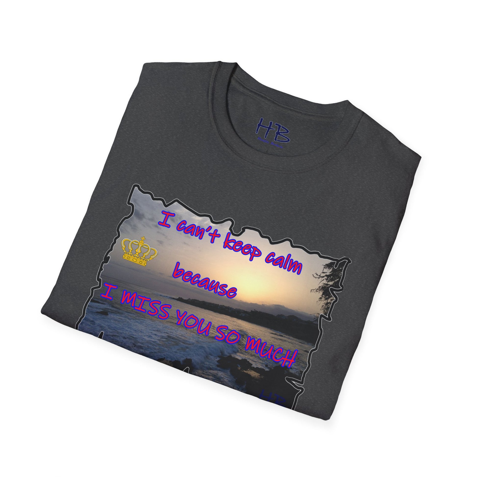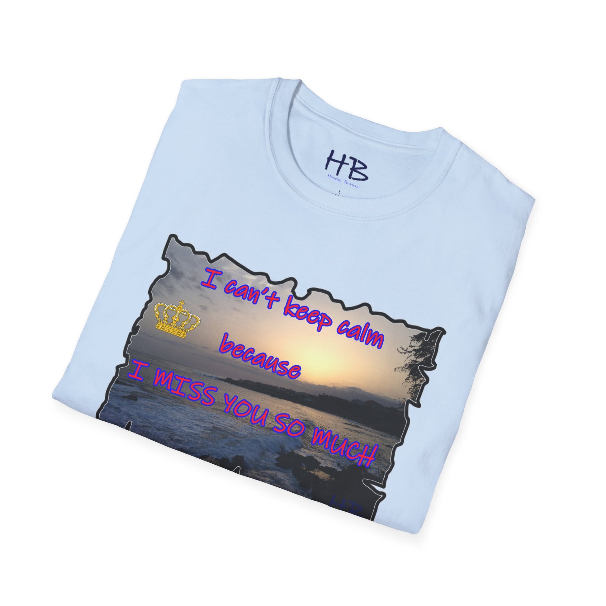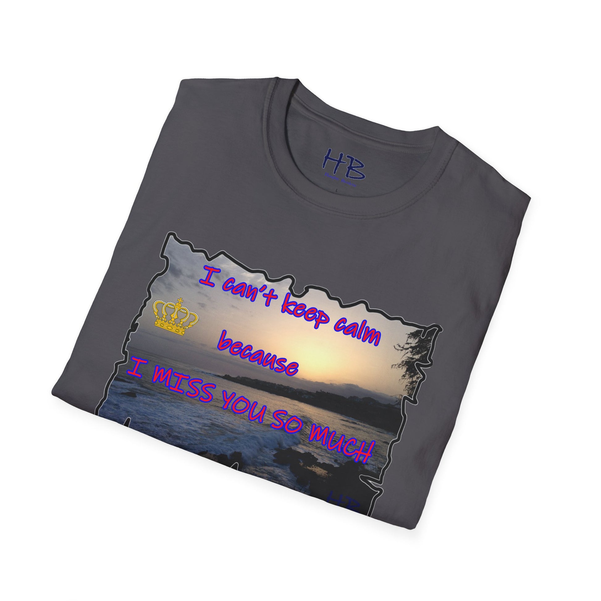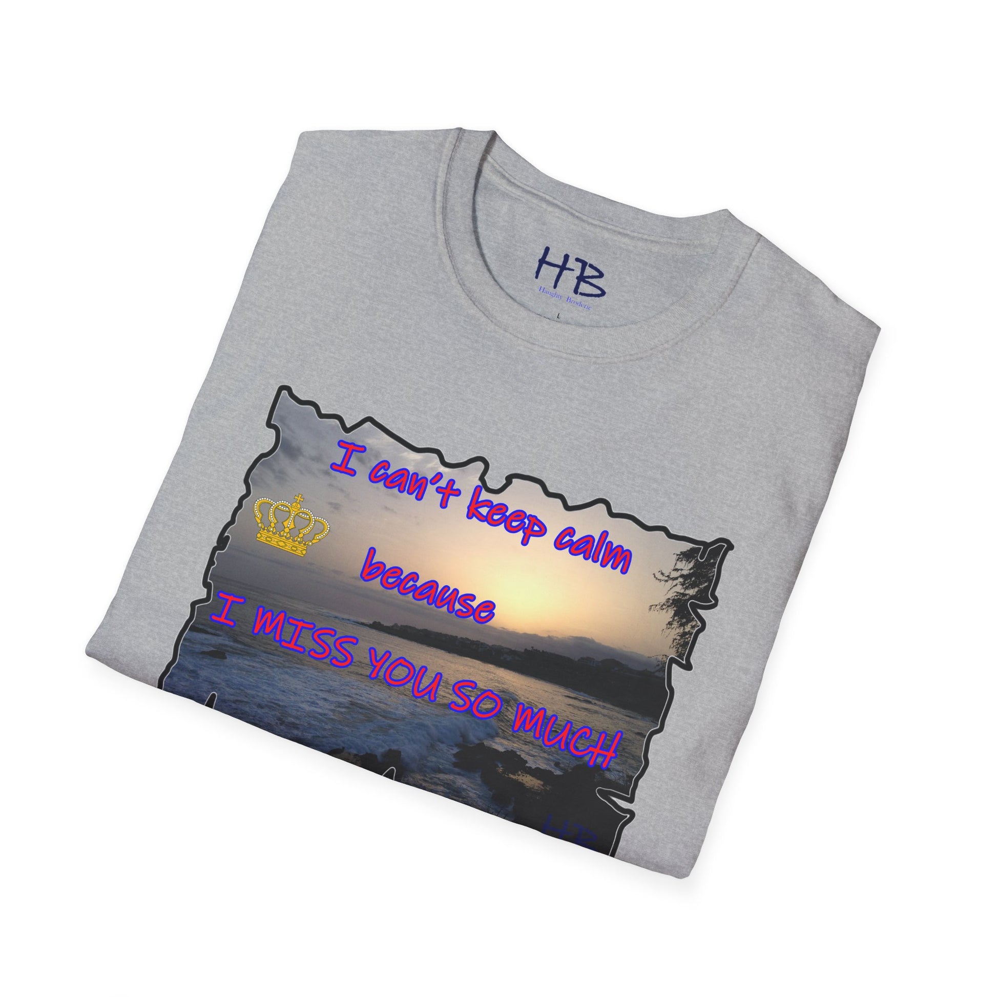 Introducing our exquisite garment that encapsulates the breathtaking beauty of a captivating sunset sky gently embracing the tranquil coast, where the rhythmic dance of crashing waves against rugged rocks creates a mesmerizing symphony of nature's elements. This remarkable tee shirt, adorned with a heartfelt message, "I can't keep calm because I MISS YOU SO MUCH," not only serves as a fashionable piece of clothing but also carries a profound emotional resonance.