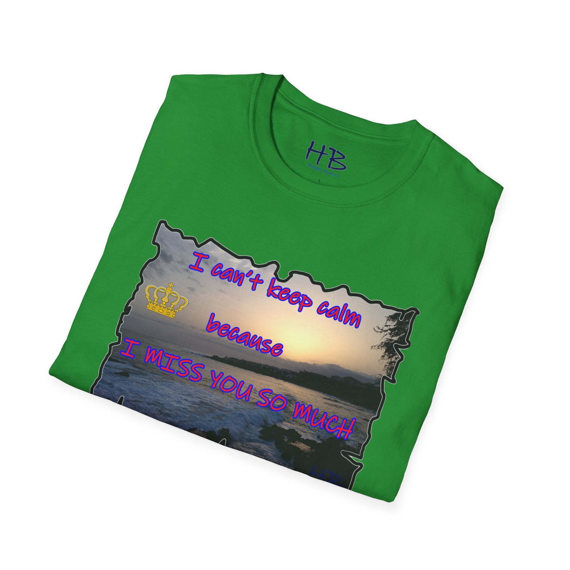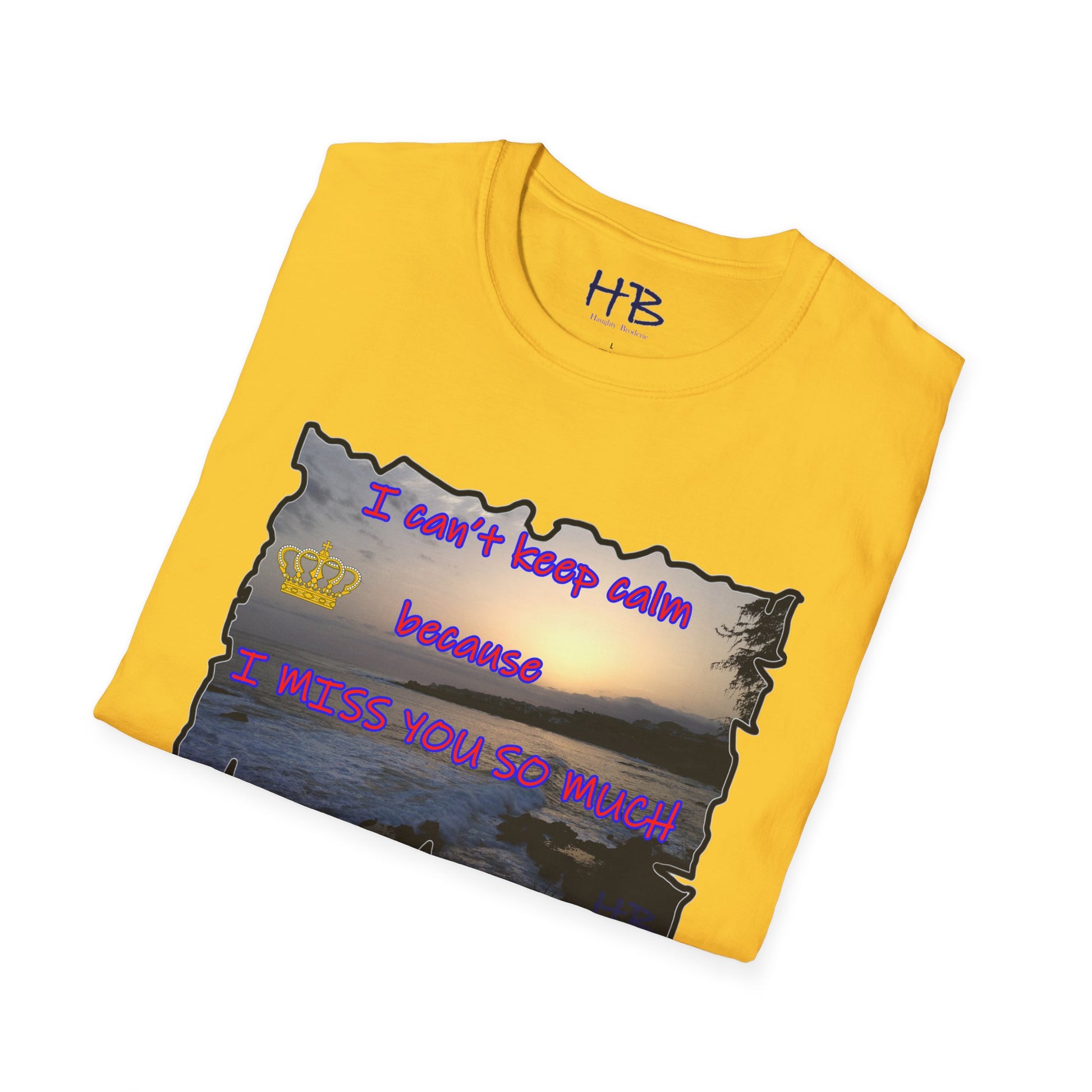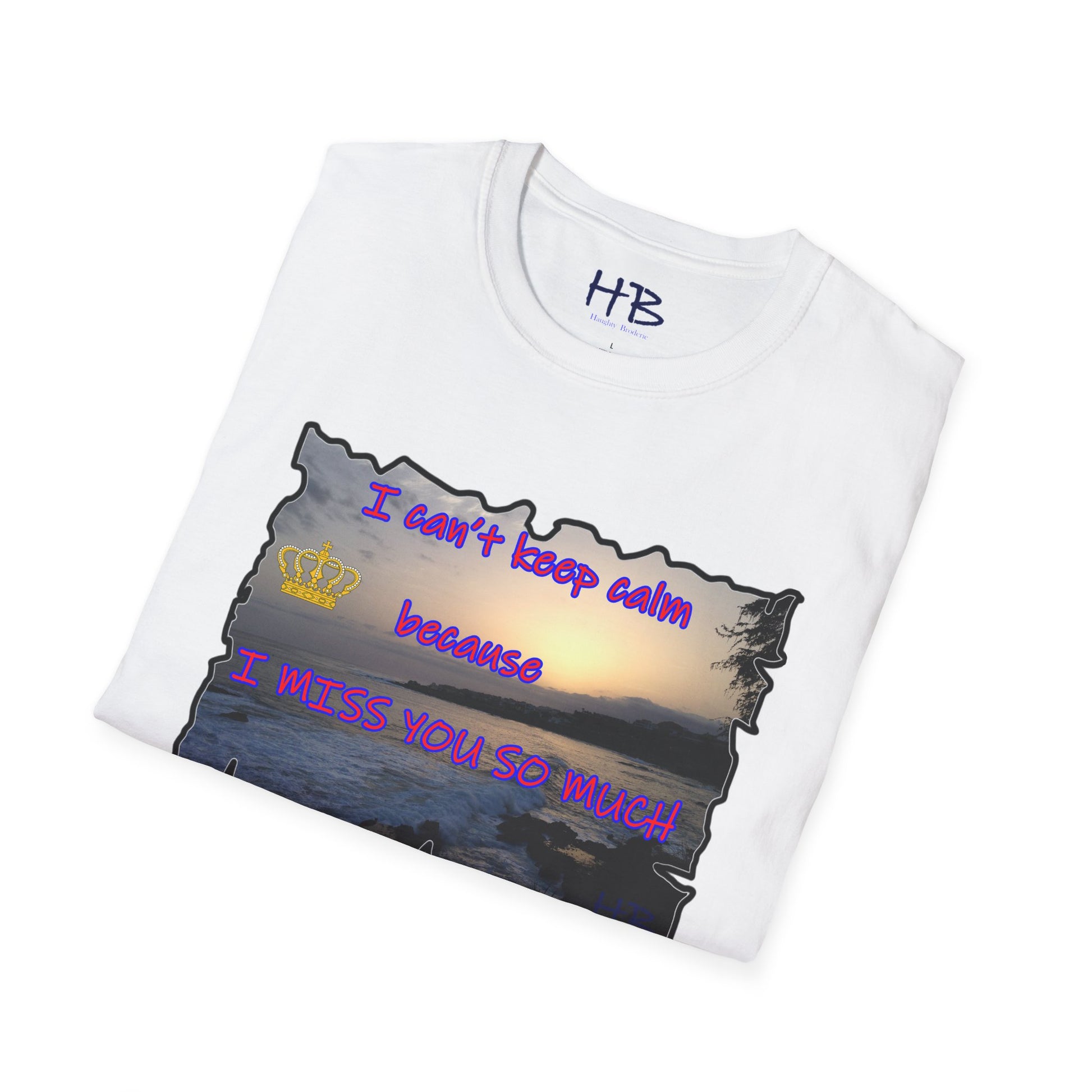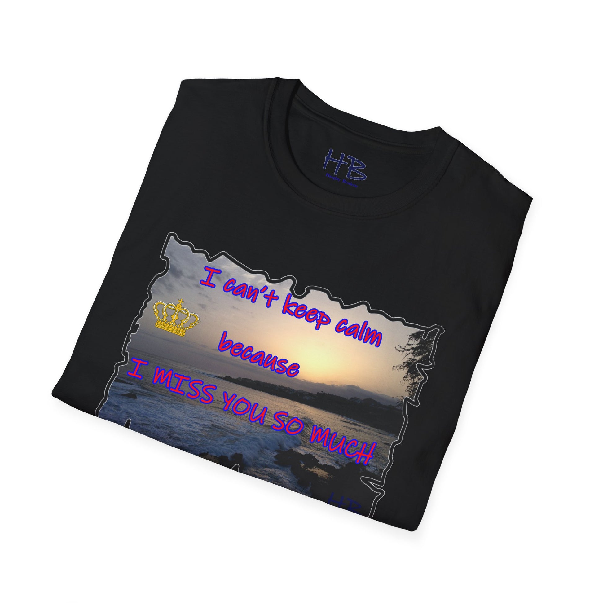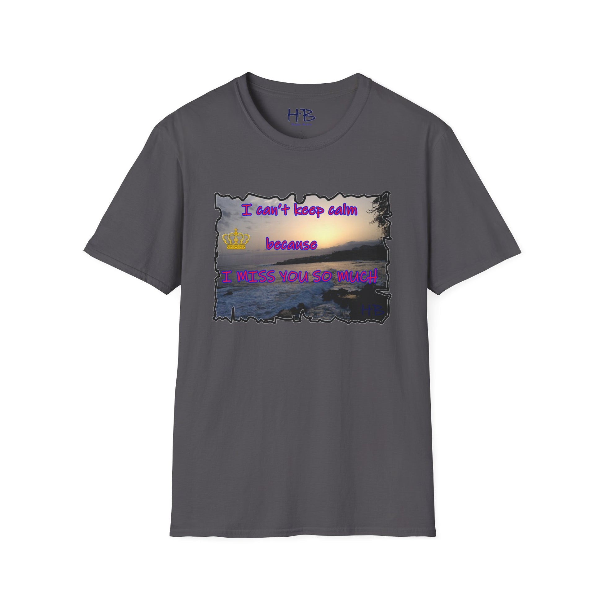 Introducing our exquisite garment that encapsulates the breathtaking beauty of a captivating sunset sky gently embracing the tranquil coast, where the rhythmic dance of crashing waves against rugged rocks creates a mesmerizing symphony of nature's elements. This remarkable tee shirt, adorned with a heartfelt message, "I can't keep calm because I MISS YOU SO MUCH," not only serves as a fashionable piece of clothing but also carries a profound emotional resonance.