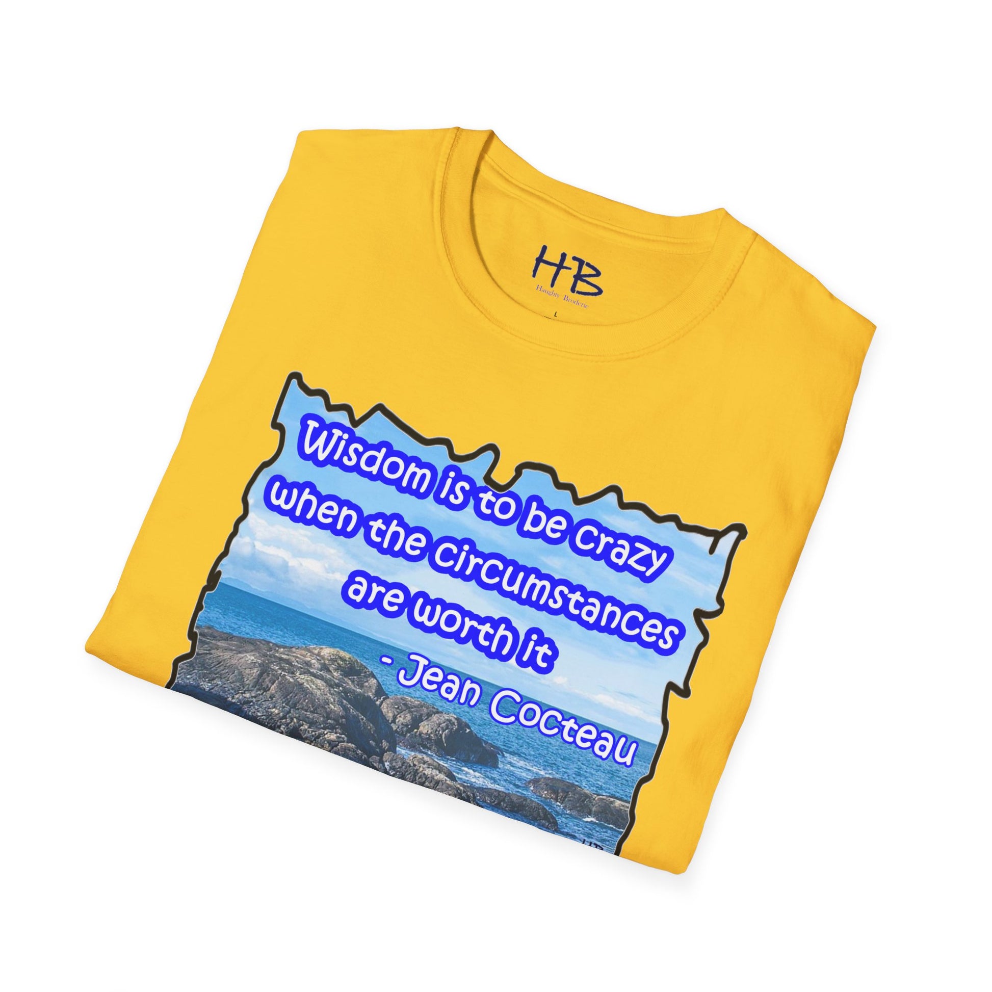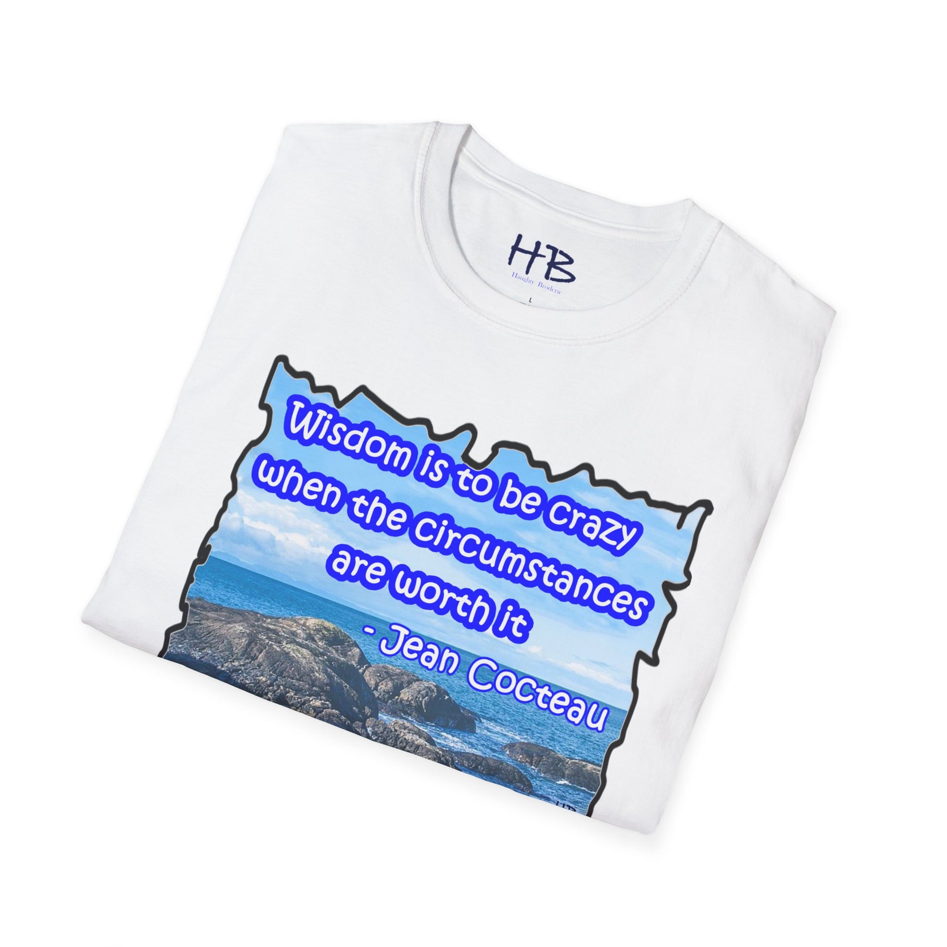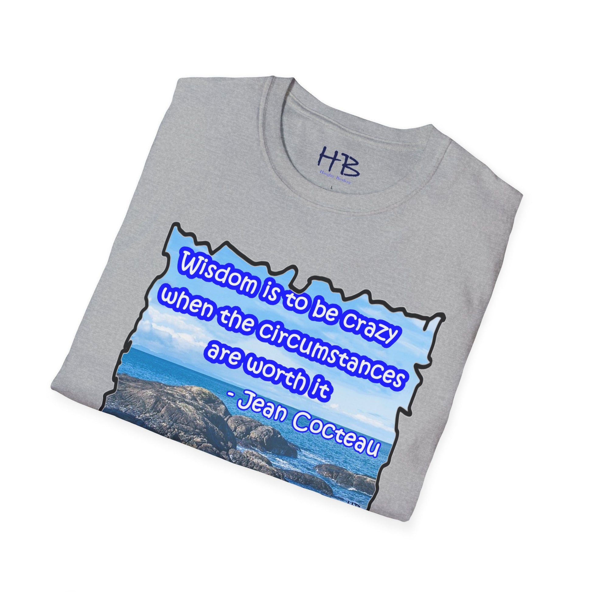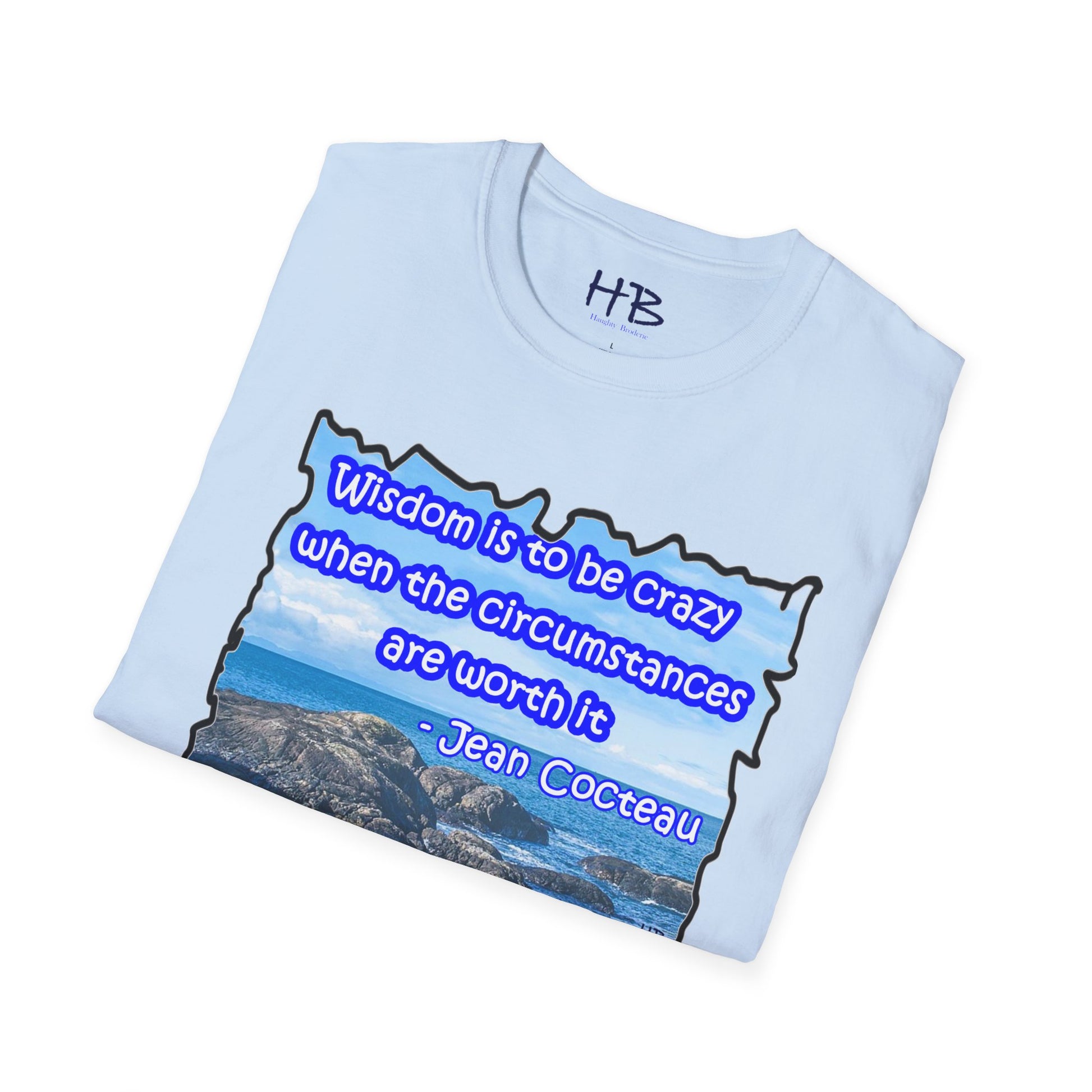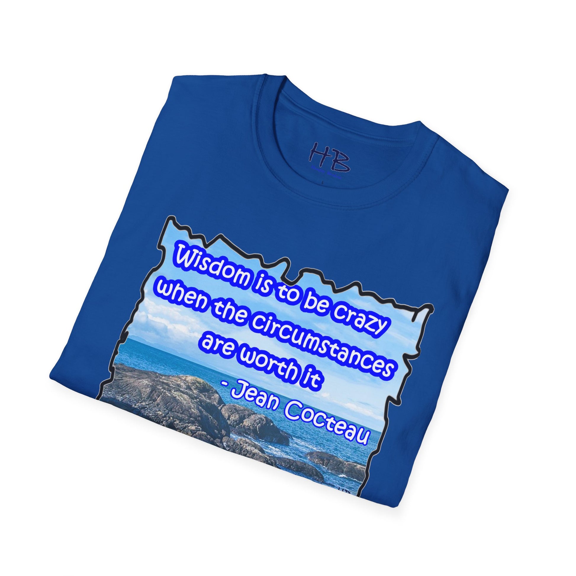 Introducing the ultimate garment that effortlessly combines style, philosophy, and a touch of eccentricity: our exquisite creation showcases a captivating backdrop of a serene and breathtaking blue ocean, adorned with a collection of enchanting rocks that emerge gracefully from the water's embrace. Nestled within this picturesque scene is an empowering quote by the renowned Jean Cocteau, elegantly translated to English: "Wisdom is to be crazy when the circumstances are worth it."