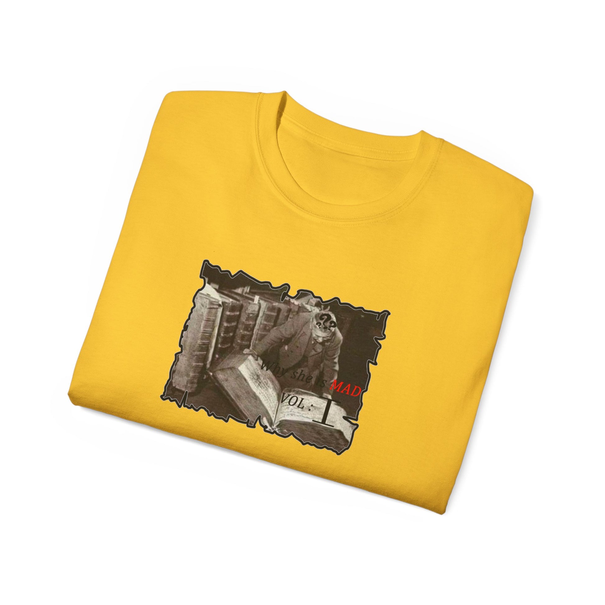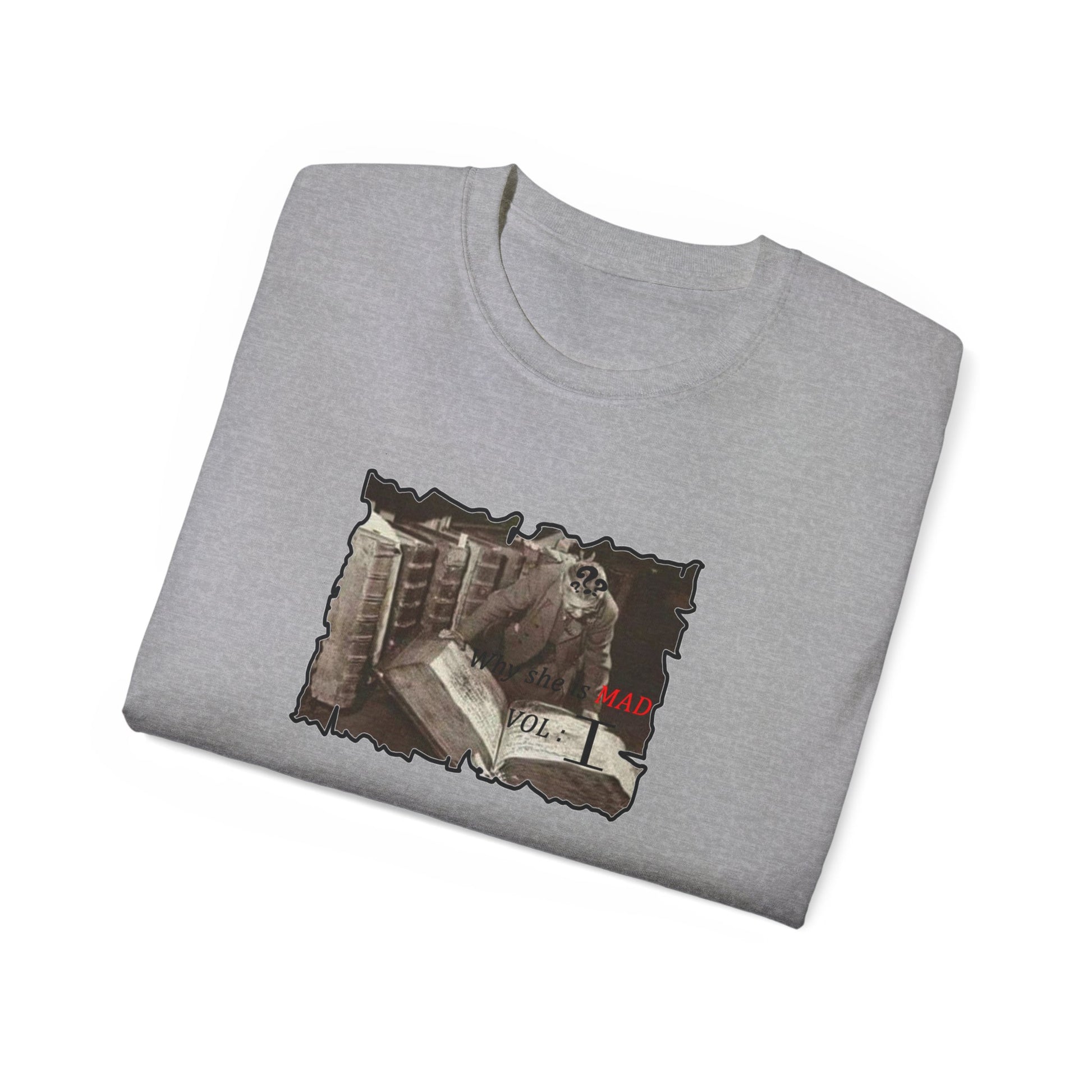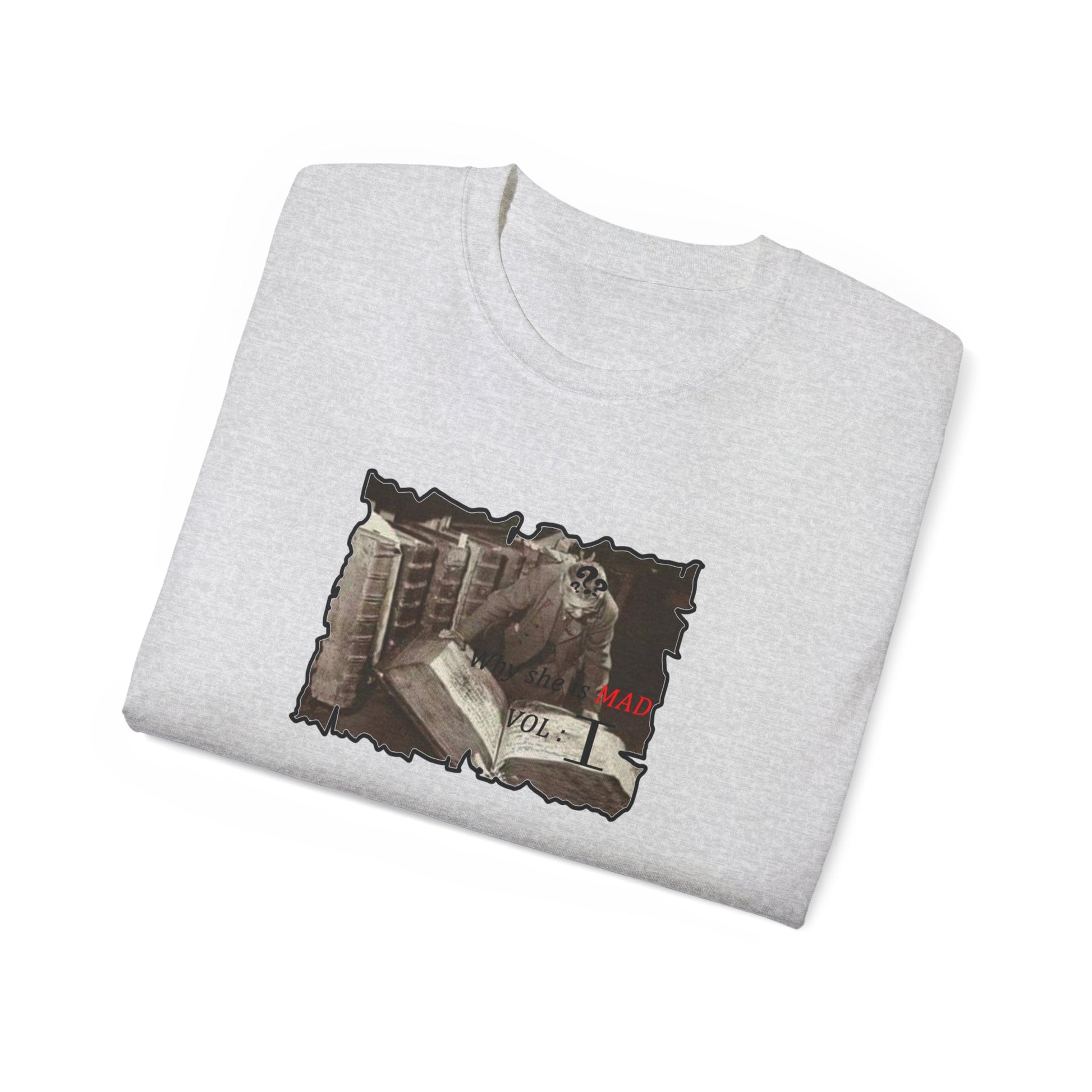 "Why she is MAD, VOL: I." The image is designed to illustrate how men often find it difficult to understand why women are upset, and how they may need an entire library to try and figure it out without success. Our tee shirt is made with high-quality materials to ensure a comfortable and long-lasting fit. It's perfect for those who appreciate clever and humorous designs that poke fun at the differences between men and women. Whether you wear it to show off your sense of humor or as a casual outfit, this tee shirt is sure to grab attention and spark conversation. Don't miss out on the chance to add this funny and relatable tee shirt to your collection. Order now and let everyone know that you understand just how challenging it can be to understand the opposite sex! This unisex ultra cotton tee is a classic. Quality cotton construction means that designs are sure to shine. The shoulders are tapped for a good upper-body fit. There are no side seams, ensuring a clean, unbroken flow. The collar has ribbed knitting for improved elasticity. The materials that went into this product are sustainably sourced and economically friendly. .: 100% cotton (fiber content may vary for different colors) .: Medium fabric (6.0 oz/yd² (203 g/m²)) .: Classic fit .: Tear-away label .: Runs bigger than usual