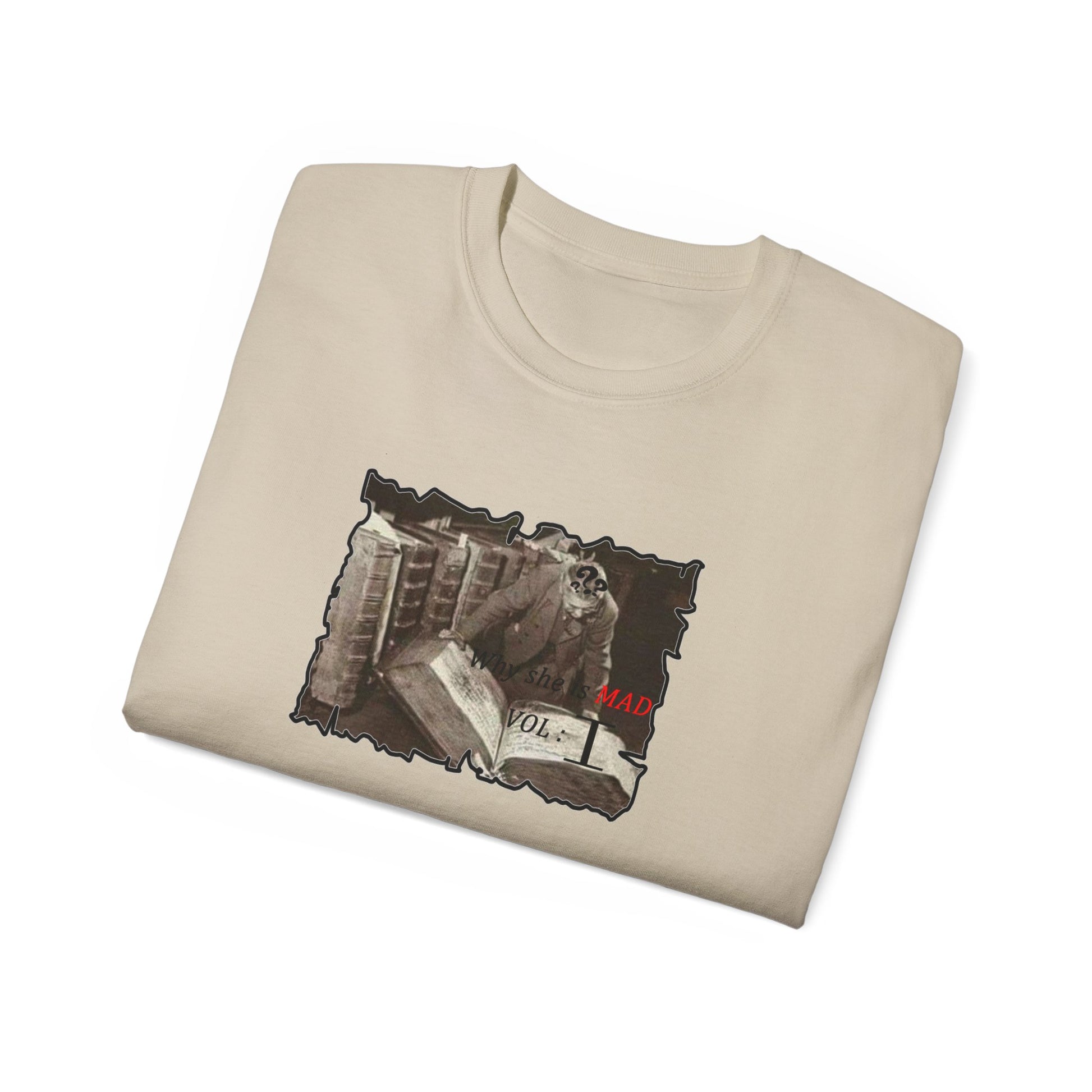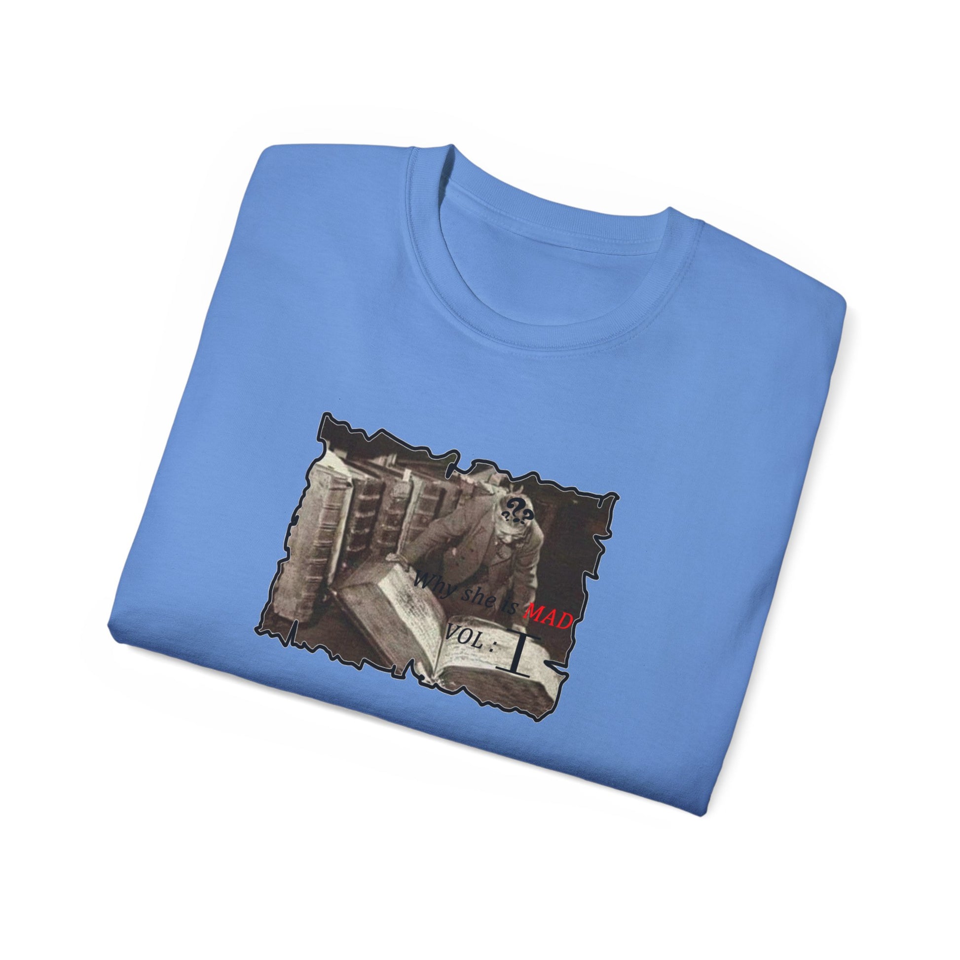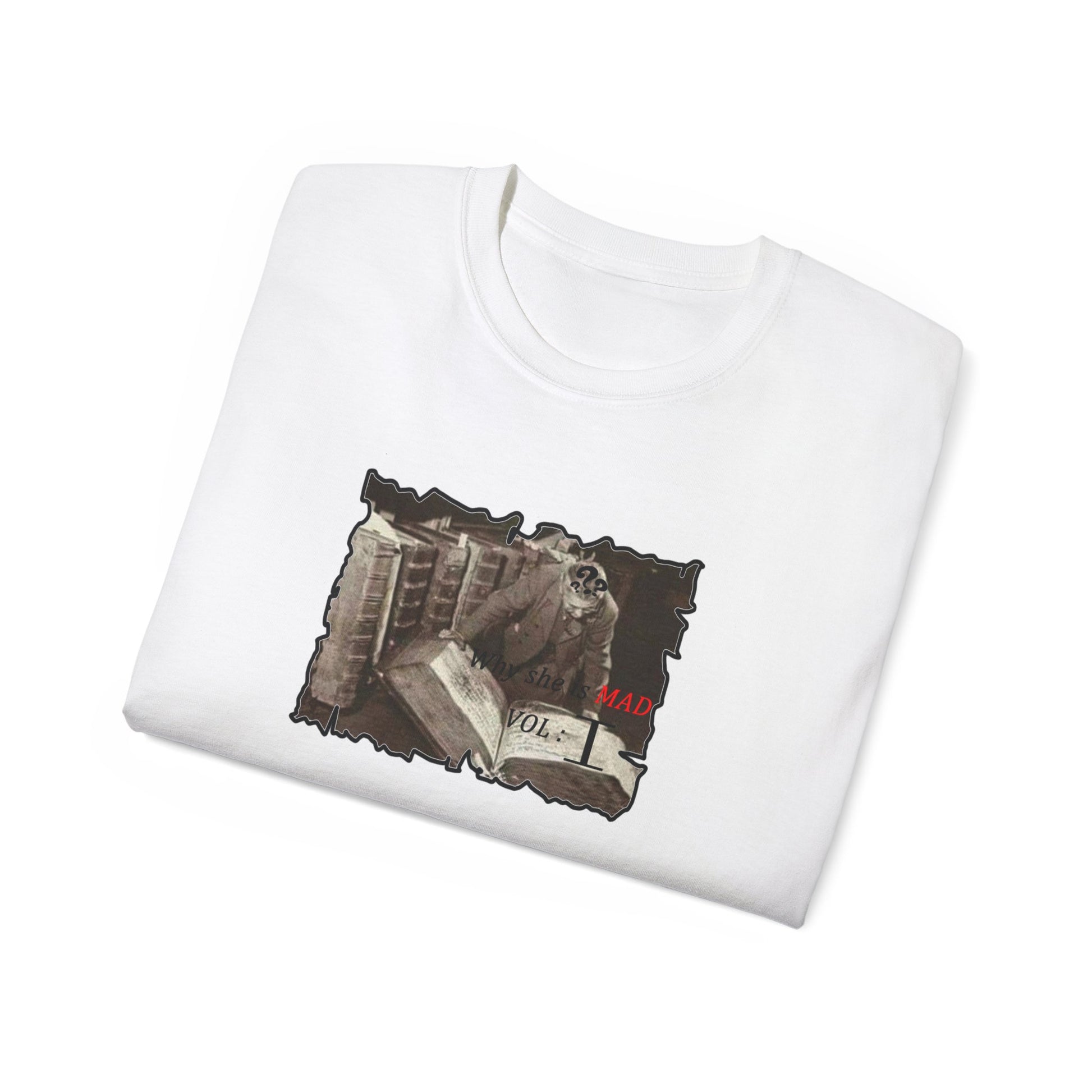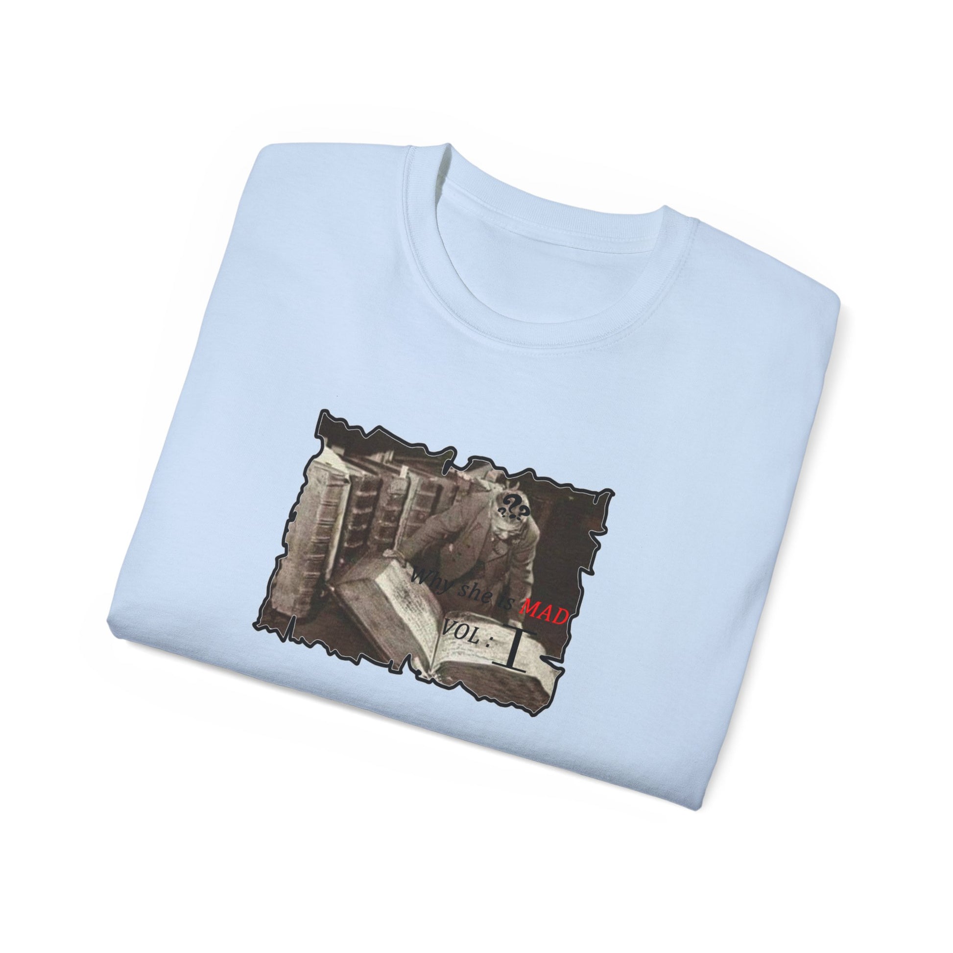 "Why she is MAD, VOL: I." The image is designed to illustrate how men often find it difficult to understand why women are upset, and how they may need an entire library to try and figure it out without success. Our tee shirt is made with high-quality materials to ensure a comfortable and long-lasting fit. It's perfect for those who appreciate clever and humorous designs that poke fun at the differences between men and women. Whether you wear it to show off your sense of humor or as a casual outfit, this tee shirt is sure to grab attention and spark conversation. Don't miss out on the chance to add this funny and relatable tee shirt to your collection. Order now and let everyone know that you understand just how challenging it can be to understand the opposite sex! This unisex ultra cotton tee is a classic. Quality cotton construction means that designs are sure to shine. The shoulders are tapped for a good upper-body fit. There are no side seams, ensuring a clean, unbroken flow. The collar has ribbed knitting for improved elasticity. The materials that went into this product are sustainably sourced and economically friendly. .: 100% cotton (fiber content may vary for different colors) .: Medium fabric (6.0 oz/yd² (203 g/m²)) .: Classic fit .: Tear-away label .: Runs bigger than usual