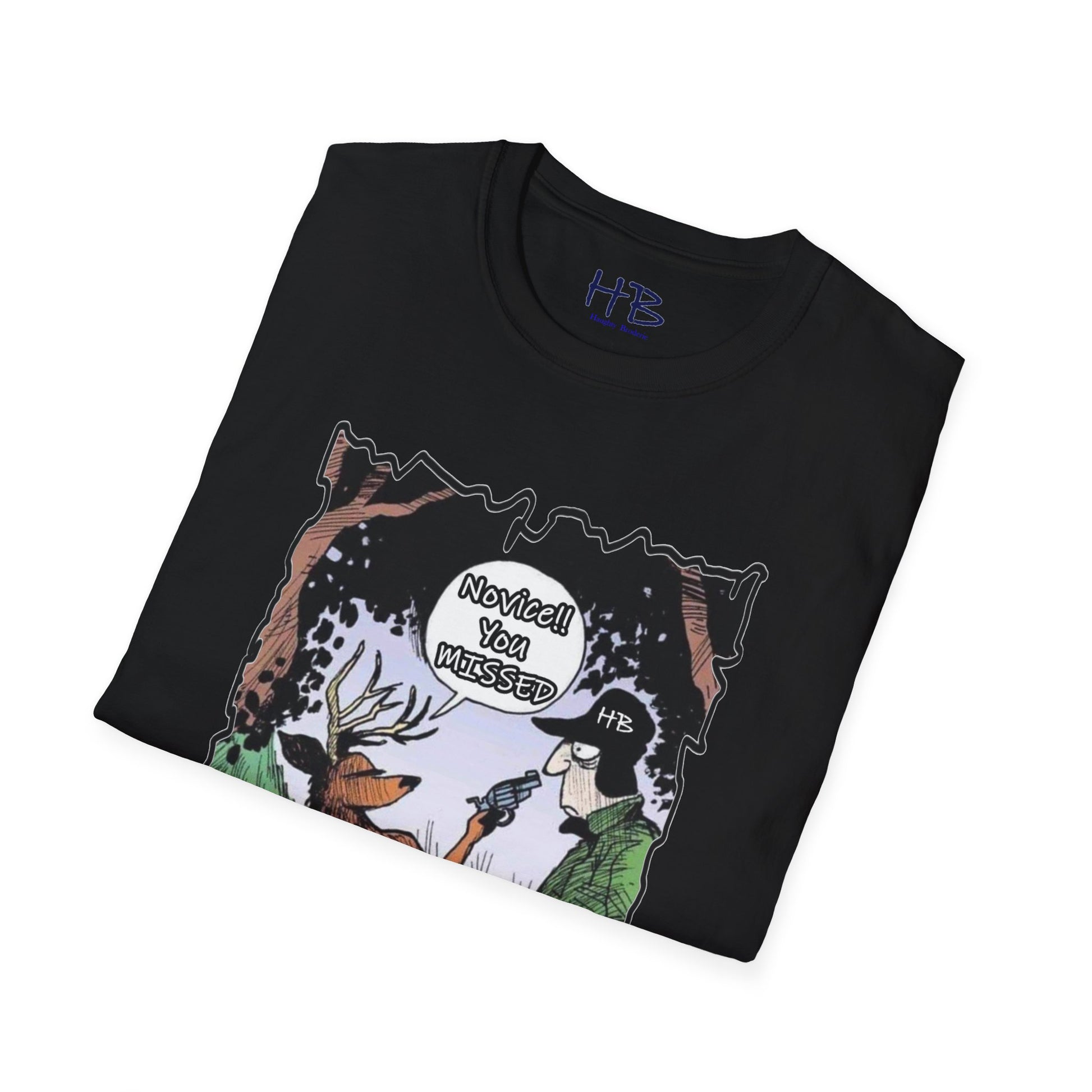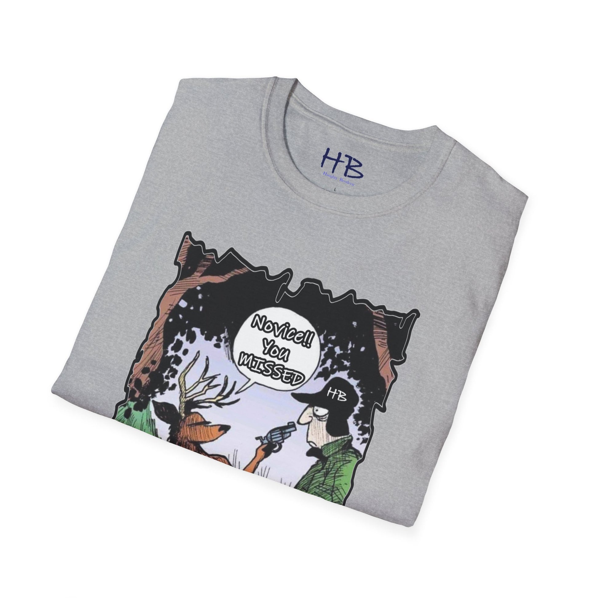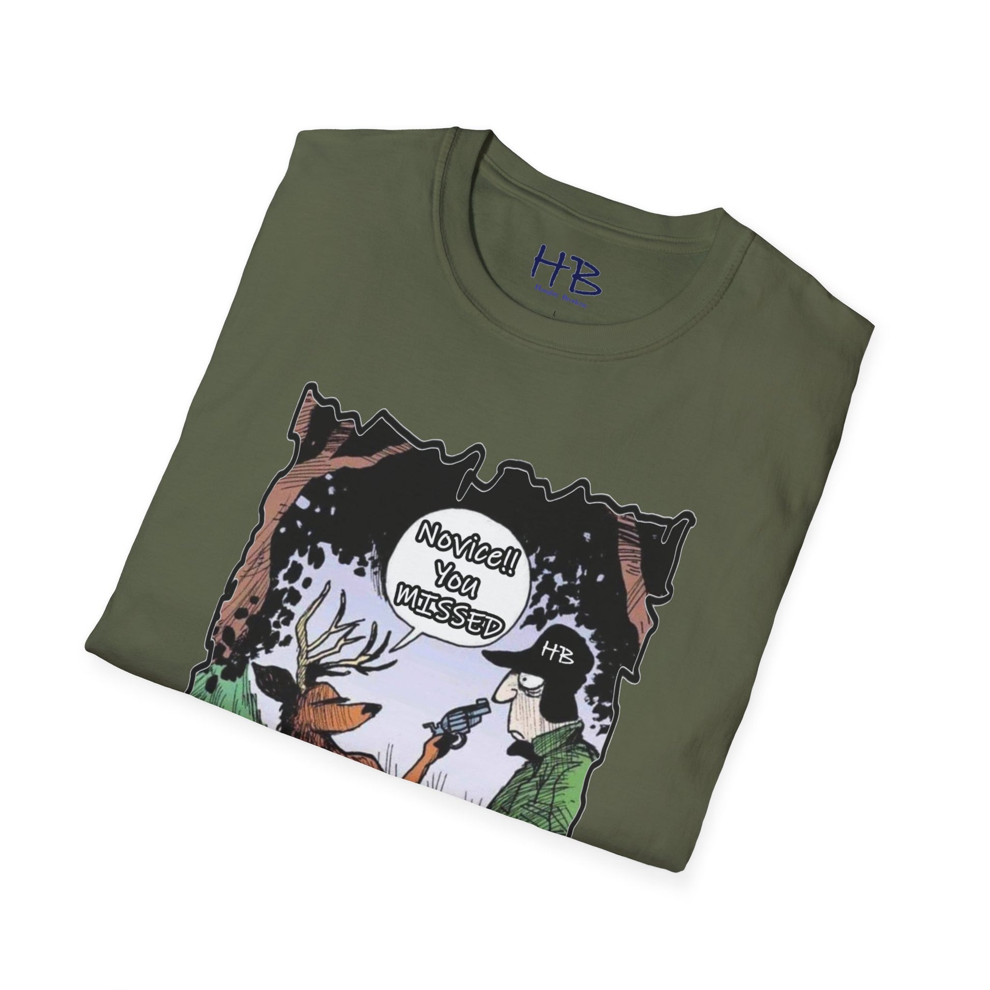 Step into the untamed beauty of the wild with our captivating "Novice's Surprise" t-shirt, where nature and wit collide in a breathtaking tableau. Crafted with meticulous detail, this shirt showcases a masterfully illustrated scene featuring a majestic deer emerging from the verdant grass, its potent antlers raised high, cradling a handheld gun aimed square at the bewildered face of a stunned hunter. The hunter, in the throes of disbelief, exclaims, "Novice, you missed."