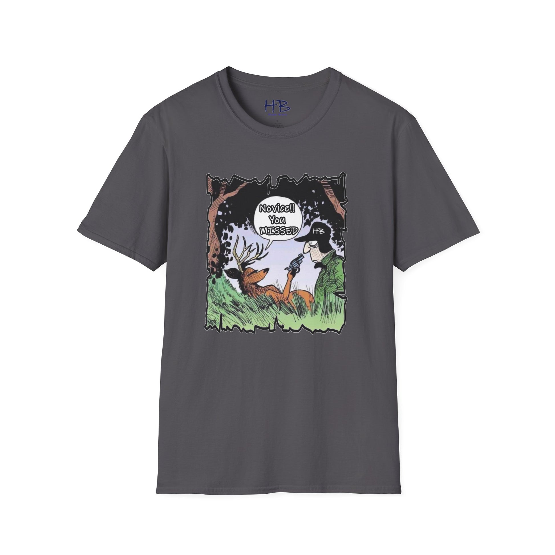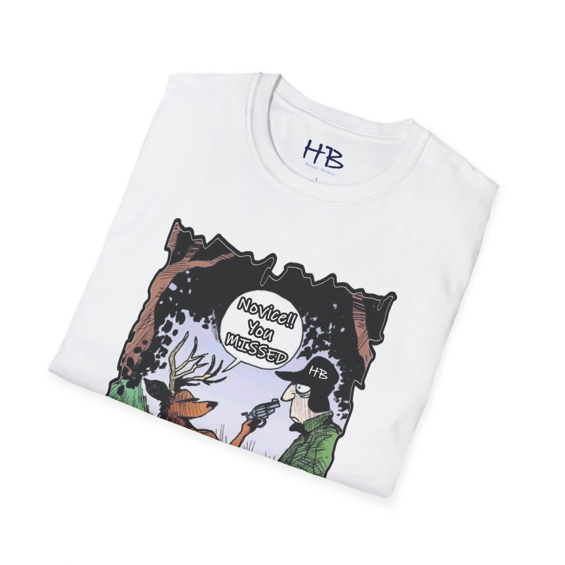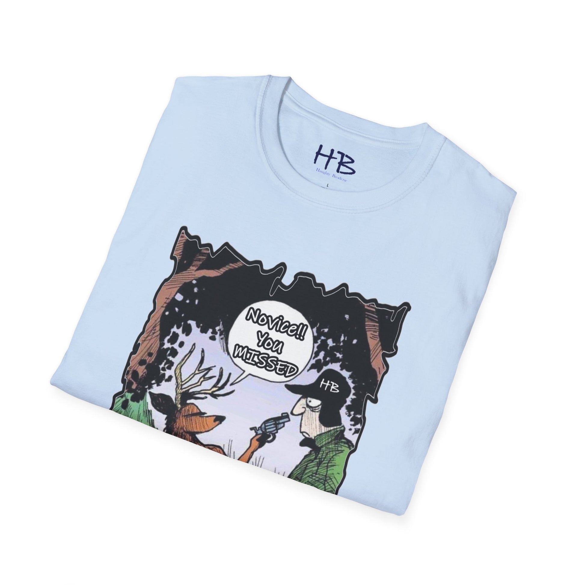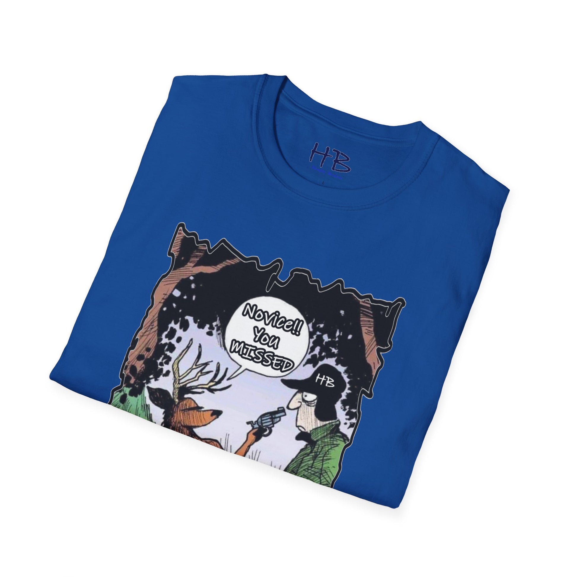 Step into the untamed beauty of the wild with our captivating "Novice's Surprise" t-shirt, where nature and wit collide in a breathtaking tableau. Crafted with meticulous detail, this shirt showcases a masterfully illustrated scene featuring a majestic deer emerging from the verdant grass, its potent antlers raised high, cradling a handheld gun aimed square at the bewildered face of a stunned hunter. The hunter, in the throes of disbelief, exclaims, "Novice, you missed."