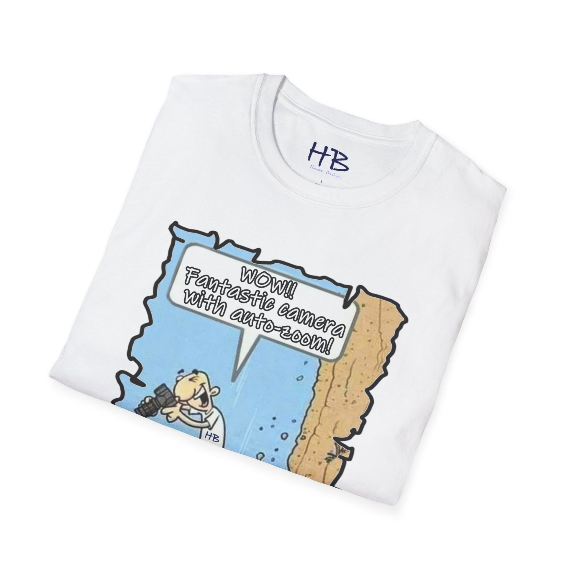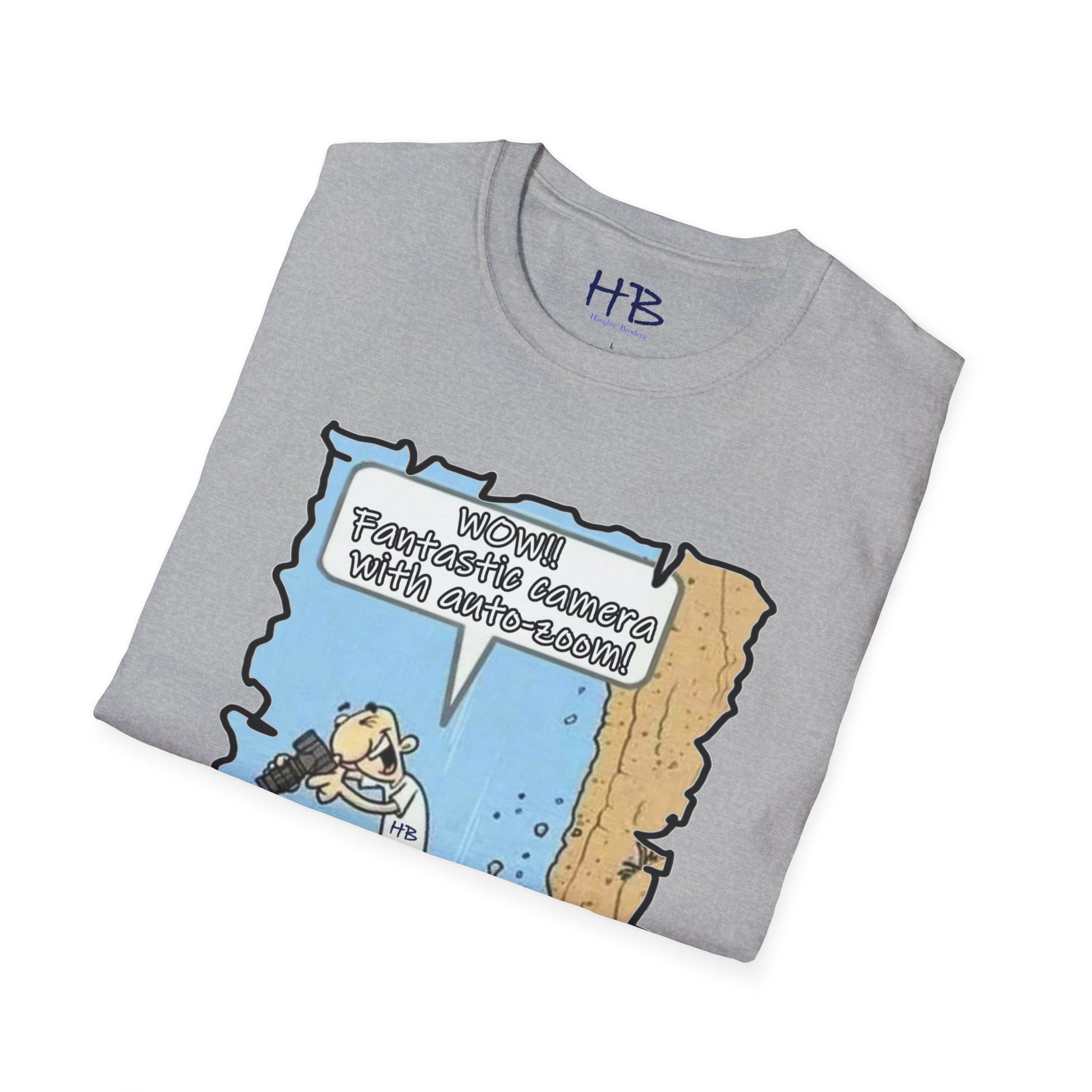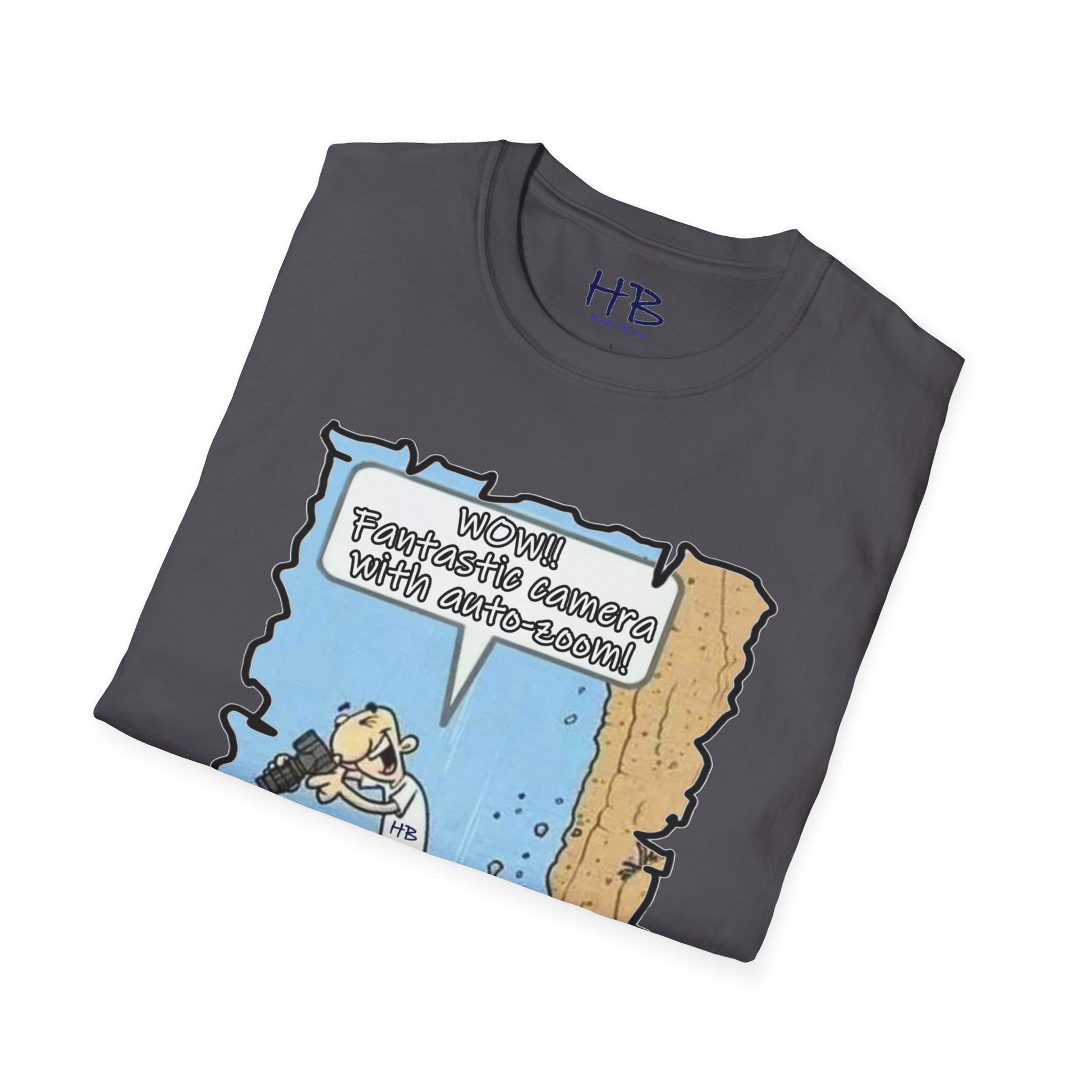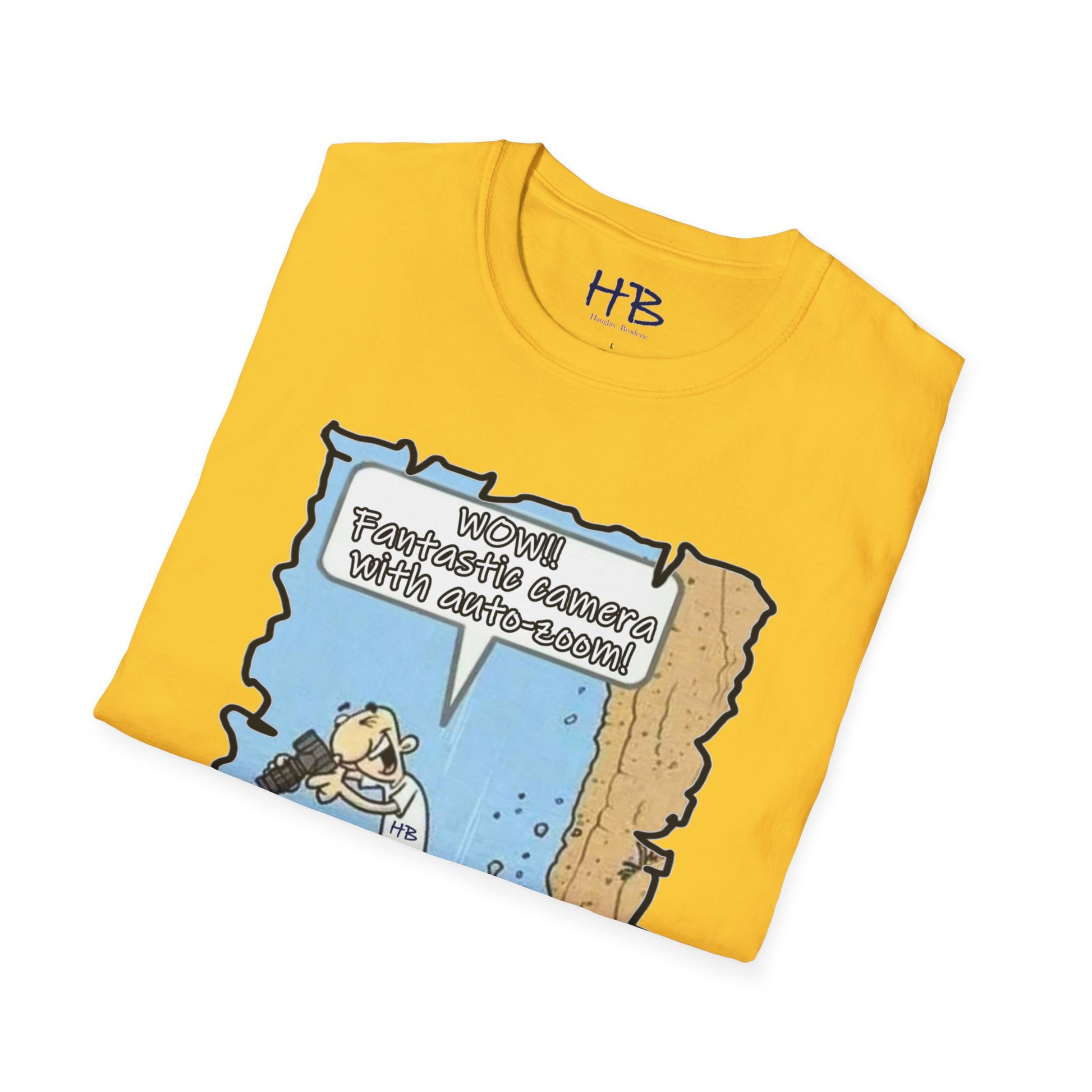 Introducing our latest creation – a wearable masterpiece that encapsulates the essence of humor and modern-day quirks. Behold the captivating tee shirt featuring a delightful illustration of a man standing atop a precarious piece of cliff, oblivious to the imminent descent. As he peers into the viewfinder of his camera, the world around him slips away, and his exclamatory dialogue, "WOW!!! Fantastic camera with auto-zoom!!," echoes his misplaced focus.