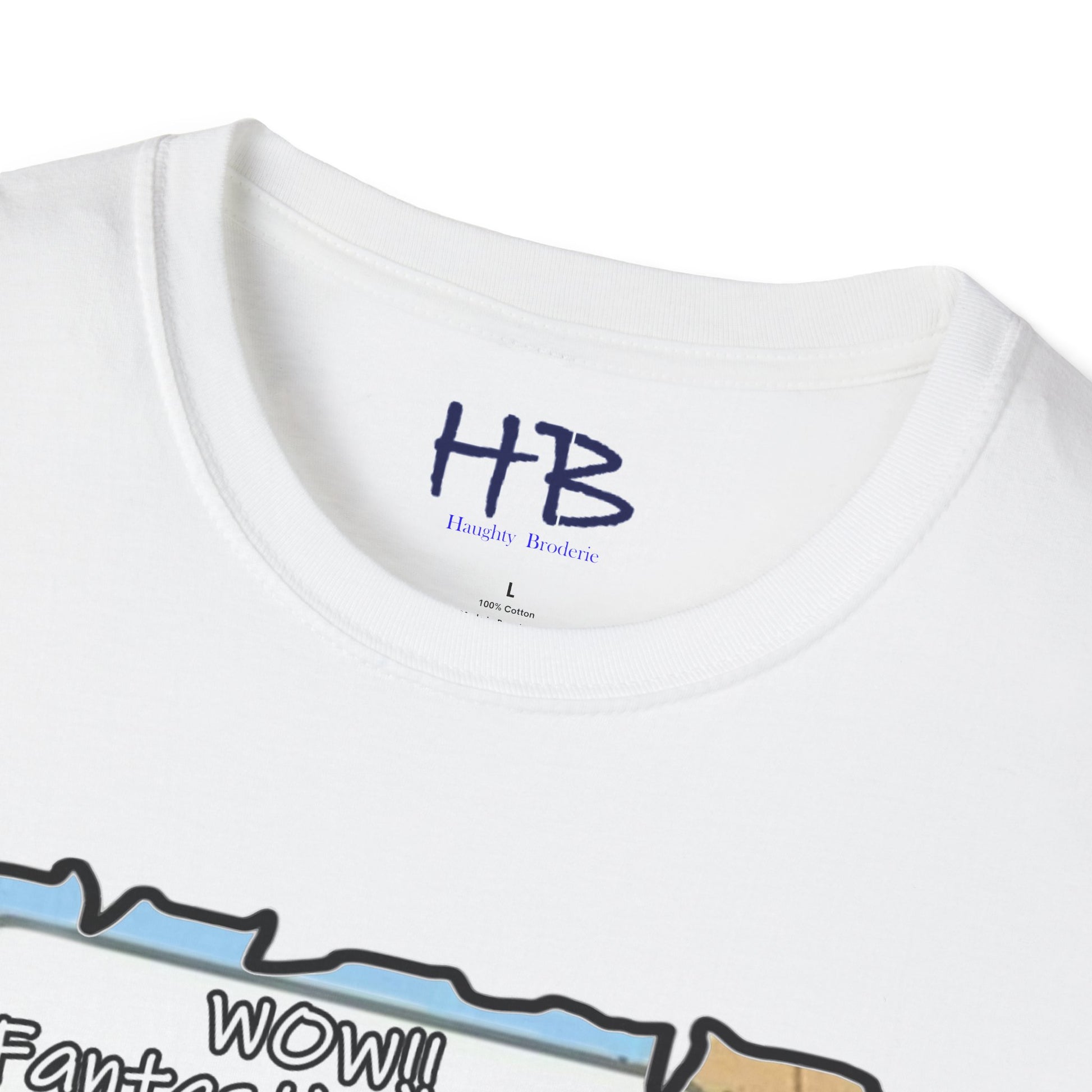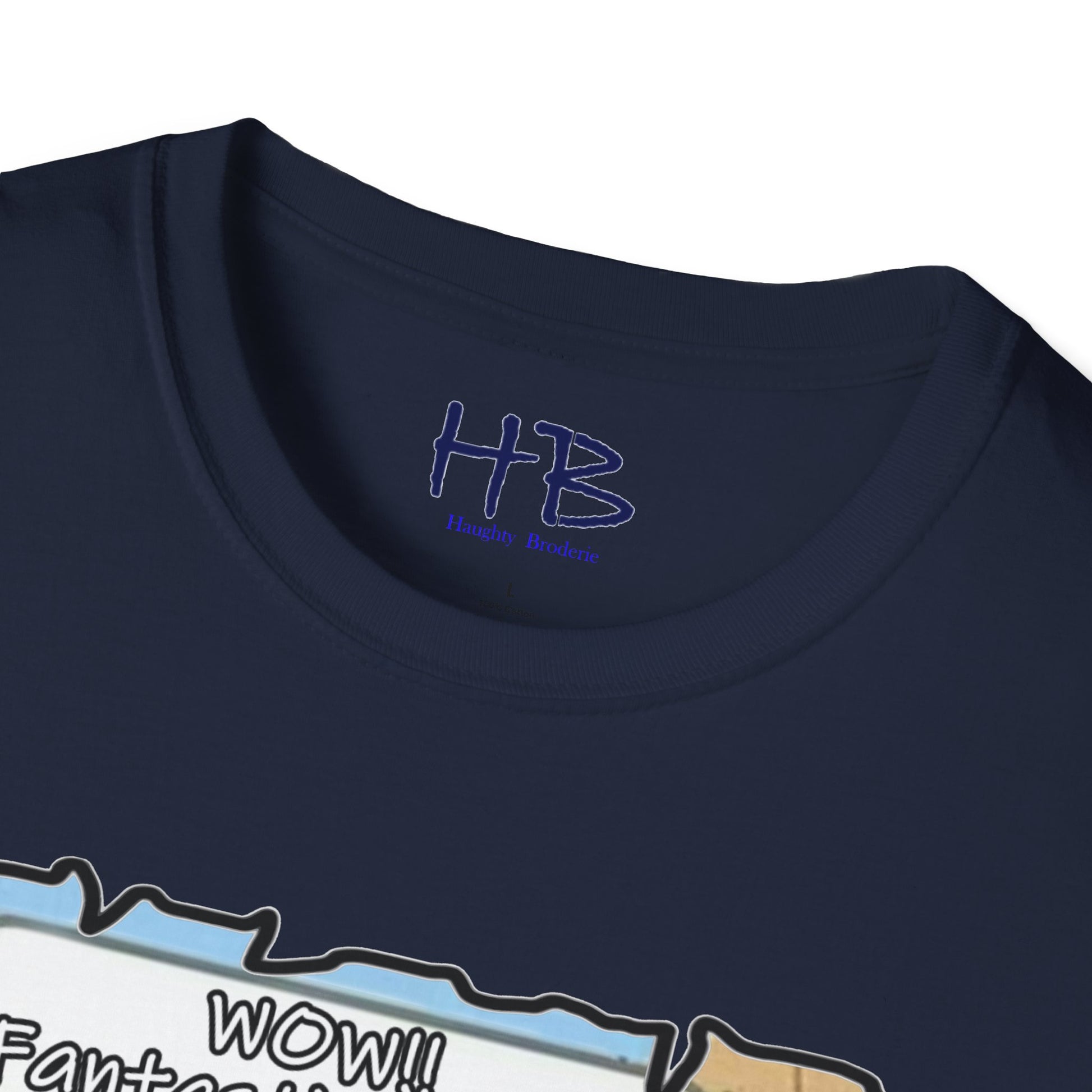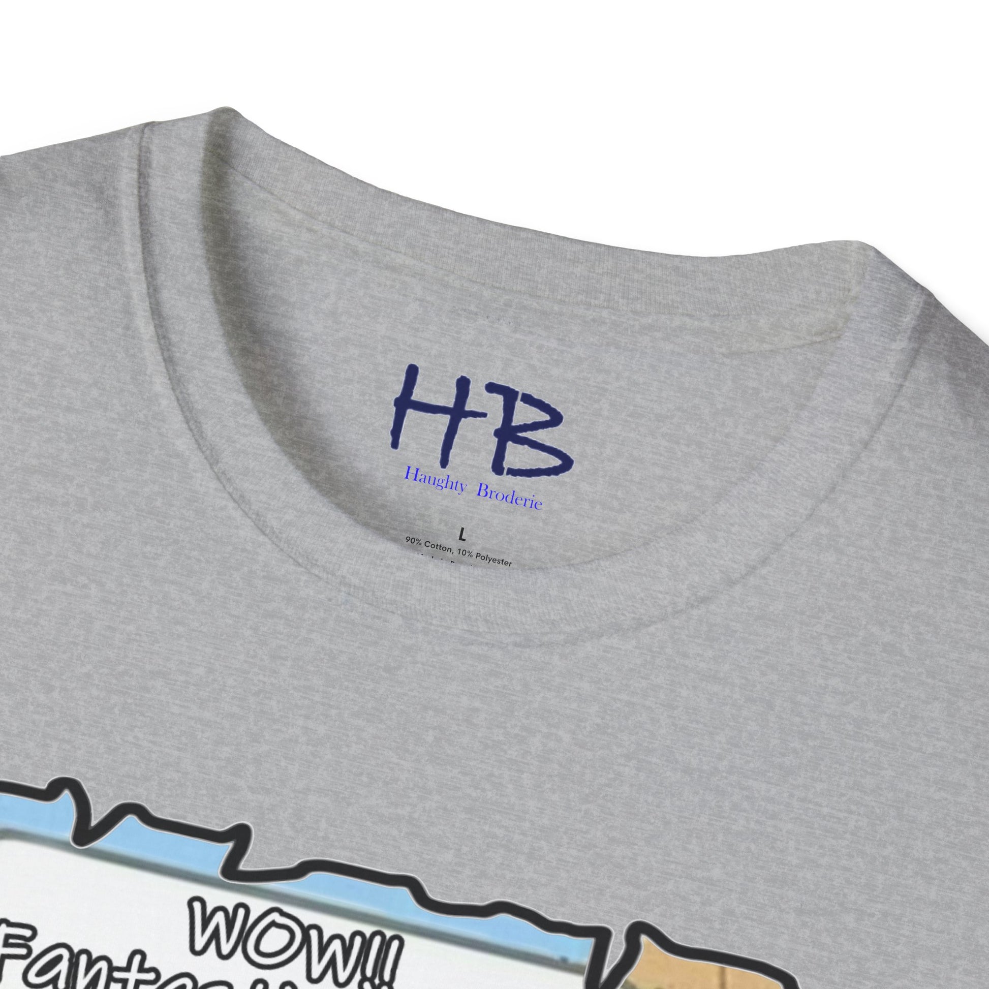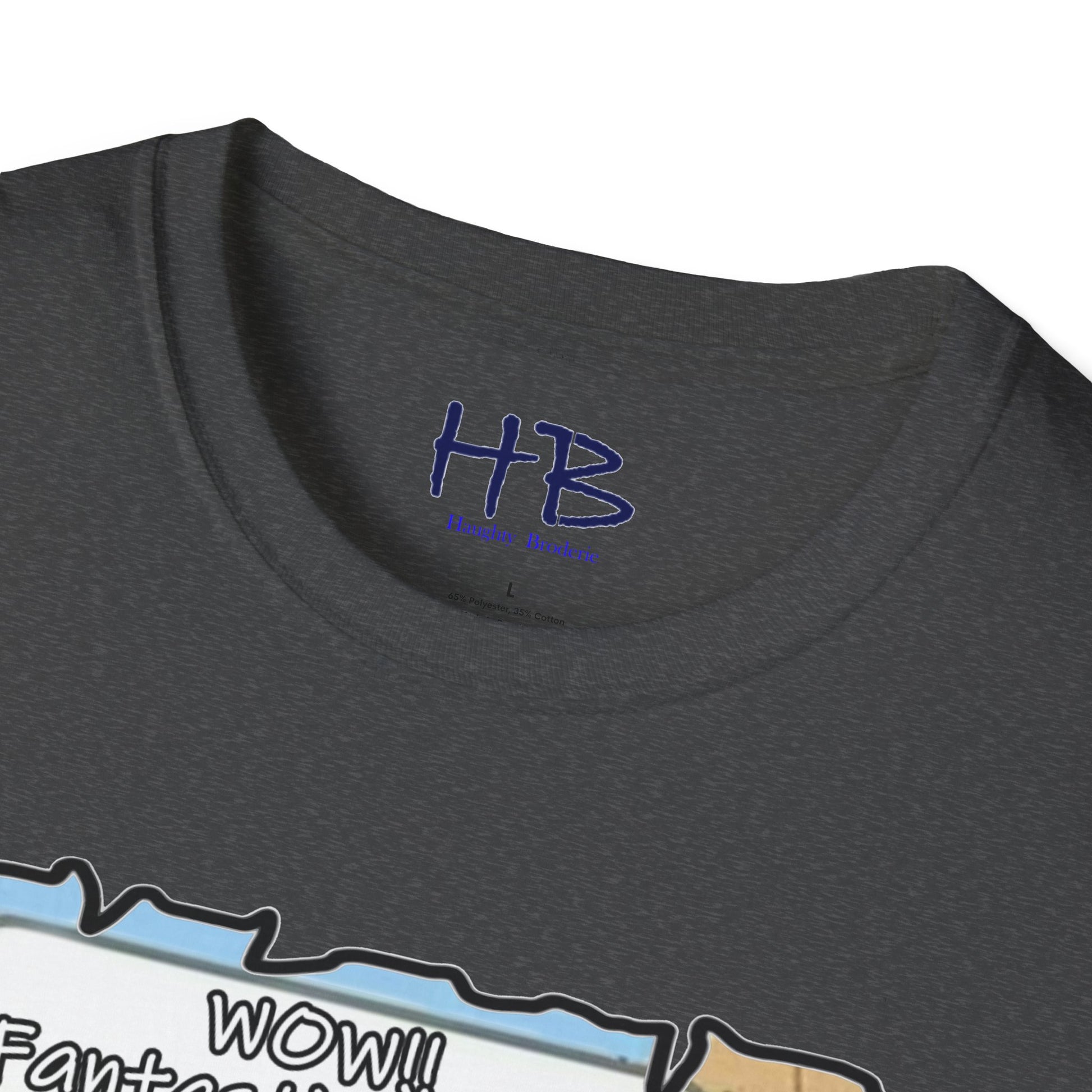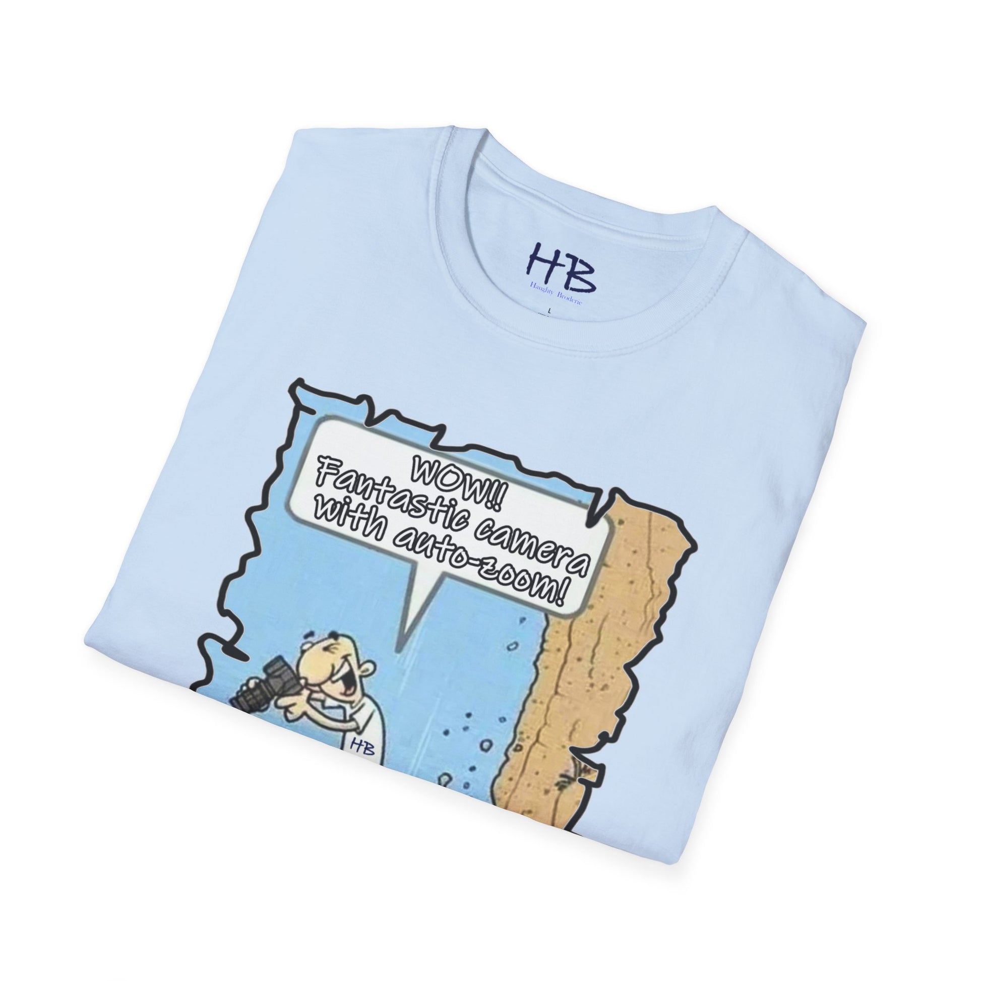 Introducing our latest creation – a wearable masterpiece that encapsulates the essence of humor and modern-day quirks. Behold the captivating tee shirt featuring a delightful illustration of a man standing atop a precarious piece of cliff, oblivious to the imminent descent. As he peers into the viewfinder of his camera, the world around him slips away, and his exclamatory dialogue, "WOW!!! Fantastic camera with auto-zoom!!," echoes his misplaced focus.