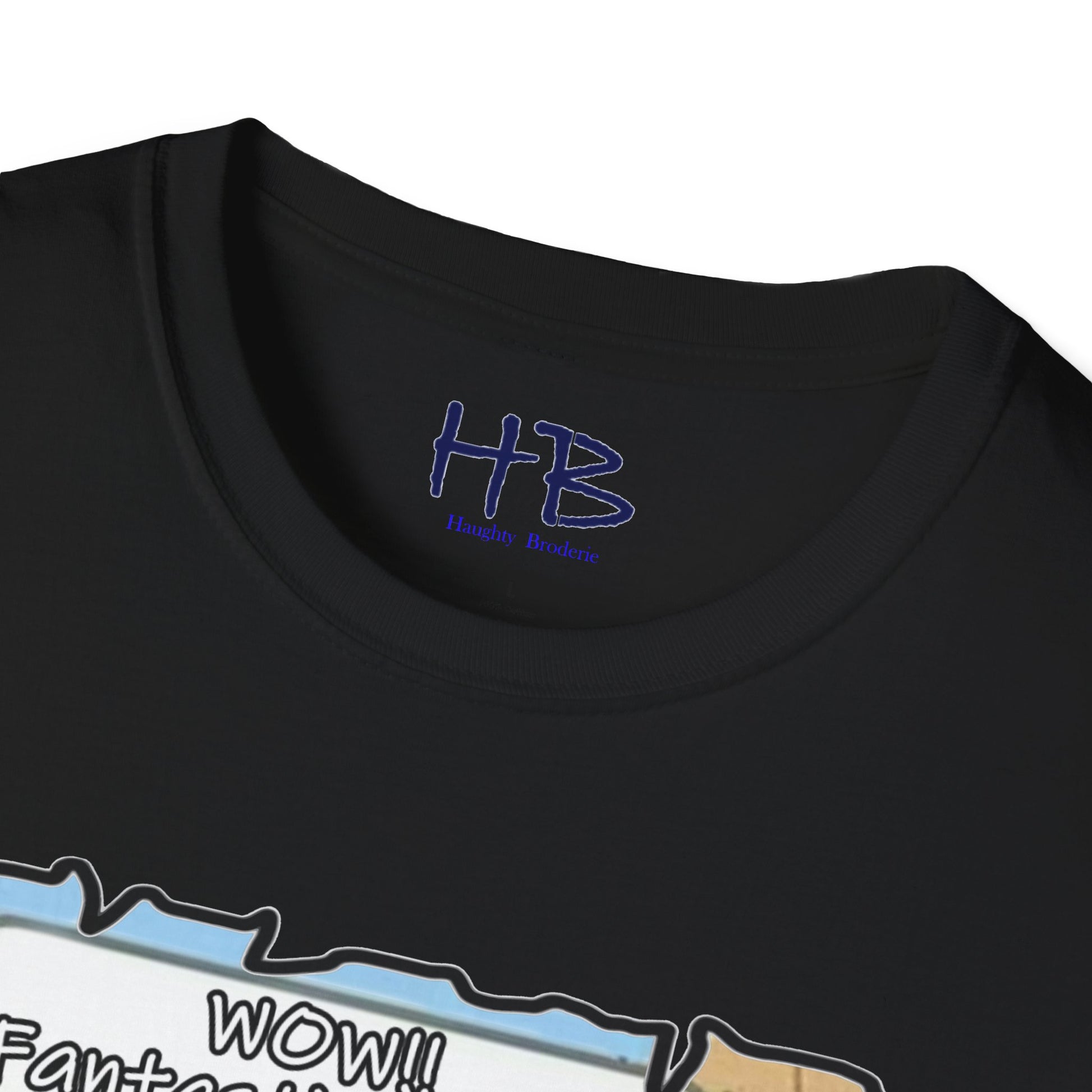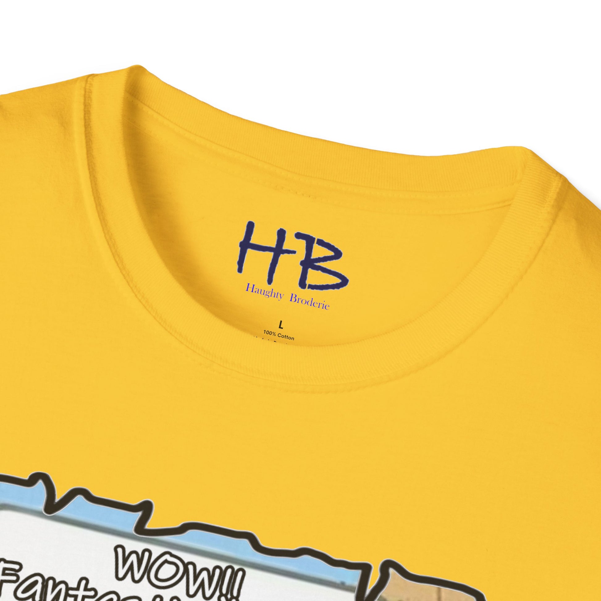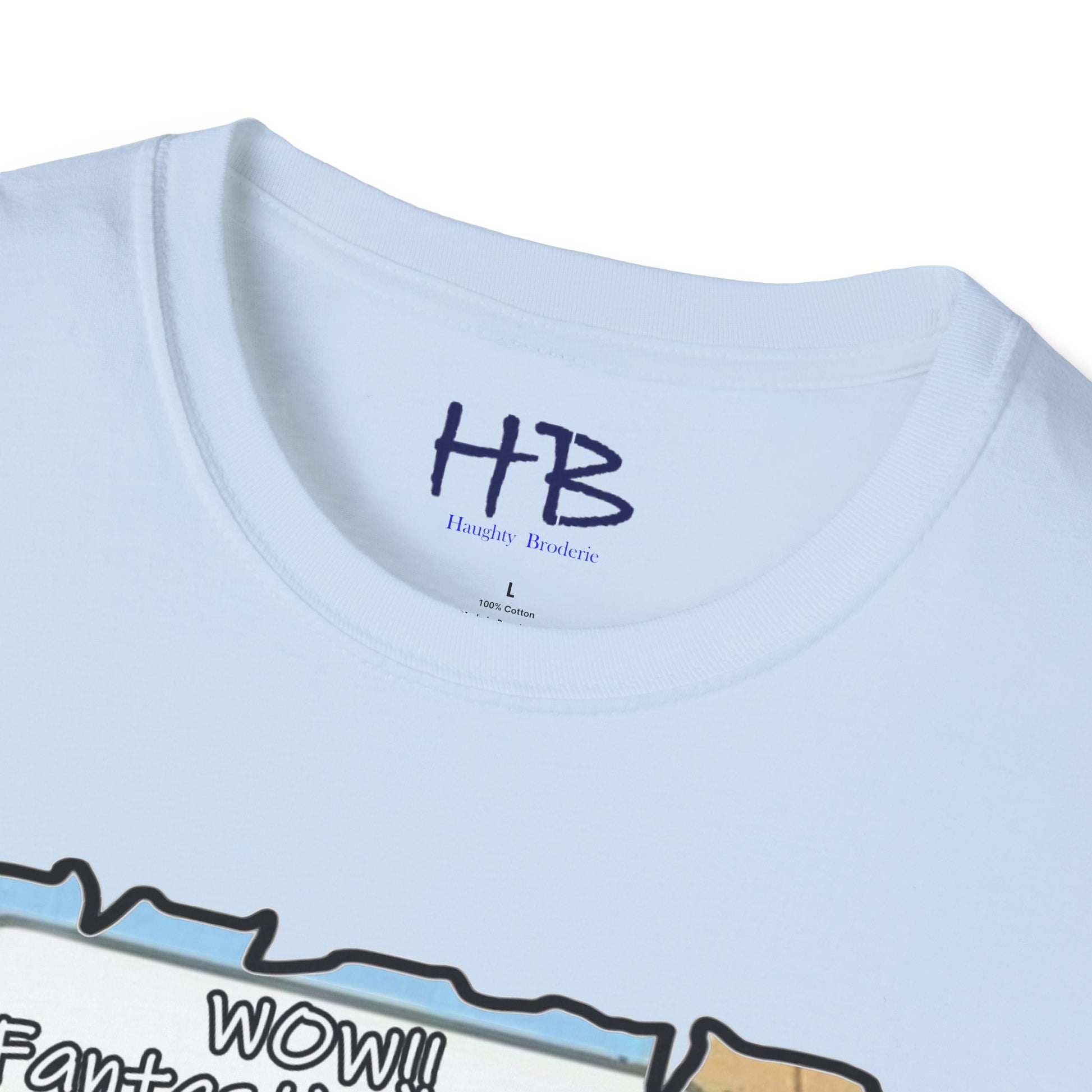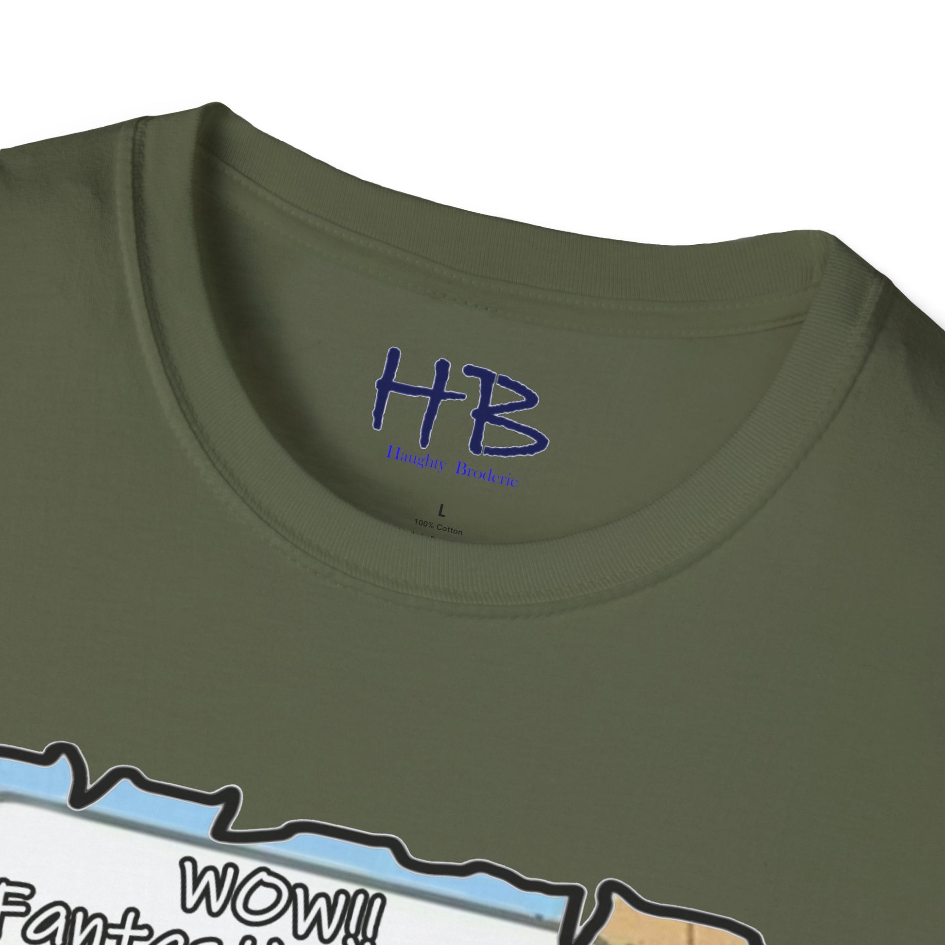 Introducing our latest creation – a wearable masterpiece that encapsulates the essence of humor and modern-day quirks. Behold the captivating tee shirt featuring a delightful illustration of a man standing atop a precarious piece of cliff, oblivious to the imminent descent. As he peers into the viewfinder of his camera, the world around him slips away, and his exclamatory dialogue, "WOW!!! Fantastic camera with auto-zoom!!," echoes his misplaced focus.